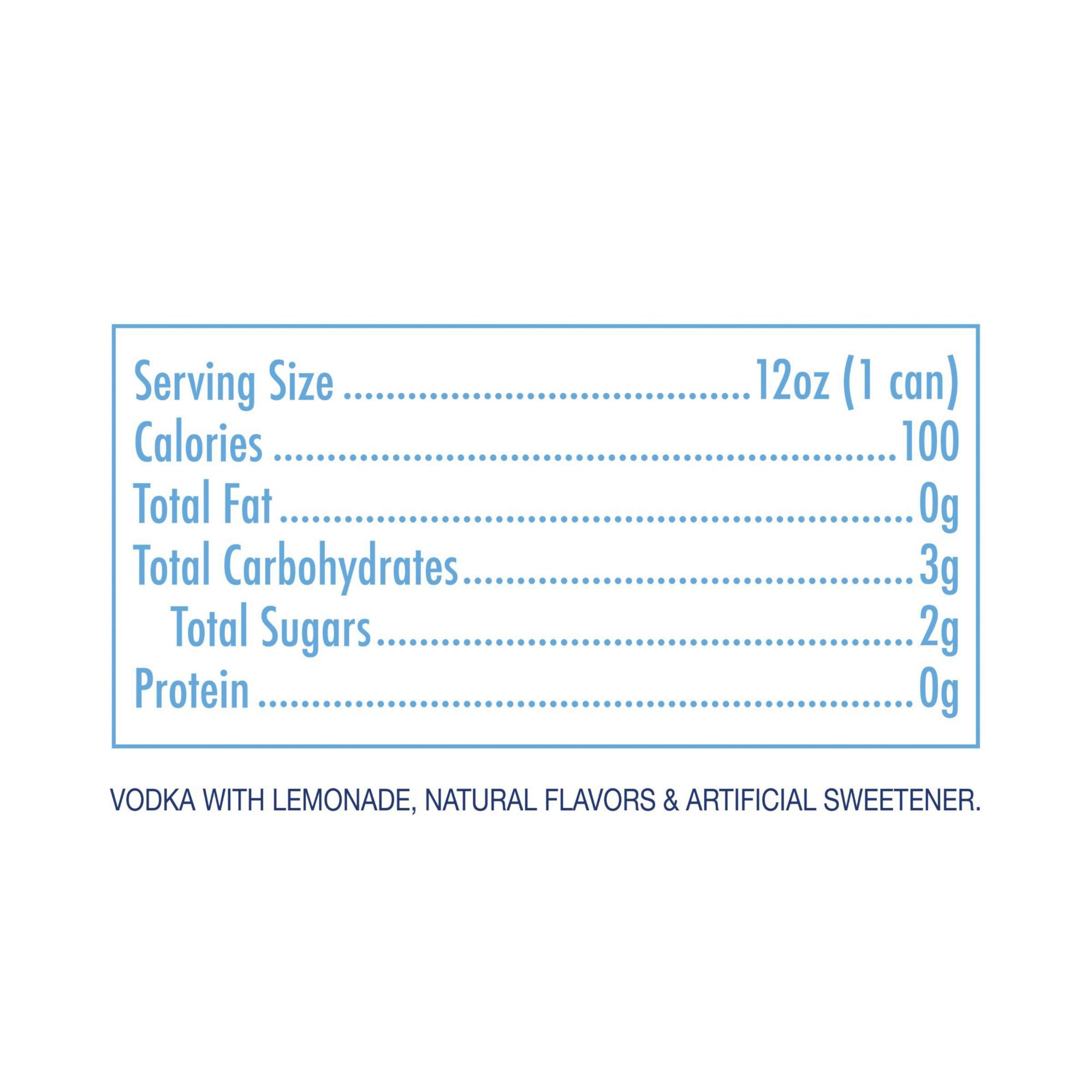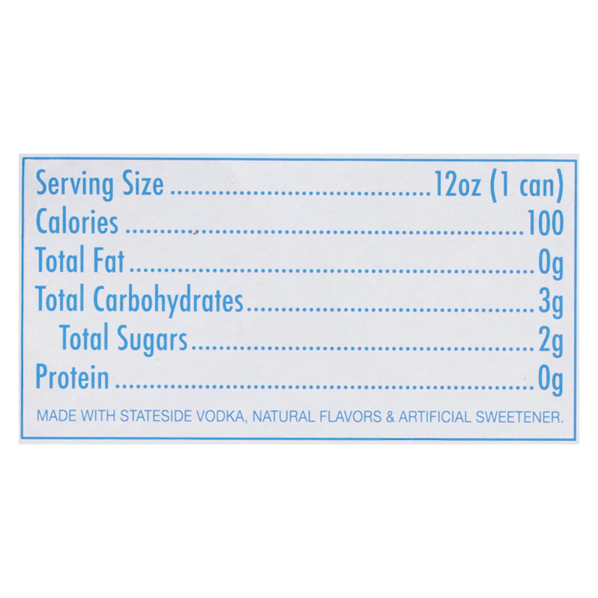 Ingredients: Raspberry: Made with Stateside Vodka, Natural Flavors & Artificial Sweetener. Lemonade: Made with Stateside Vodka, Natural Flavors & Artificial Sweetener. Strawberry: Made with Stateside Vodka, Natural Flavors & Artificial Sweetener. Black Cherry: Made with Stateside Vodka, Natural Flavors & Artificial Sweetener.