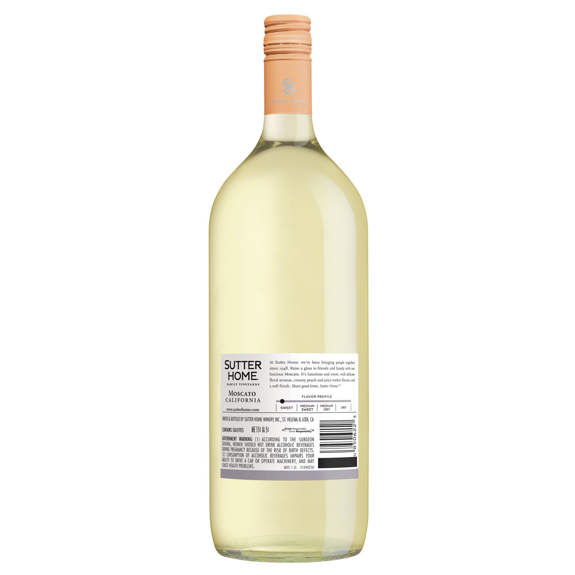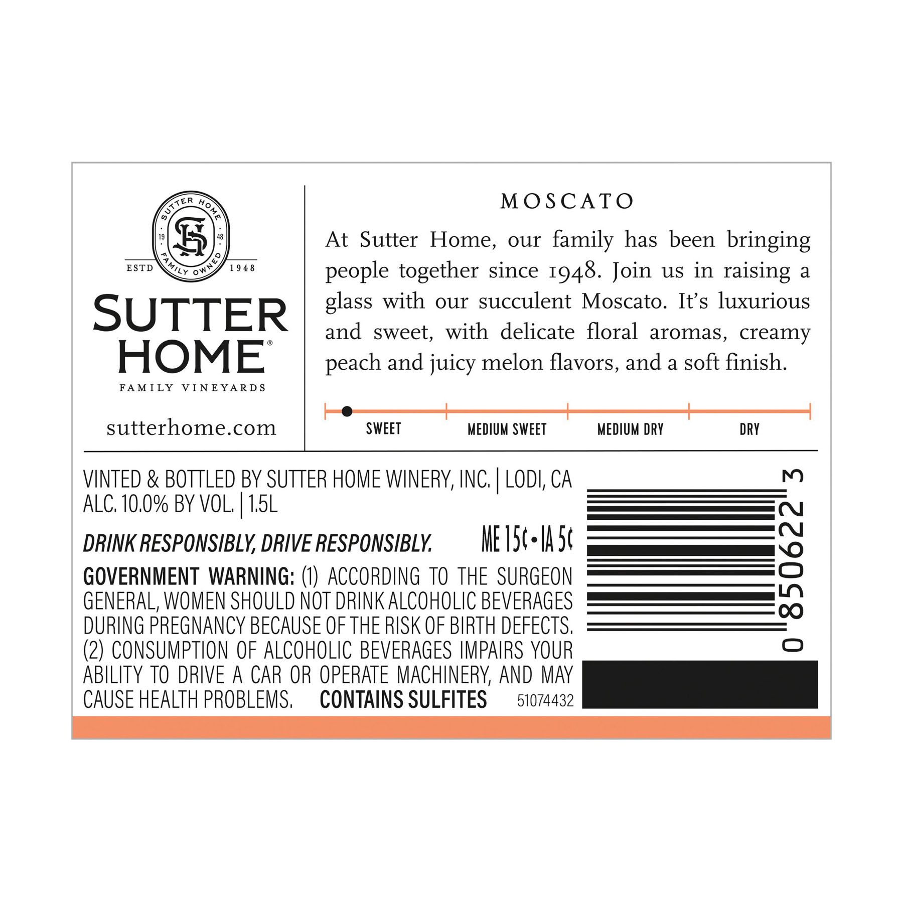 Sutter Home Moscato Wine is a sweet, creamy, luxurious wine. Delicate aromas of white peaches and exotic lychee on the nose lead to creamy peach and juicy melon flavors with hints of caramel on the palate. Refreshing acidity and a vivid, crisp finish balance the luxuriously sweet flavors. Sutter Home Wine has been awarded Reserve Class Champion, Double Gold - 2019 Houston Livestock & Rodeo and Best of Class - 2019 San Francisco International and 90 points - Gold from 2020 San Diego International. As you gather around the table this holiday season, enjoy Sutter Home wine in your favorite wine glasses with mashed potatoes, chicken, turkey, stuffing and all the pumpkin and apple pies. Or get cozy around the fireplace and warm up while enjoying a glass of wine. Sutter Home wines is the perfect holiday gift. Whether you gift wine as a stocking stuffer, to your neighbor across the street, or serve at your own holiday table. Sutter Home wines are a great addition to holiday wine gift sets! Sutter Home, family owned since 1948, is the brand generations of wine lovers trust to deliver consistent, award-winning quality and value for every wine occasion.