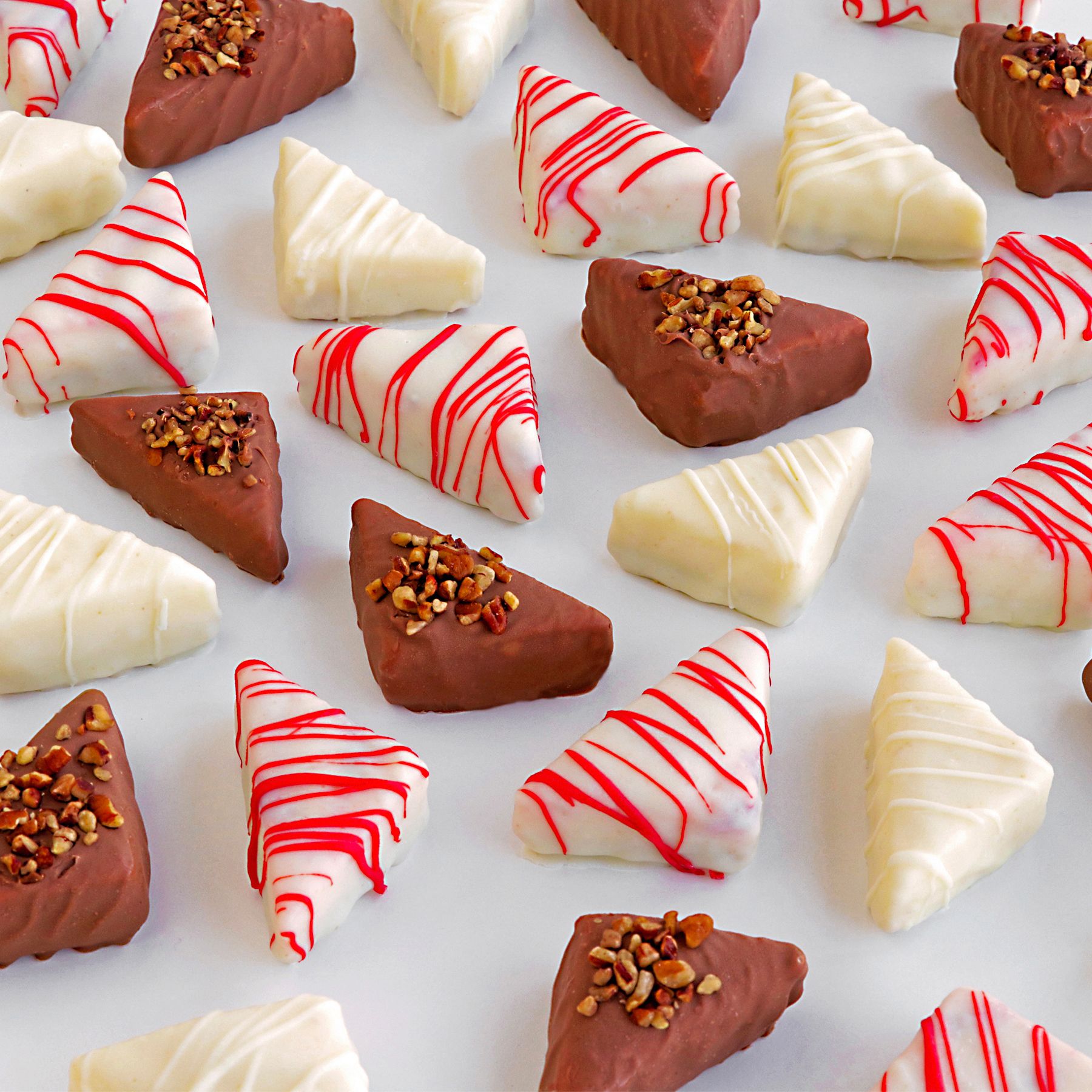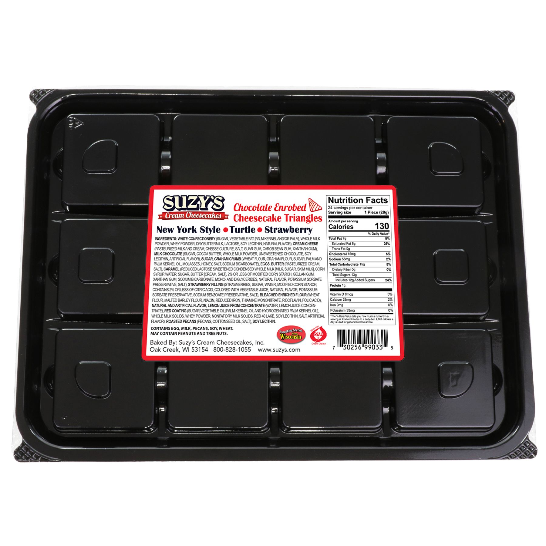 Suzy's Cheesecake Triangles feature three varieties of cheesecake treats, cut into 24 bite-sized pieces. The chocolate-enrobed cheesecake triangles are in New York Style, Turtle, and Strawberry flavors. This ready-made dessert tray is perfect for birthday parties and other celebrations.