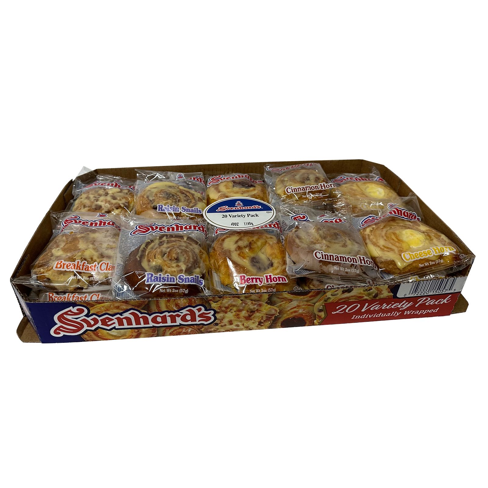 Svenhard's Scandinavian Pastries Variety Pack contains a delectable assortment of breakfast claws, raisin snails, berry, cheese, and cinnamon pastries. Svenhard's is one of the iconic pastries of choice across the US, baked in the form of claws, horns and snails. Tthey're great for families, events, camping and more. Individually wrapped singles are perfect for breakfast on-the-go, and fantastic to include in work or school lunch for loved ones. Svenhard's Premium Artisan Scandinavian Pastries make a decadent treat with coffee or other beverage, try them warmed for an extra special experience.