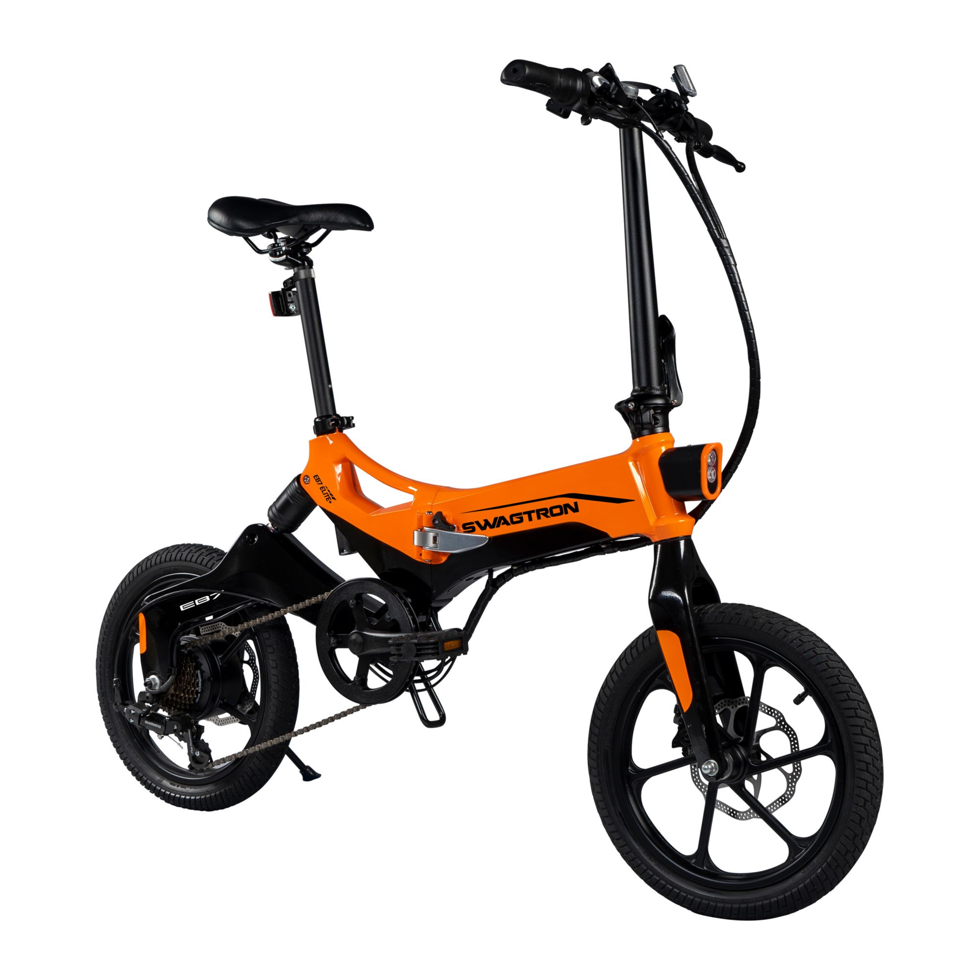 Gear Up with Shimano 7-Speed S.I.S: conquer hills like a boss with this commuter eBike's seven-speed Shimano index shifting for the reliable precision and ride control that every cyclist craves High-Performance and Extended Mileage: upgraded with 23% more power, this pedal-assist bike has a throttle-only range up to 19 miles on a single charge with the capacity to cruise up to 18.6mph and conquer 25° inclines Extra Power on Demand: swappable 36V Li-ion battery fully charges in 3-4 hours Grab an extra battery (sold separately) and keep it as a spare whenever you need it A key-secured compartment keeps the battery locked and protected from dust and splashes Rugged, Smooth and Steadfast: with 16" wheels and enhanced rear suspension, this electric commuter bike handles rough rides beautifully Add the dual-disc brakes and you have the superior stopping power you can rely on Includes Swagtron EB7 Elite Plus eBike, charging cable and adapter, two keys, and user manual