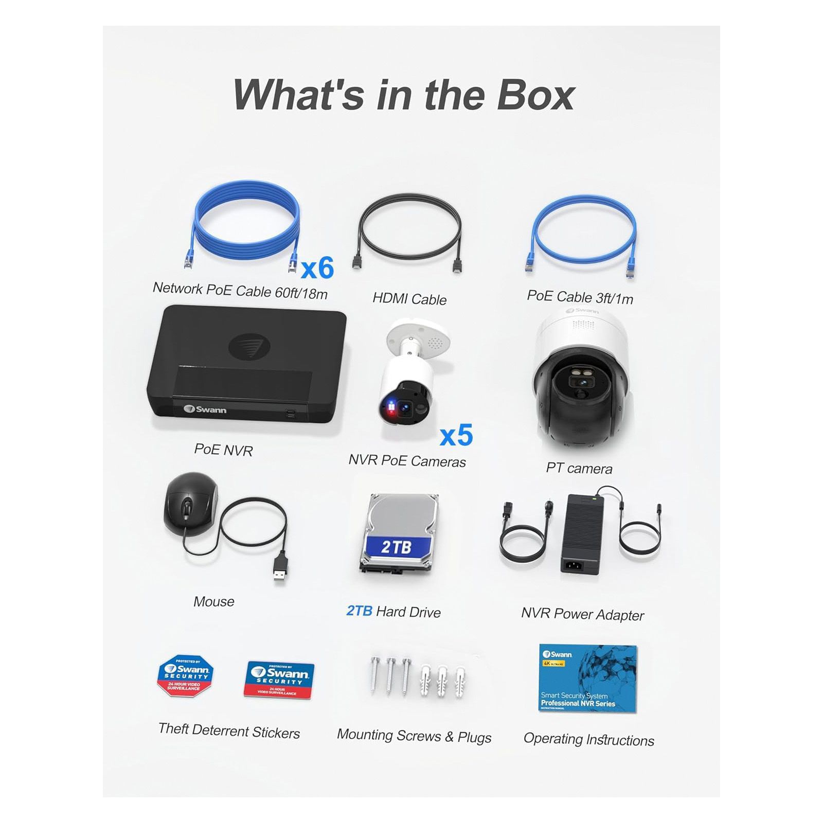 Includes 8 channel NVR with 2TB hard drive (installed), 6K/12mp professional bullet cameras x 5 and 1 x 4K pro-pan-tilt camera, HDMI cable, ethernet cable x 7 (60' / 18m x 8 and 3' / 1m x 1), mouse, power adapter, mounting screws & plugs, operating instructions, theft deterrent stickers