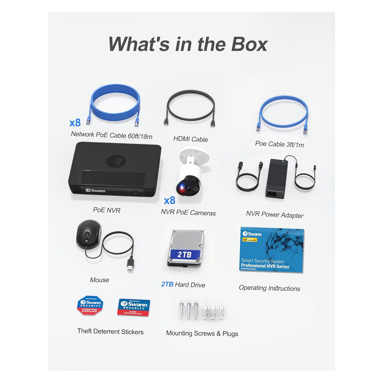 Includes 16 channel NVR with 2TB hard drive (installed), 4k professional bullet cameras x 8, HDMI cable, ethernet cable x 9 (60'/18m x 8 and 3'/1m x 1), mouse, power adapter, mounting, screws and plugs, operating instructions, theft deterrent stickers