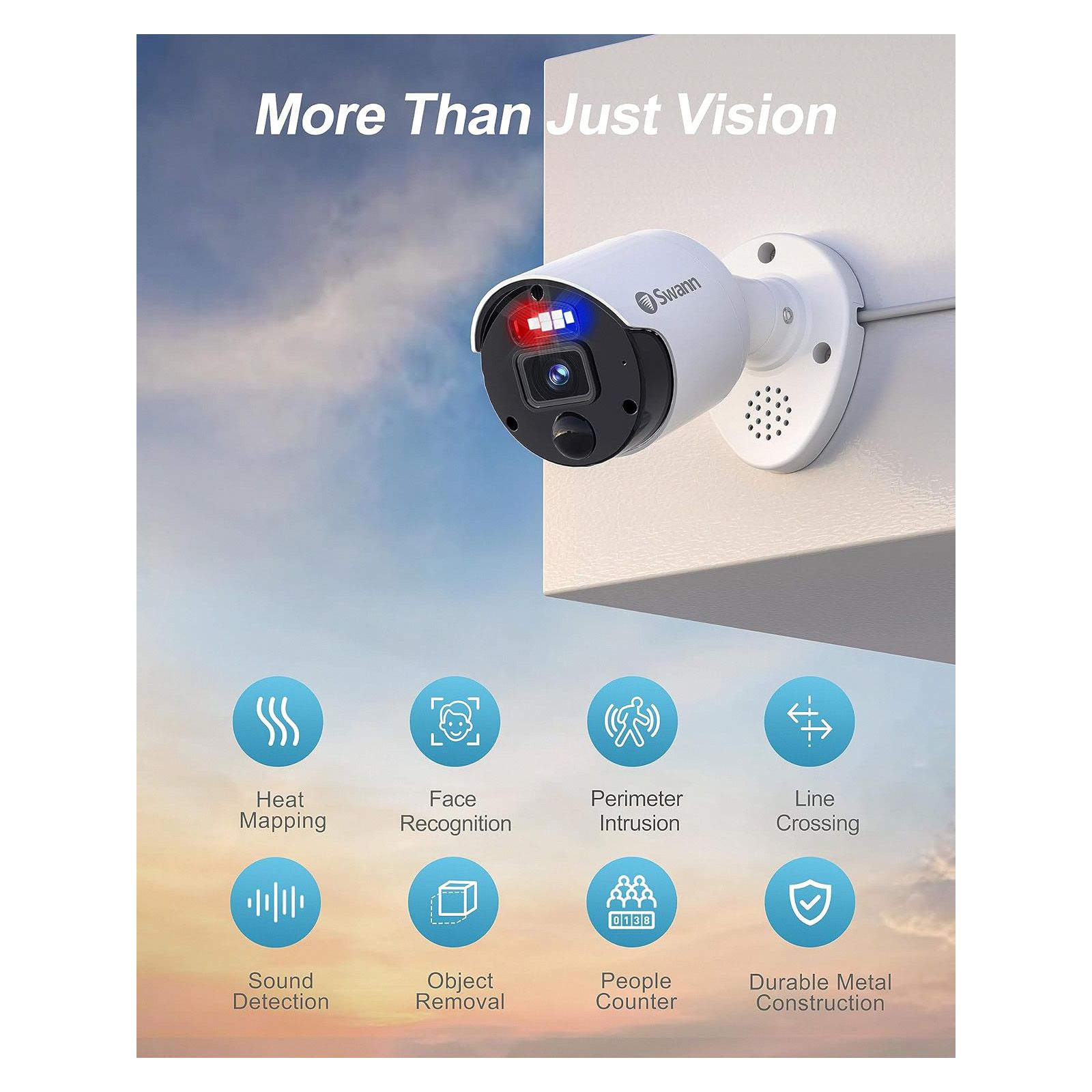 With the latest surveillance tech such as night vision, motion detection recording, and smartphone integration, the Swann Pro-Series NVR security system is packed with features. See fine details essential for evidence with 4K display resolution with powerful digital zoom to watch over entrances, yards, driveways, parking lots, shop floors, storerooms, and more. Analytics is available for homes and small businesses such as object movement, line crossing, heat mapping, and more.