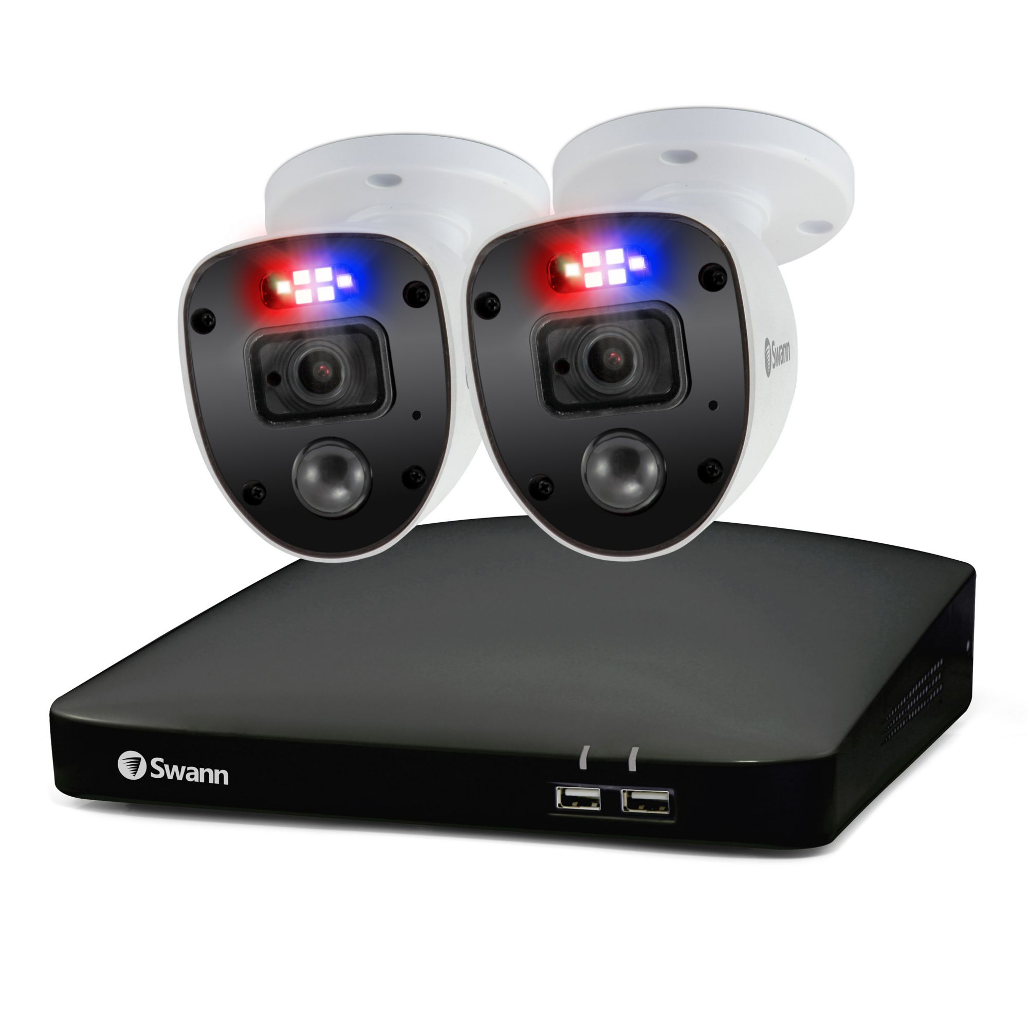 Affordable entry level 1080p video security 4-channel DVR with two Enforcer bullet cameras Prevent crime with Sensor Warning Light 1080p cameras Free local recording to 1TB HDD and Dropbox backup Native Hey Google and Alexa integrations Combine DVRs and wireless cameras using Swann Security app ecosystem Includes 4-channel 1080p DVR, two SWPRO-1080SL Enforcer bullet cameras, two 60' BNC cables, Ethernet cable, HDMI cable, Power adapter and splitter, quick start guide, and mounting screws Warranty: 1 year