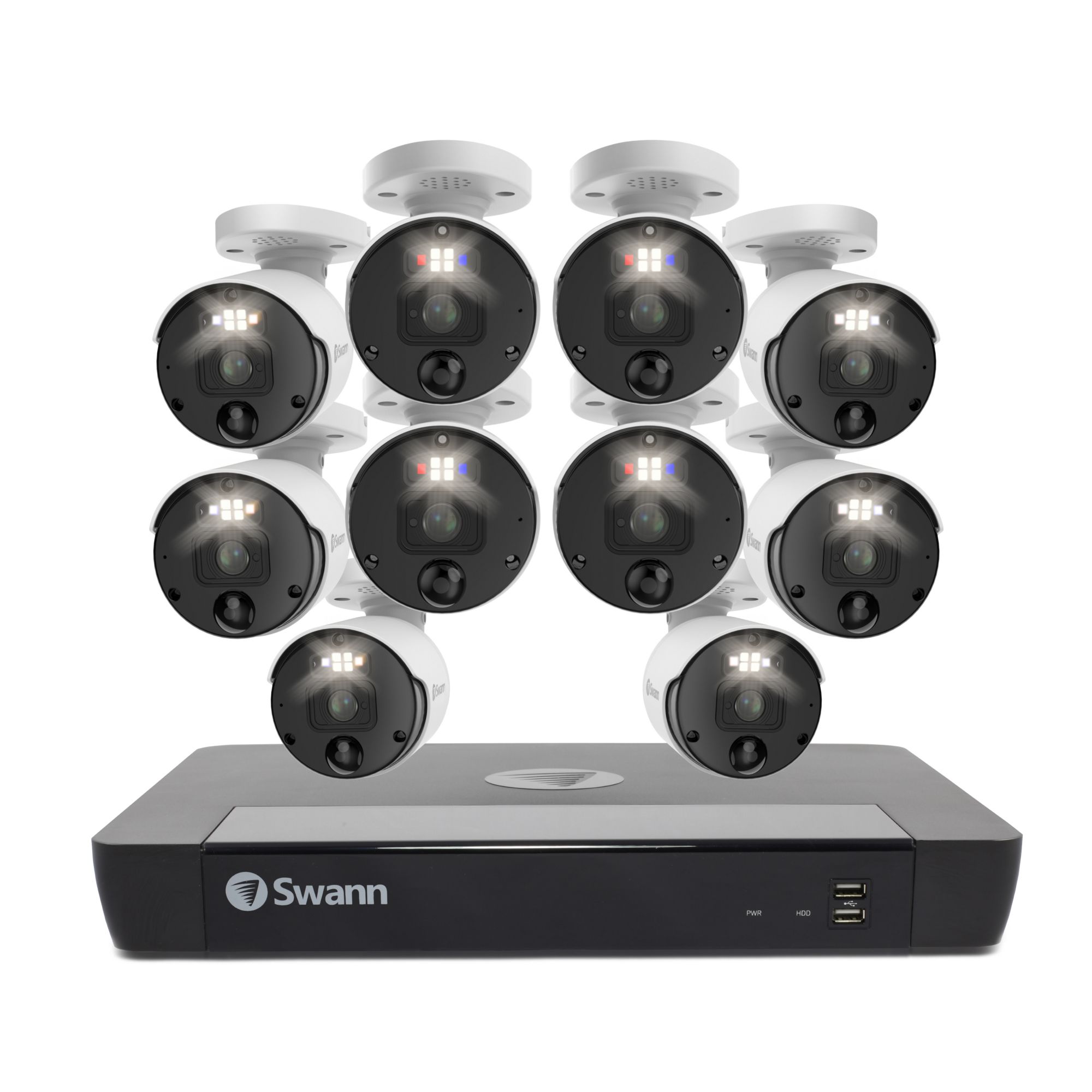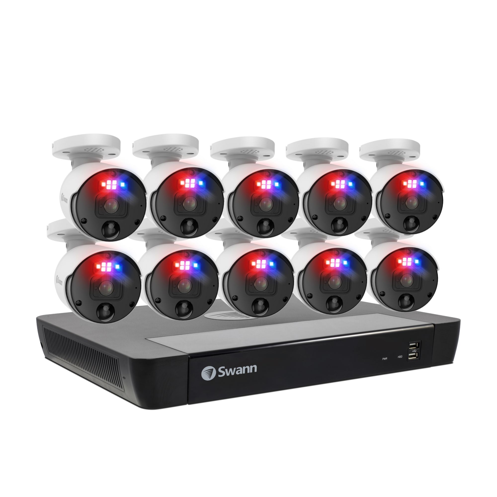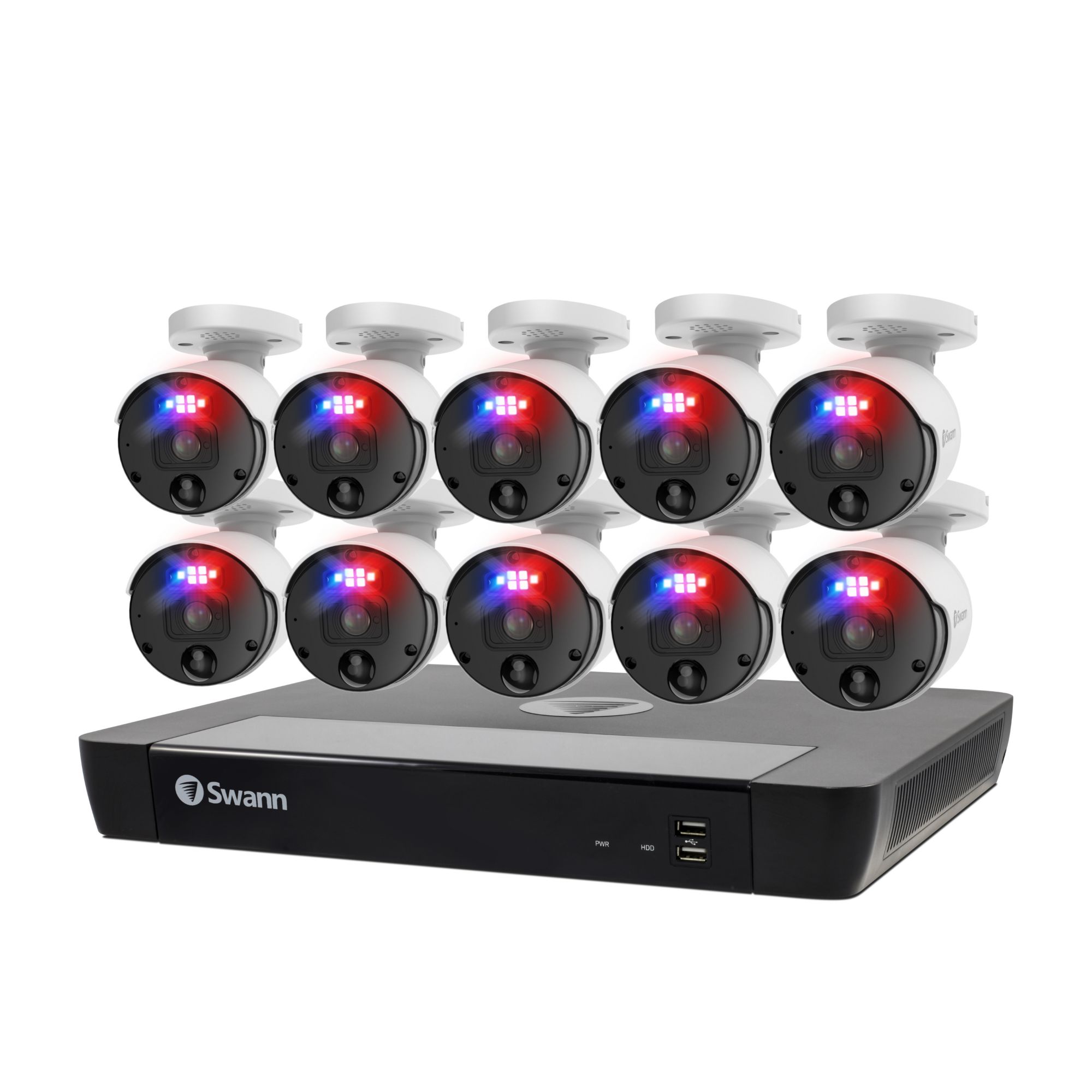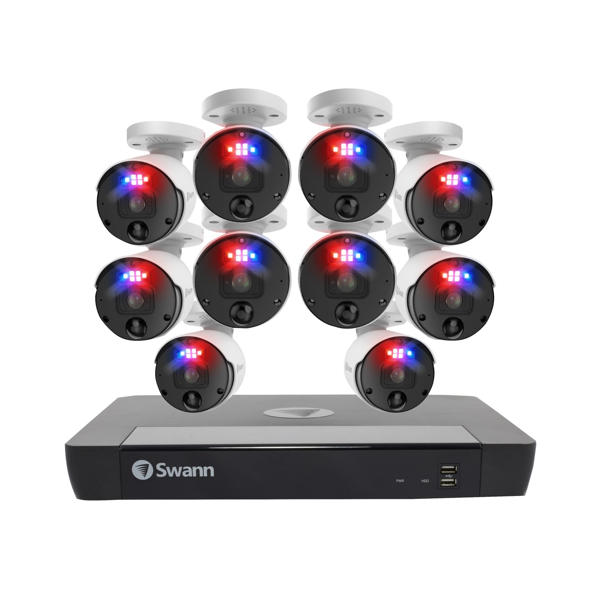 Featuring SwannForce red and blue flashing lights, spotlights and sirens, this Swann Professional NVR security system redefines crime prevention. See incredible details via 6K mega HD video, and watch live on your phone or TV. With color night vision, heat and motion detection in weatherproof bullet cameras, the professional NVR is the ultimate security solution. Its security made smarter and fee free.