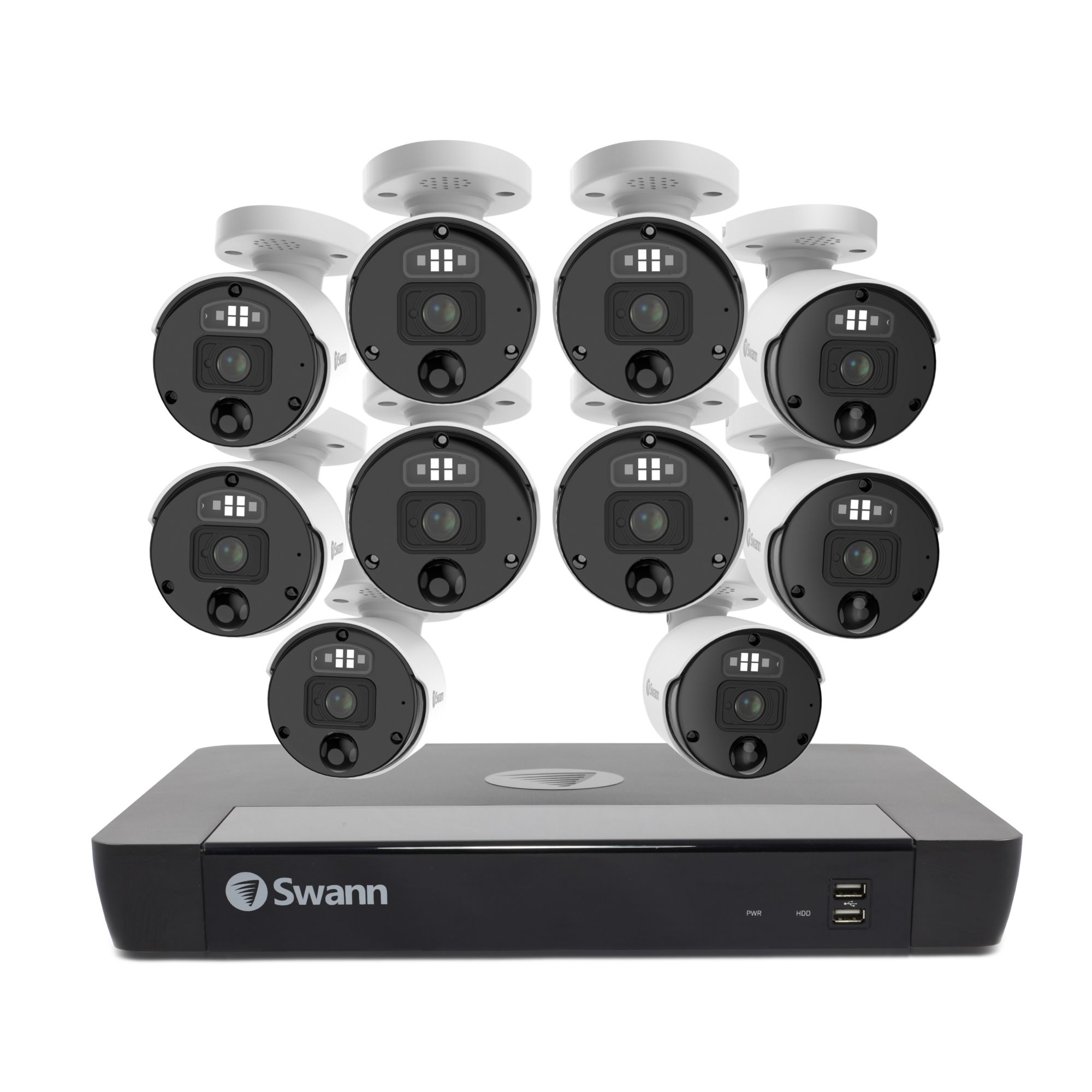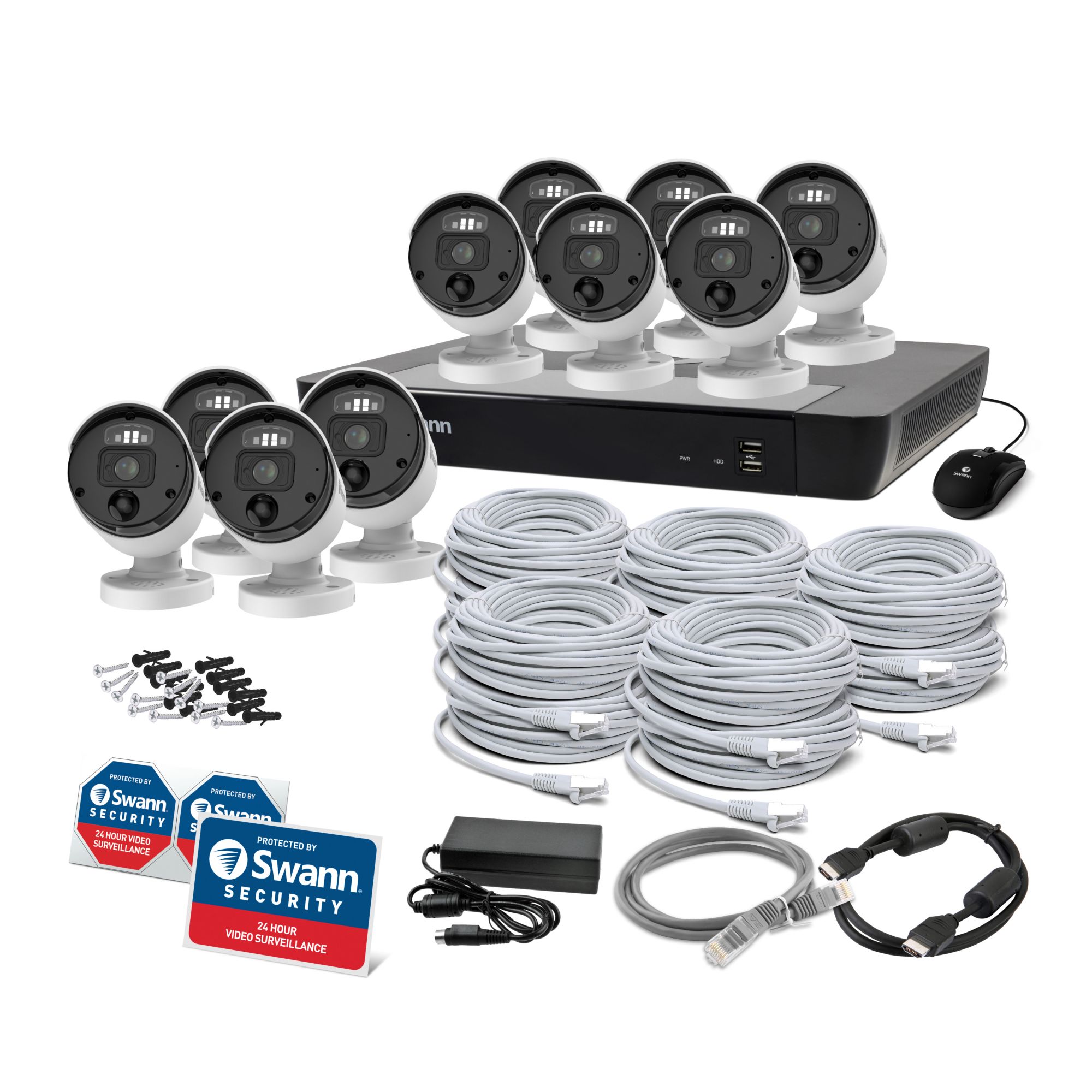 Includes NVR16-8580, (10) 6K SwannForce cameras, 11 ethernet cables, HDMI cable, power adapter and splitter, mouse, mounting hardware and quick start guide