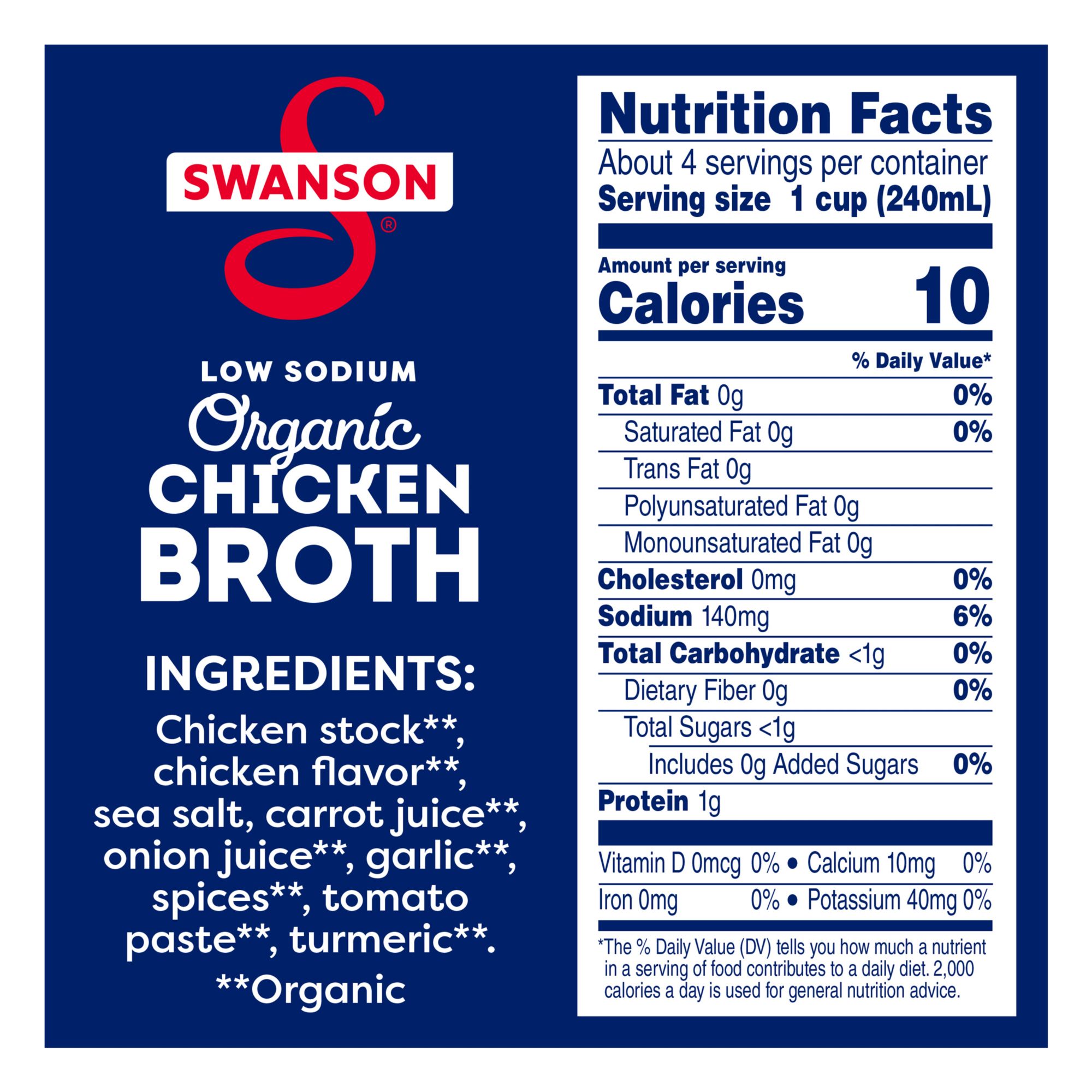 Elevate your homemade meals with the rich, full-bodied flavor of Swanson 100% Natural Low Sodium Organic Chicken Broth. Swanson Organic Chicken Broth brings together the perfectly balanced flavors of organic free-range chicken and vegetables picked at the peak of freshness. And just like homemade, their organic broth uses only 100% natural, non-GMO ingredients, with no MSG, no artificial flavors or colors, and no preservatives. More convenient than chicken bouillon, this fat-free, gluten-free chicken broth is a versatile ingredient for your everyday cooking, adding flavor and moisture to both entrees and side dishes. Its clean, true taste makes it great as a soup base, and it can be used instead of water to boost rich flavor in rice, pasta and veggies. Swanson Chicken Broth is a must-have for your holiday cooking, bringing richer, elevated homemade flavor to mashed potatoes, stuffing and more. It’s not just any broth. It’s Swanson.