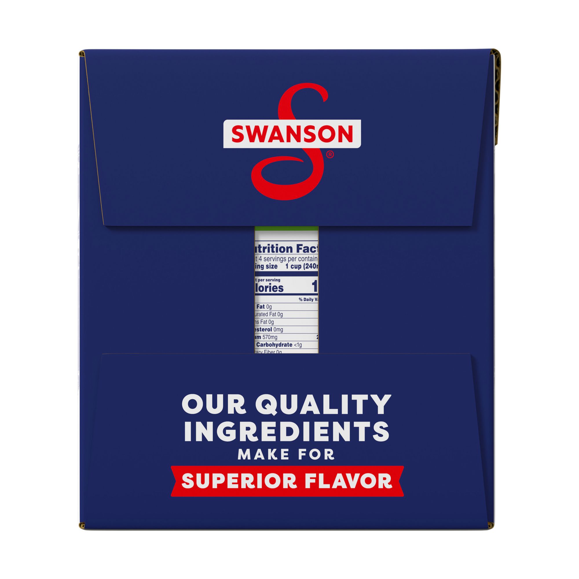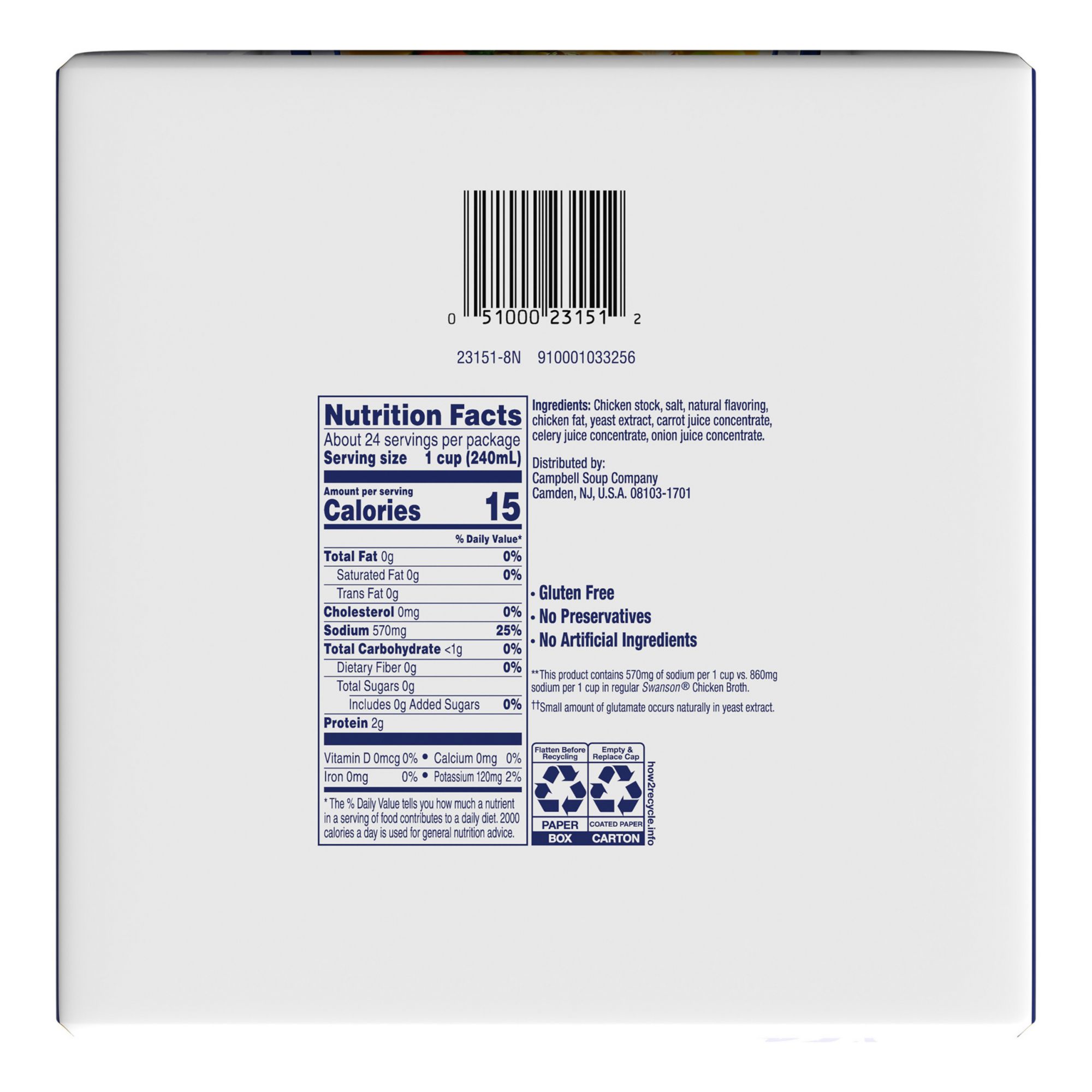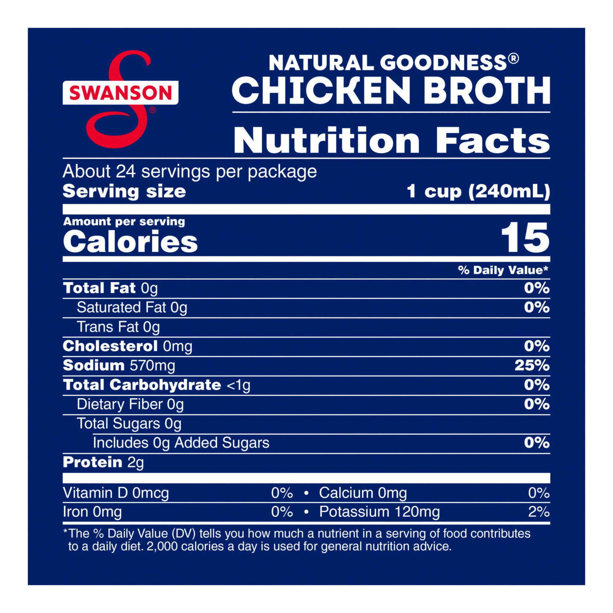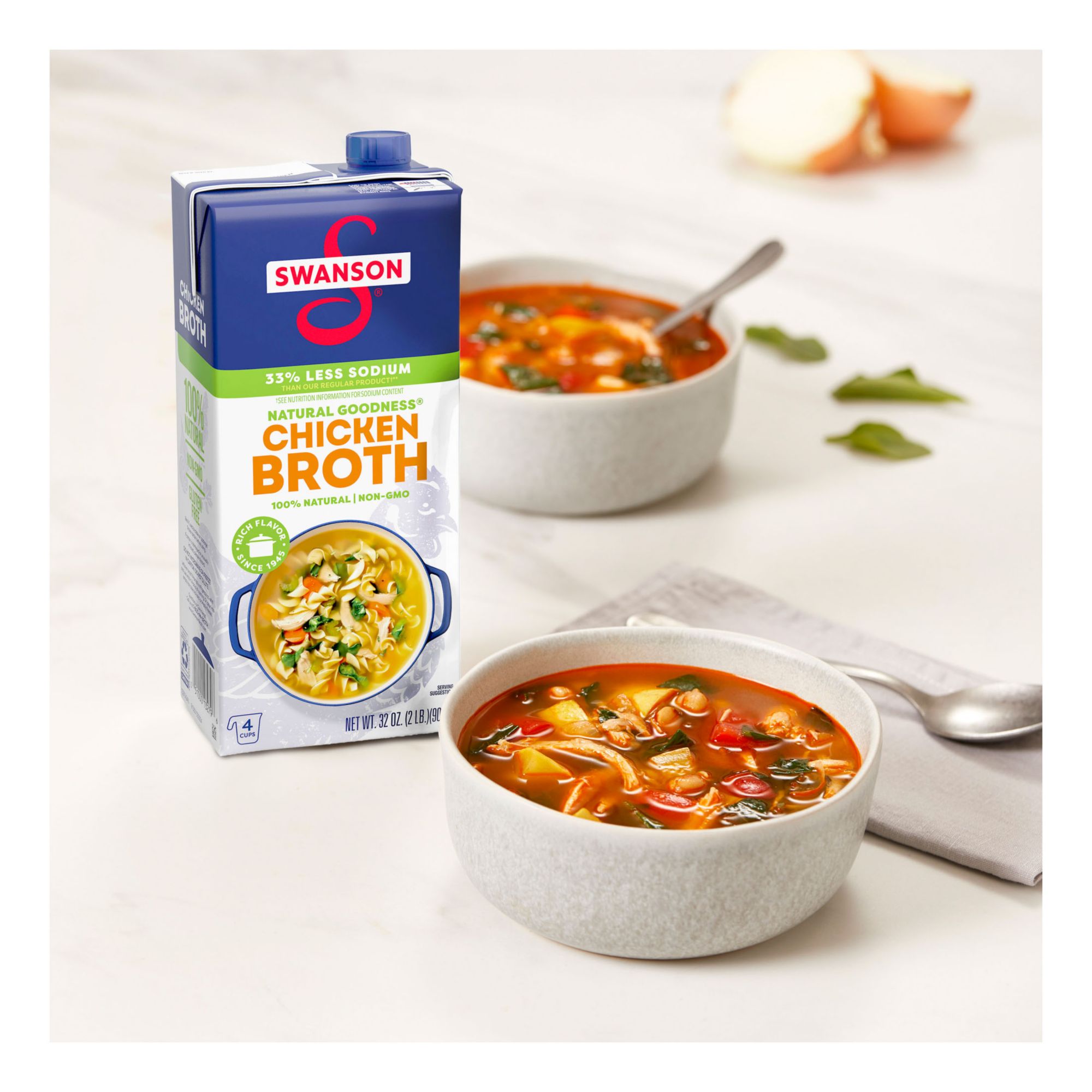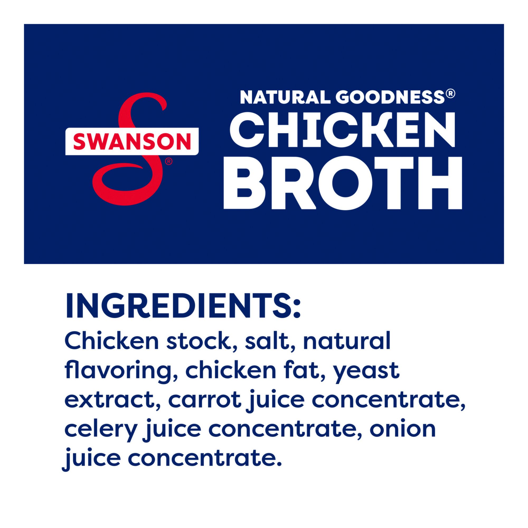 Elevate your homemade meals with the rich, full-bodied flavor of Swanson Natural Goodness Lower Sodium* Chicken Broth, featuring 33% less sodium than our regular product. Swanson Natural Goodness Chicken Broth brings together the perfectly balanced flavors of farm-raised chicken and vegetables picked at the peak of freshness. And just like homemade, this broth uses only 100% natural, non-GMO ingredients, with no MSG added,** no artificial flavors or colors, and no preservatives. More convenient than chicken bouillon, this gluten-free chicken broth is a versatile ingredient for your everyday cooking, adding flavor and moisture to both entrees and side dishes. It’s great as a soup base, and it can be used instead of water to boost rich flavor in rice, pasta and veggies. Swanson Chicken Broth is a must-have for your holiday cooking, bringing richer, elevated homemade flavor to mashed potatoes, stuffing and more. It’s not just any broth. It’s Swanson. (*Contains 570mg sodium per serving vs. 860mg sodium per serving of regular Swanson Chicken Broth. **Glutamate occurs naturally in ingredients in this product.)