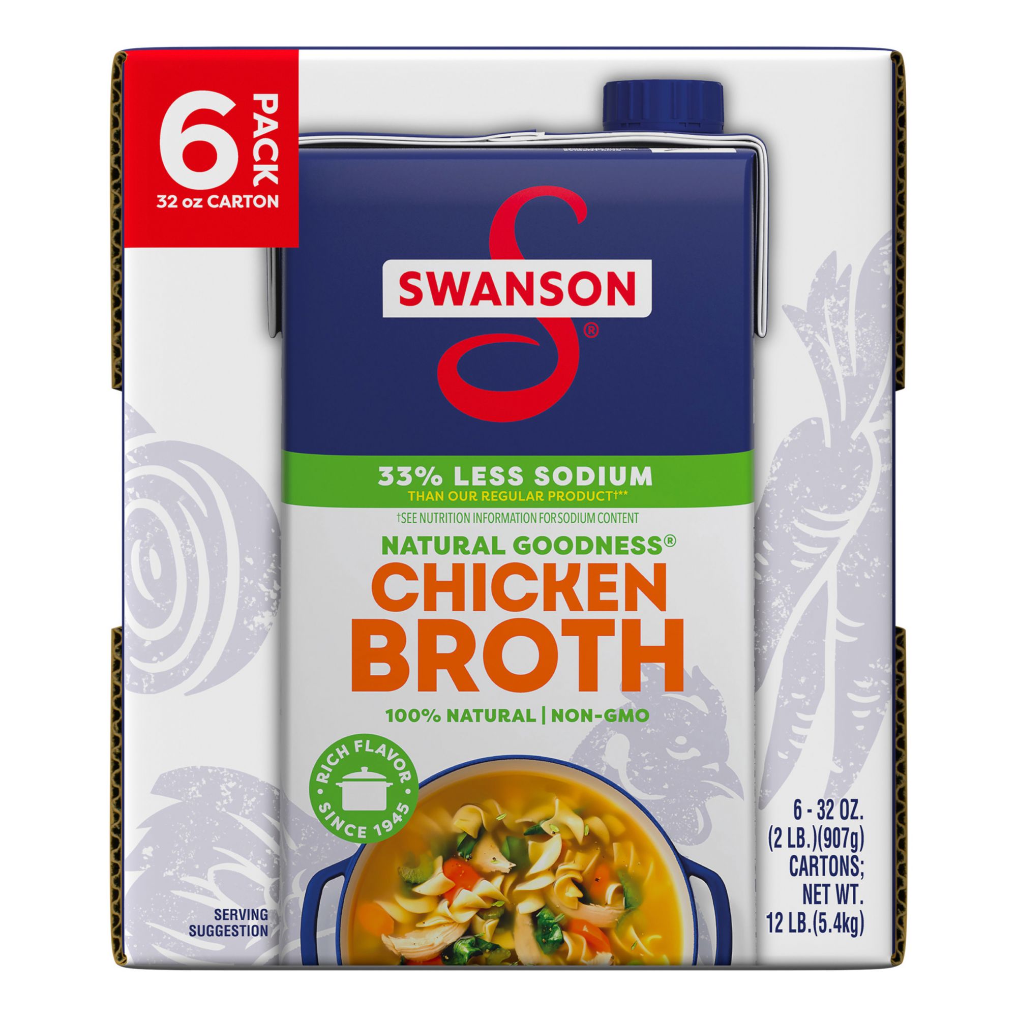 Six (6) 32 oz. recyclable cartons of Swanson Natural Goodness lower sodium* chicken broth (*contains 570mg sodium per serving vs. 860mg sodium per serving of regular Swanson chicken broth)
