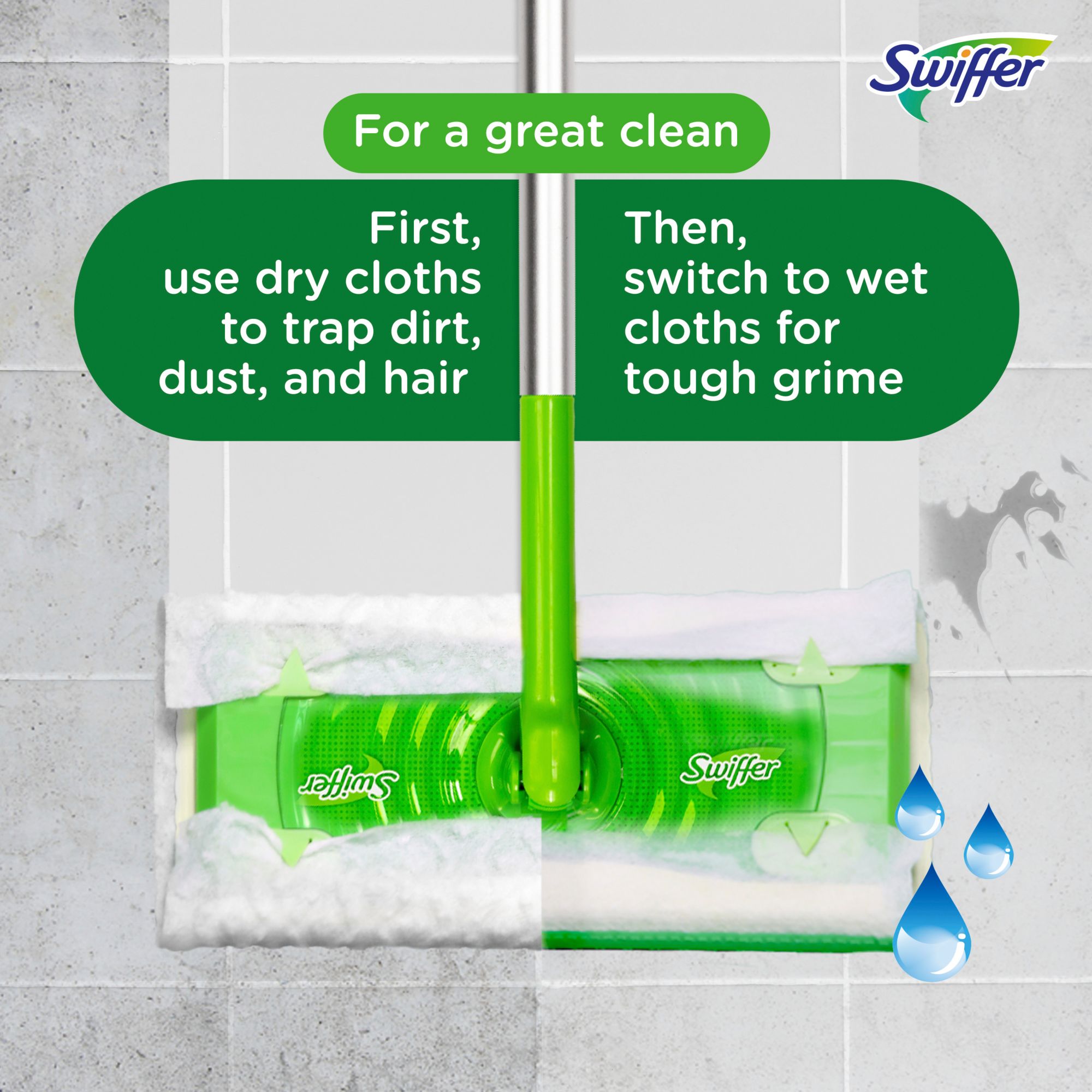 Add versatility to your cleaning routine with Sweeper. This 2-in-1 tool is a combination of both a broom and a mop, no dustpan or bucket needed! Use Dry Sweeping Cloths to TRAP + LOCK dirt, dust & hair, and Wet Mopping Cloths to dissolve dirt and grime. Safe for use on all hard sealed surfaces. Do not use on unfinished floors, oiled or waxed wooden boards, non-sealed tiles or carpeted floors because they may be water sensitive. Great for bathrooms and small living spaces like apartments and dorm rooms Assembling your Sweeper is easy! Simply click the poles together. Wrap the cloth under the Sweeper head and poke the flaps into each corner gripper to keep it in place. Buy Swiffer worry-free. If you're not completely satisfied, check out their money-back guarantee. Starter Kit includes 1 Sweeper, 9 Dry Sweeping Cloths and 6 Wet Mopping Cloths