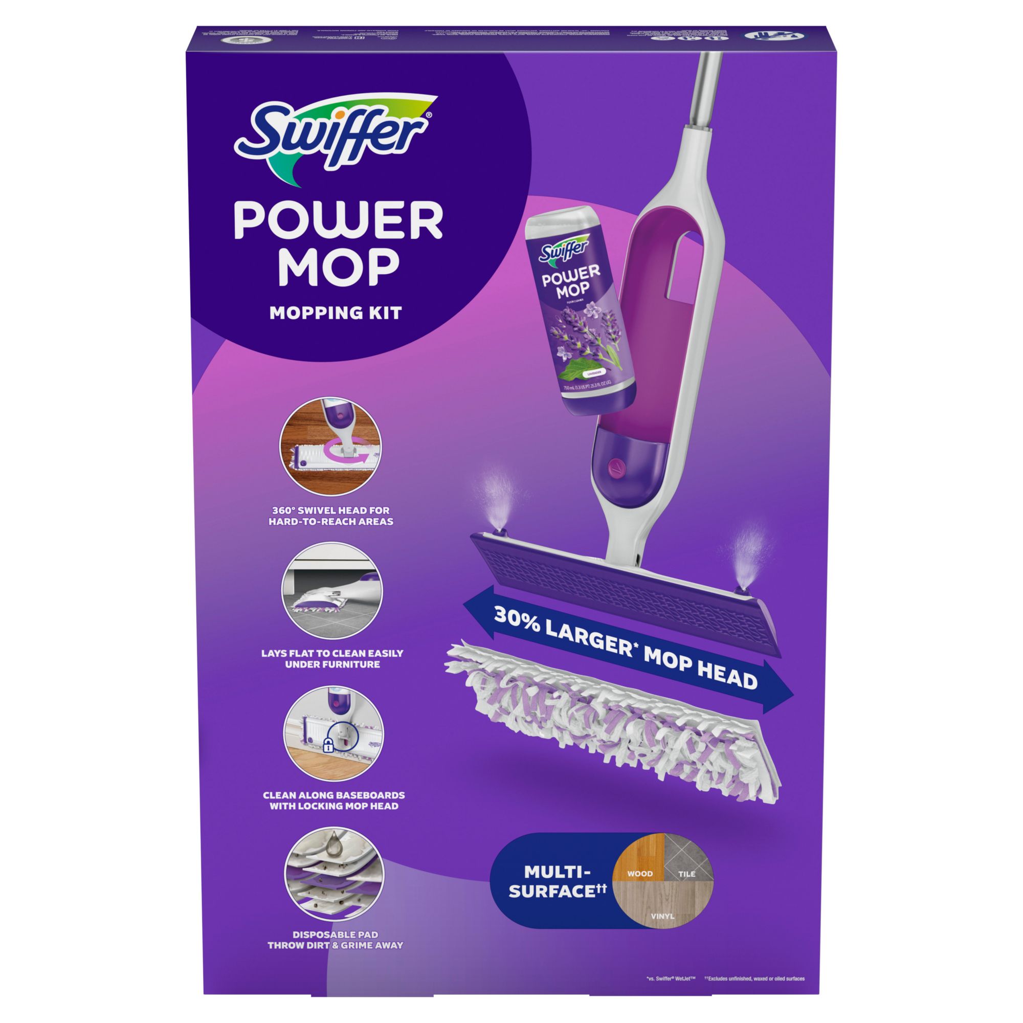 Buy Swiffer PowerMop worry-free. If you're not completely satisfied, check out their money-back guarantee. Kit Includes: PowerMop Spray Mop, 10 Mop Pad Refills, 2 Floor Cleaning Solutions with Lavender Scent, and 2 batteries