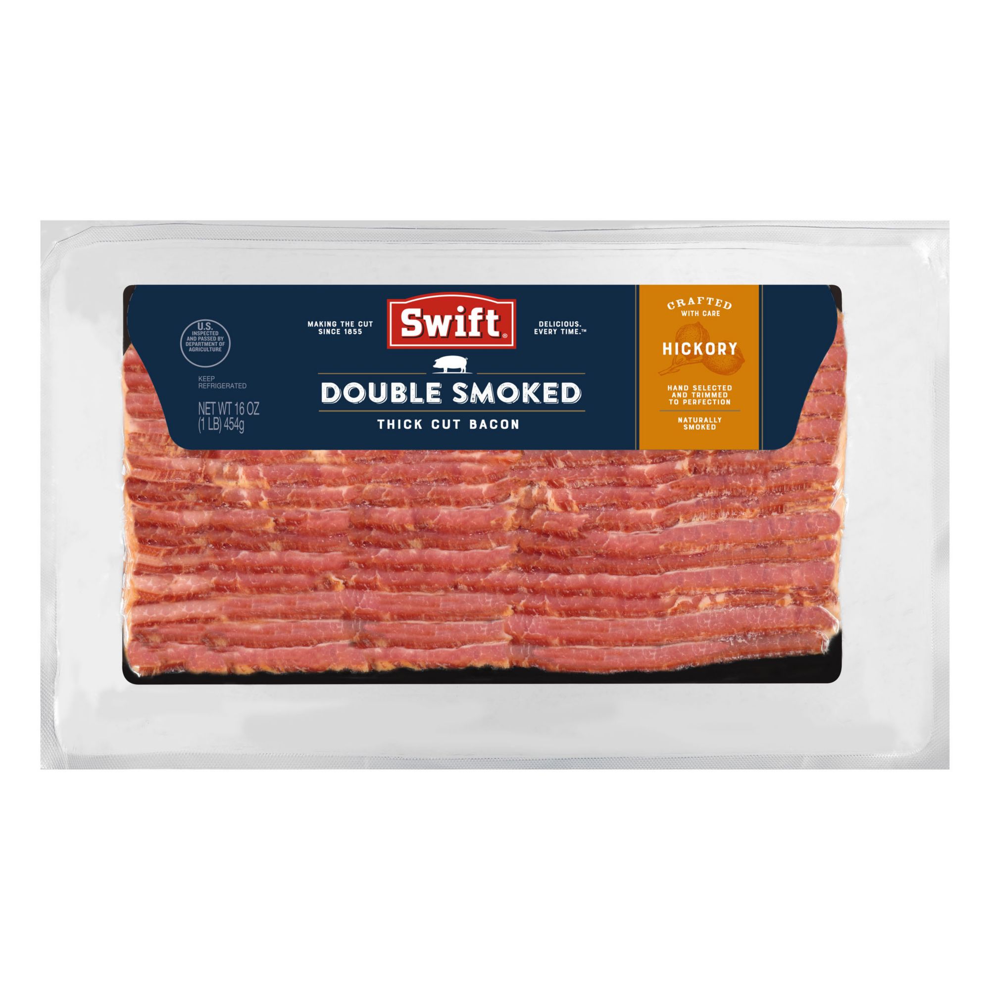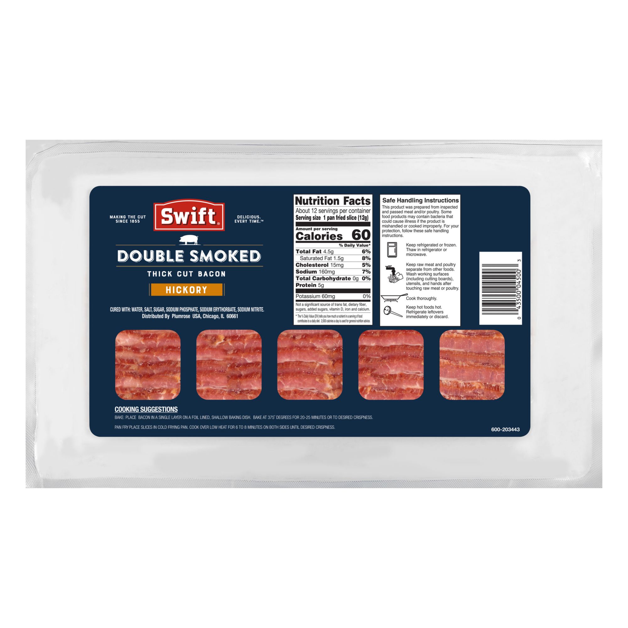Swift Double Smoked Thick Cut Bacon is smoked not once, but twice, to give it an extraordinarily savory flavor that enhances the taste of any meal. The true quality of the cut of bacon is revealed through the double smoked process. Swift bacon is a high-quality experience revealed by the double smoking process combined with consumer favorite flavors; double smoked lends itself to quality AND taste. Trust no one but Swift to make it delicious, every time. They have been creating the highest quality pork products since 1855. Oven cooking instructions: Place bacon in single layer on foil lined, shallow baking pan. Bake at 375 degrees Fahrenheit for 20-25 minutes or to desired crispiness. Enjoy!