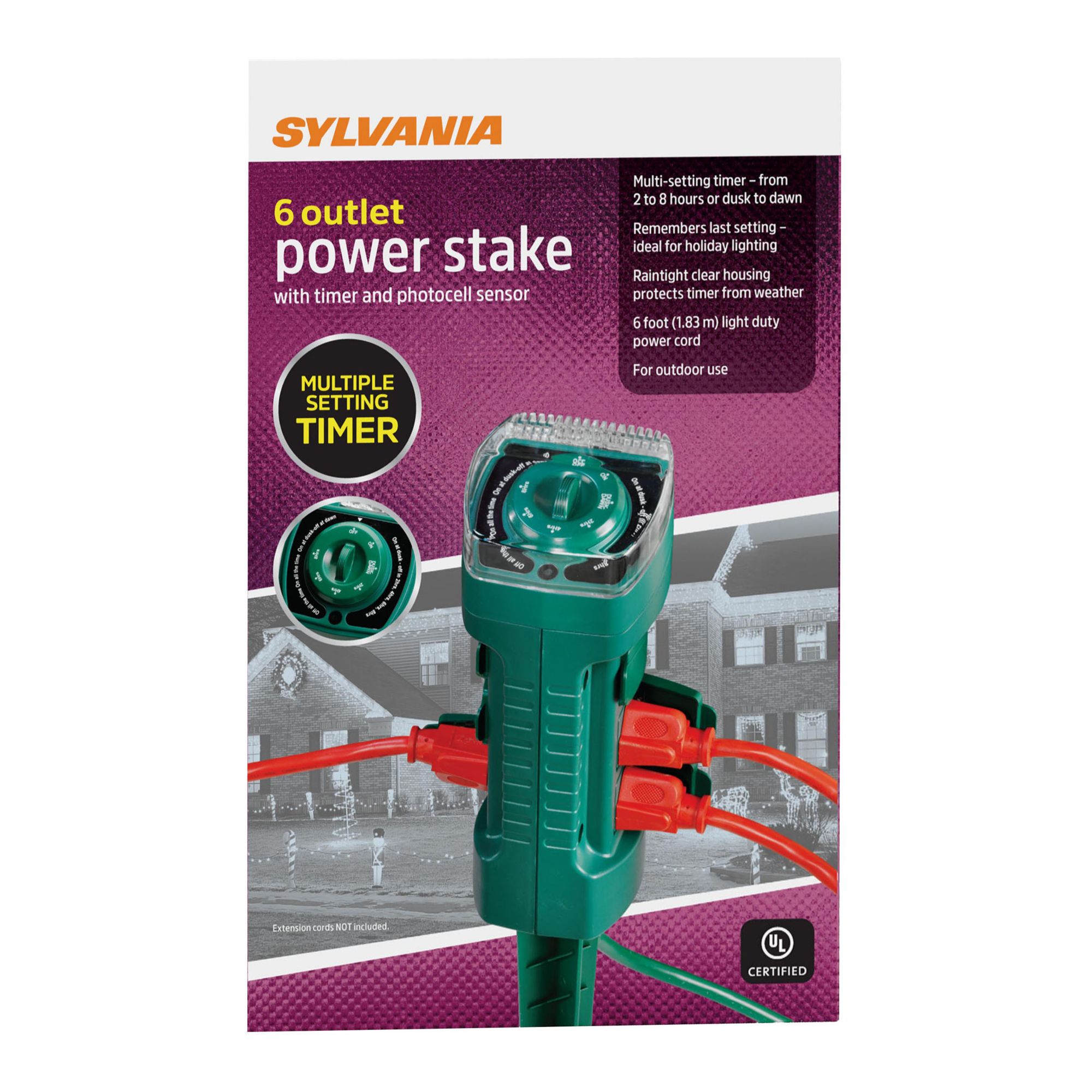 Features timer and photocell sensor Multi-setting timer from 2 to 8 hours or dusk to dawn Remembers last setting, ideal for holiday lighting Rain-tight clear housing protects timer from weather 6' light duty power cord Multiple timer settings For outdoor use UL-Listed Includes 6-outlet power stake with timer