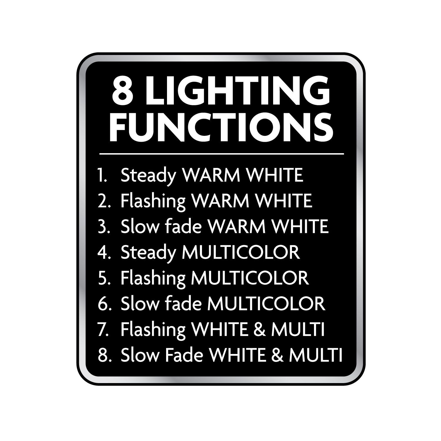 - Lighting options: Steady Warm White, Flashing Warm White, Slow Fade Warm White, Steady Multicolor, Flashing Multicolor, Slow Fade Multicolor, Flashing White and Multicolor, and Slow Fade White and Multicolor