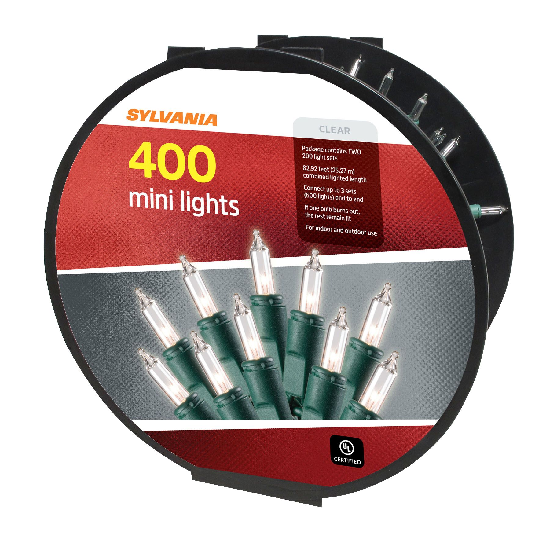 Illuminate your home this holiday season with clear mini lights from Sylvania. This pair of 200-count mini light sets has premium lighting to ensure the remaining lights will stay lit even if a bulb becomes loose, burned out, broken or missing. Connect up to 3 sets end to end for an impressive light display.