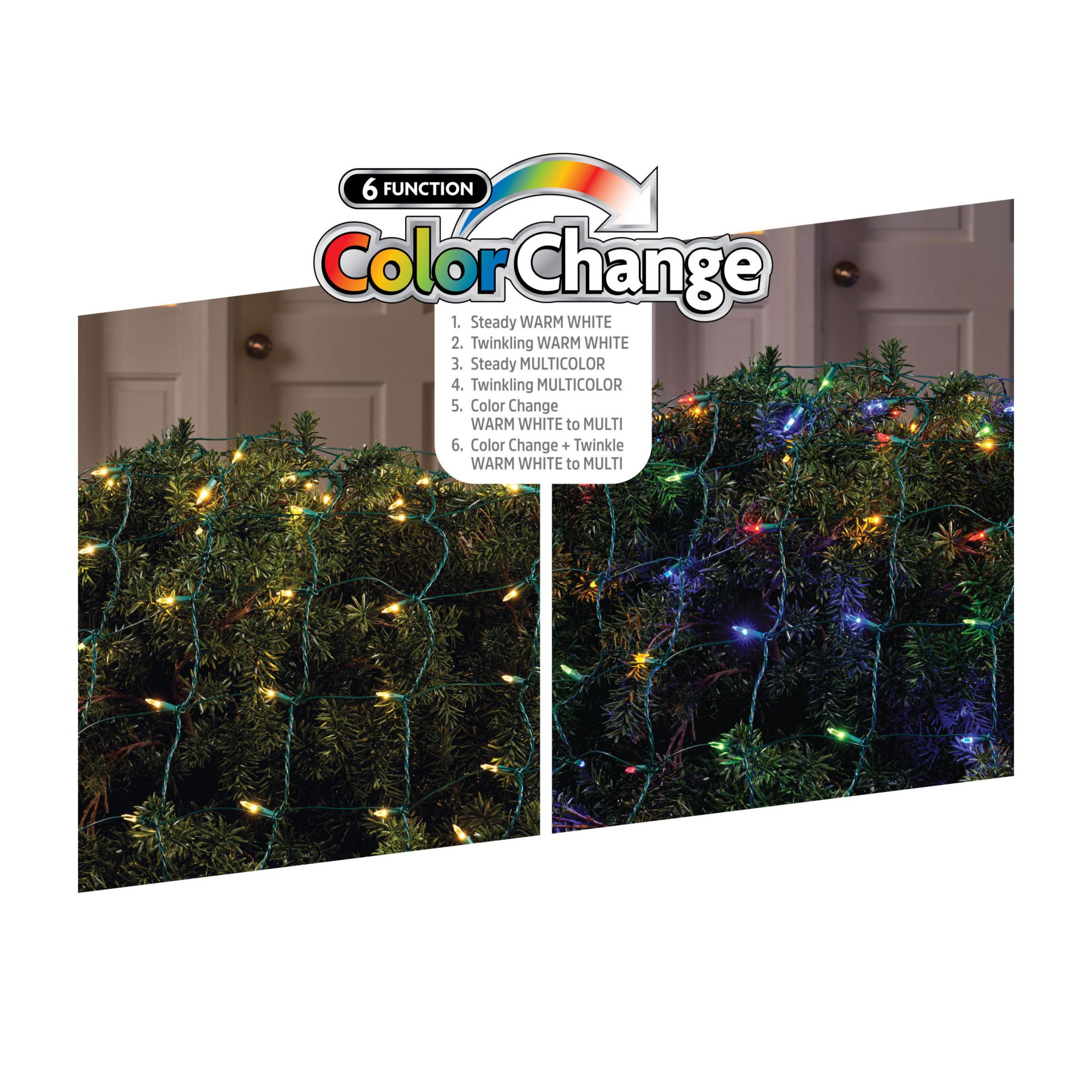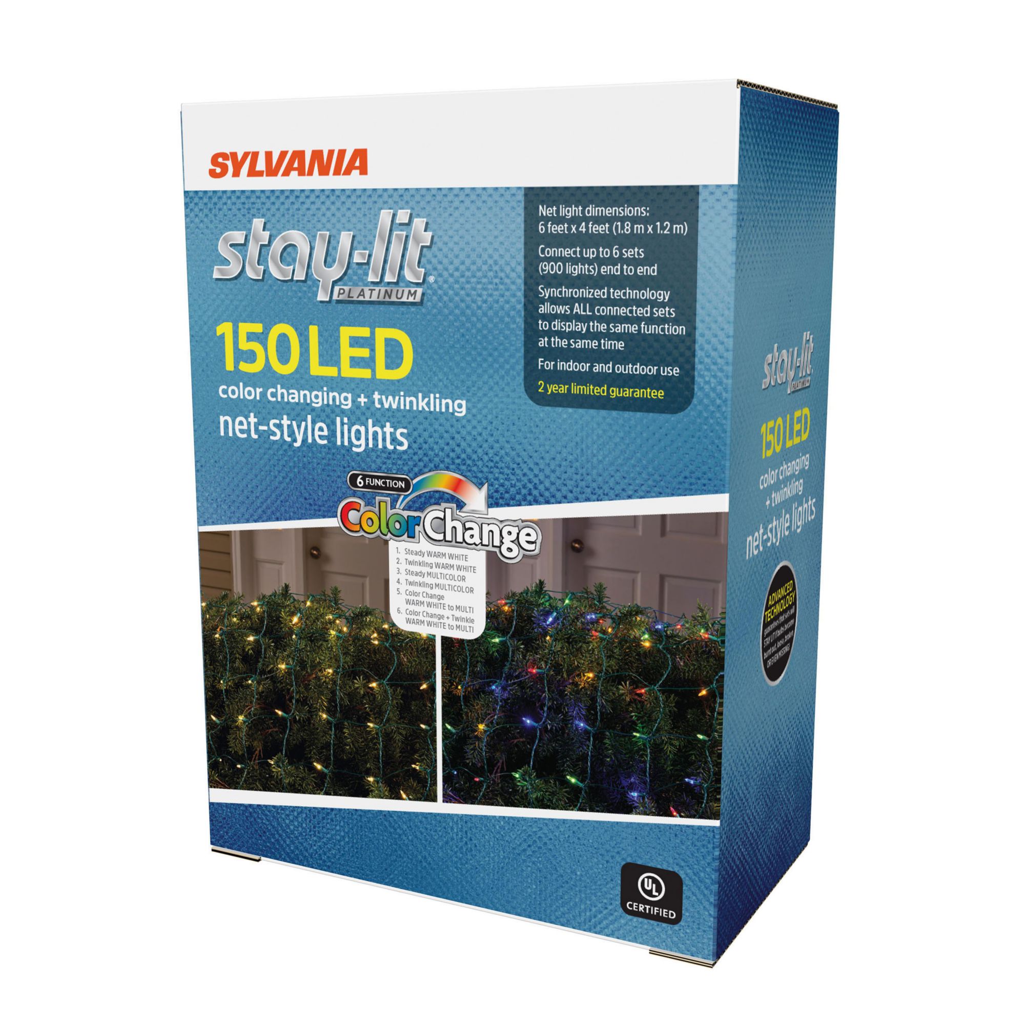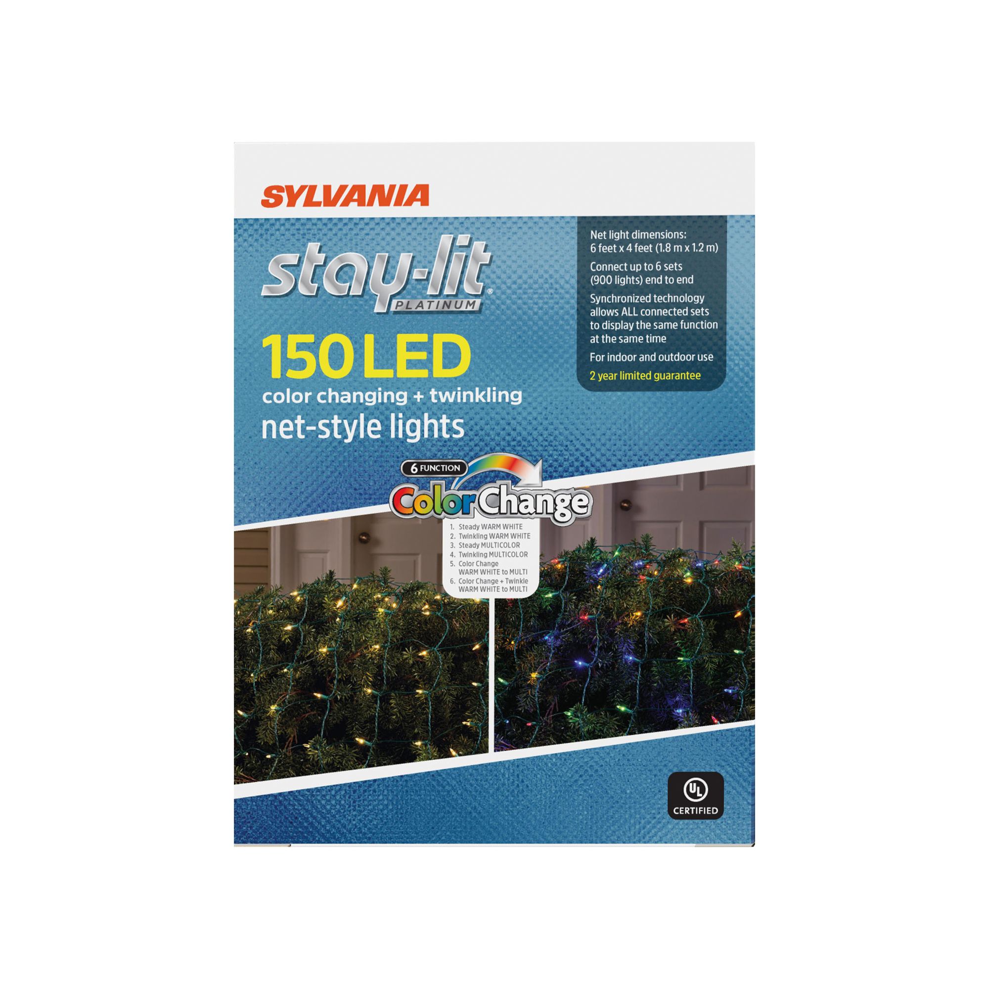 Sylvania Stay-Lit LED 150 ct. 4' x 6' six function color change and twinkle warm white and the multi-color net light set is a fast and beautiful way to decorate outdoor spaces. Drape the LED net lights across bushes and greenery to ensure an even distribution. UL-certified 150 LED net lights remain cool to the touch even when lit and save up to 68 percent on energy costs. Providing excellent illumination and can connect up to 6 sets of this same model with string-to-string construction. Synchronized technology allows ALL connected sets to display the same function at the same time. Stay-Lit advanced technology guarantees that the set will stay lit if a bulb becomes burnt out, loose, broken, or even missing. Enjoy six multiple color-changing and twinkling effects to create an extraordinary Christmas light display.