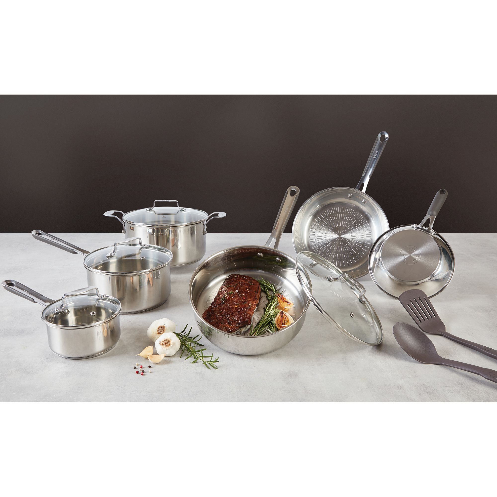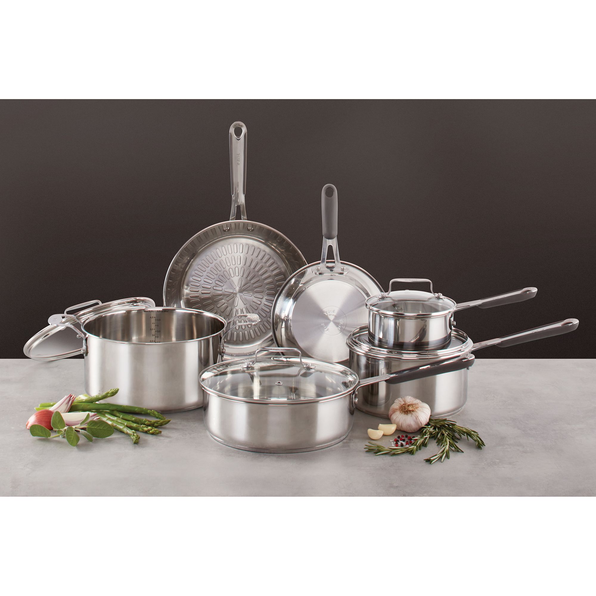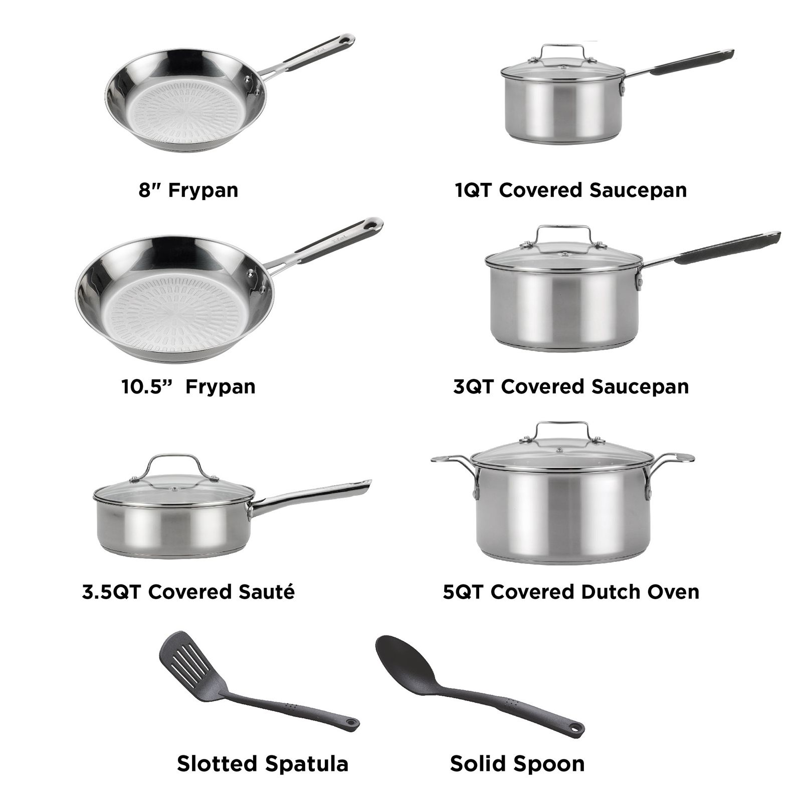 Tri-ply base stainless steel construction ensures long-lasting performance Oven safe up to 400° Dishwasher safe Compatible with all cook tops, including induction Includes 8" frypan, 10.5" frypan, 1-qt. saucepan with lid, 3-qt. saucepan with lid, 3.5-qt. deep saute with lid, 5-qt. Dutch oven with lid, slotted spatula and spoon