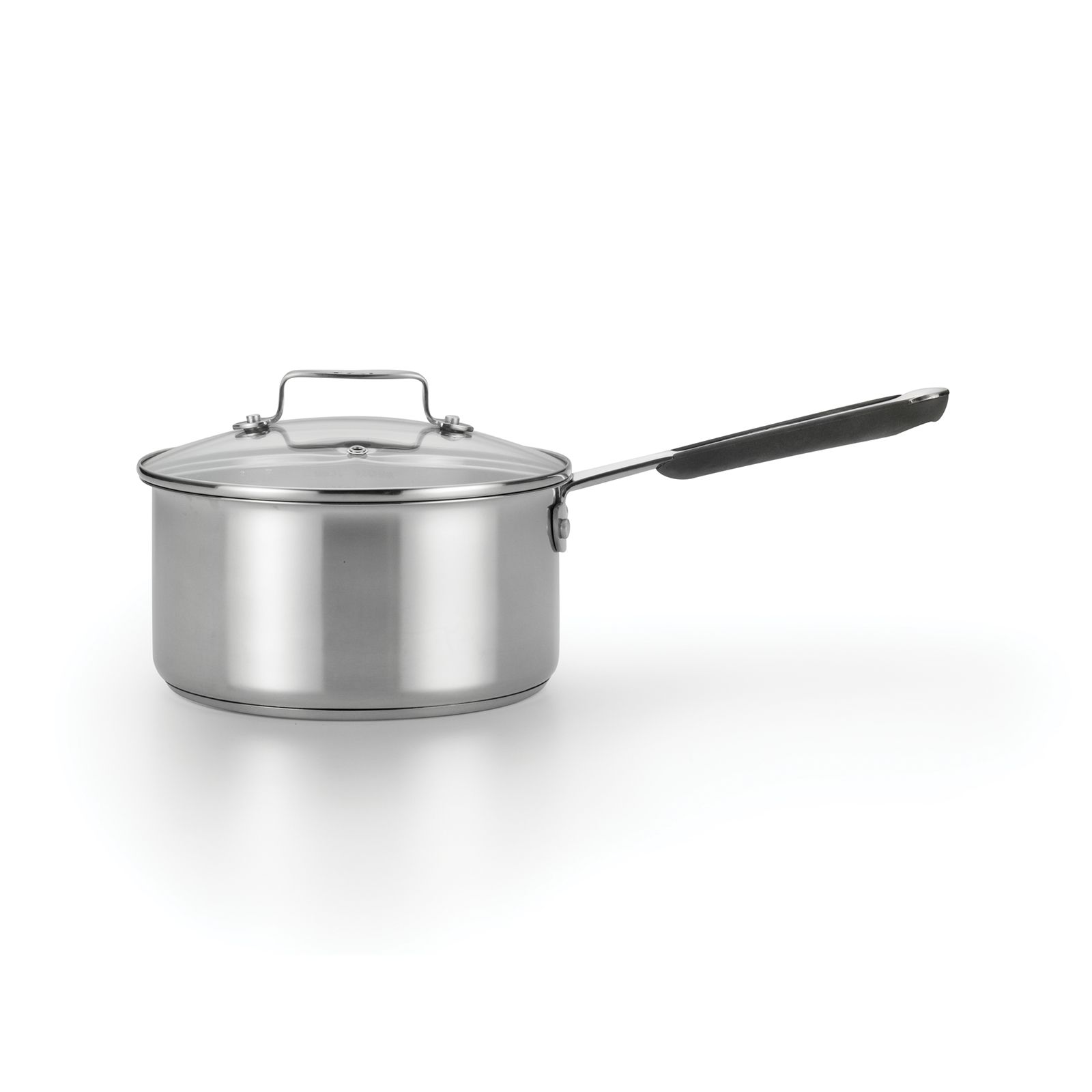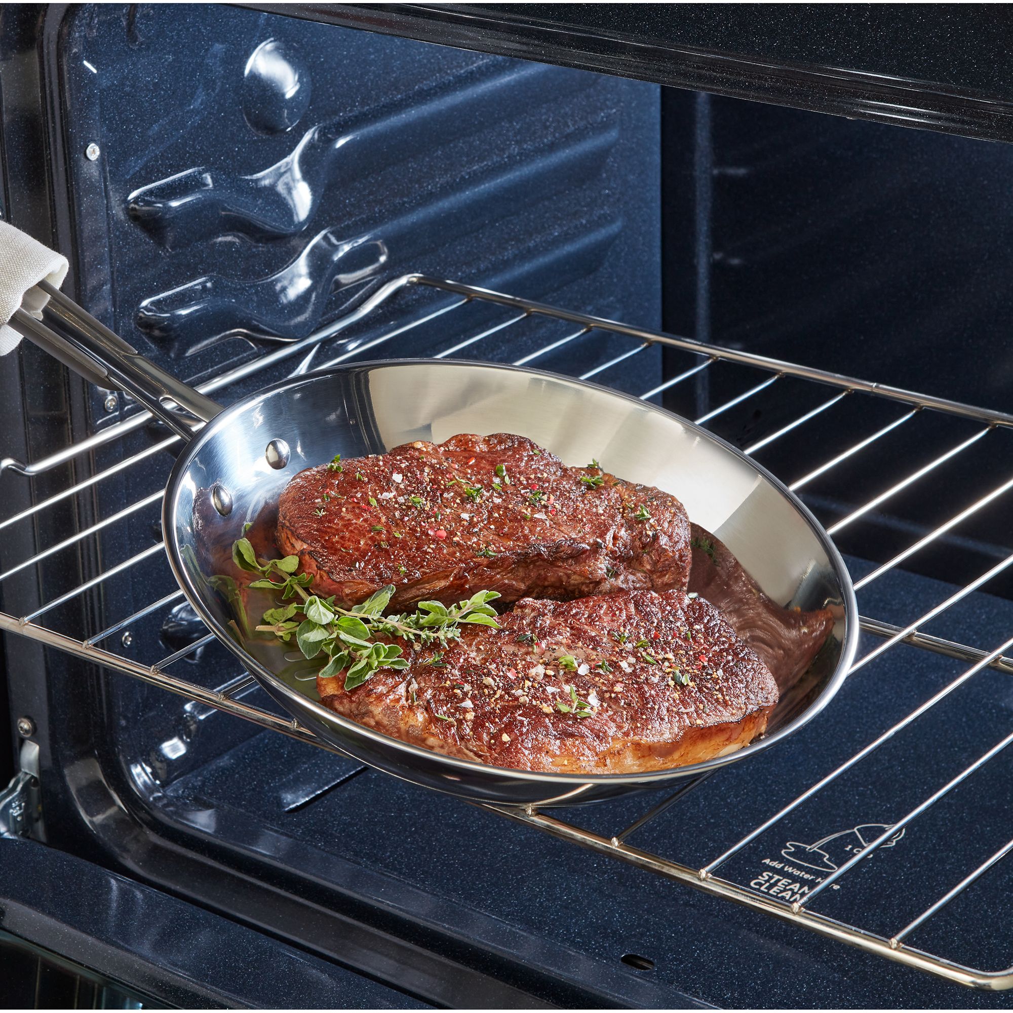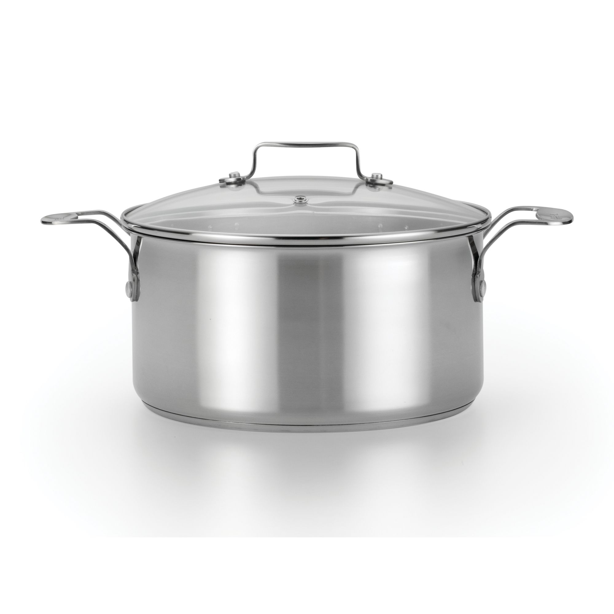 Tri-ply base stainless steel construction ensures long-lasting performance Oven safe up to 400° Dishwasher safe Compatible with all cook tops, including induction Includes 8" frypan, 10.5" frypan, 1-qt. saucepan with lid, 3-qt. saucepan with lid, 3.5-qt. deep saute with lid, 5-qt. Dutch oven with lid, slotted spatula and spoon
