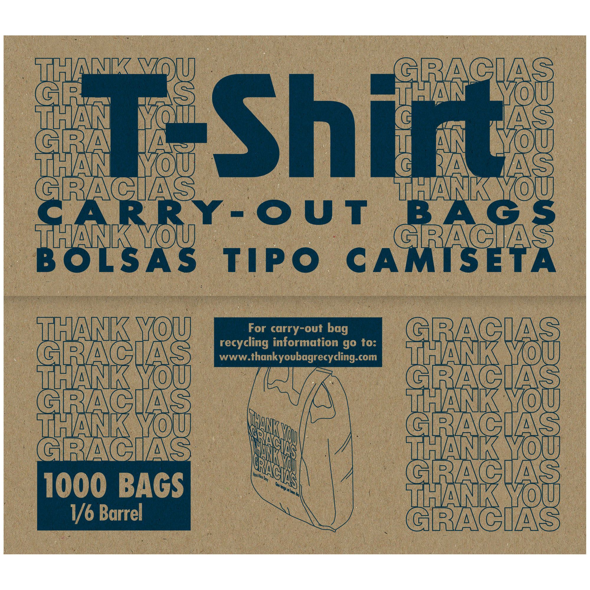 Let your bags say it for you. Made for merchandise carry-out, these white "Thank You" basic T-sack bags say it all. Boasting a 1/6 barrel capacity, they are ideal to hold everything from take-out food to grocery and convenience store items.
