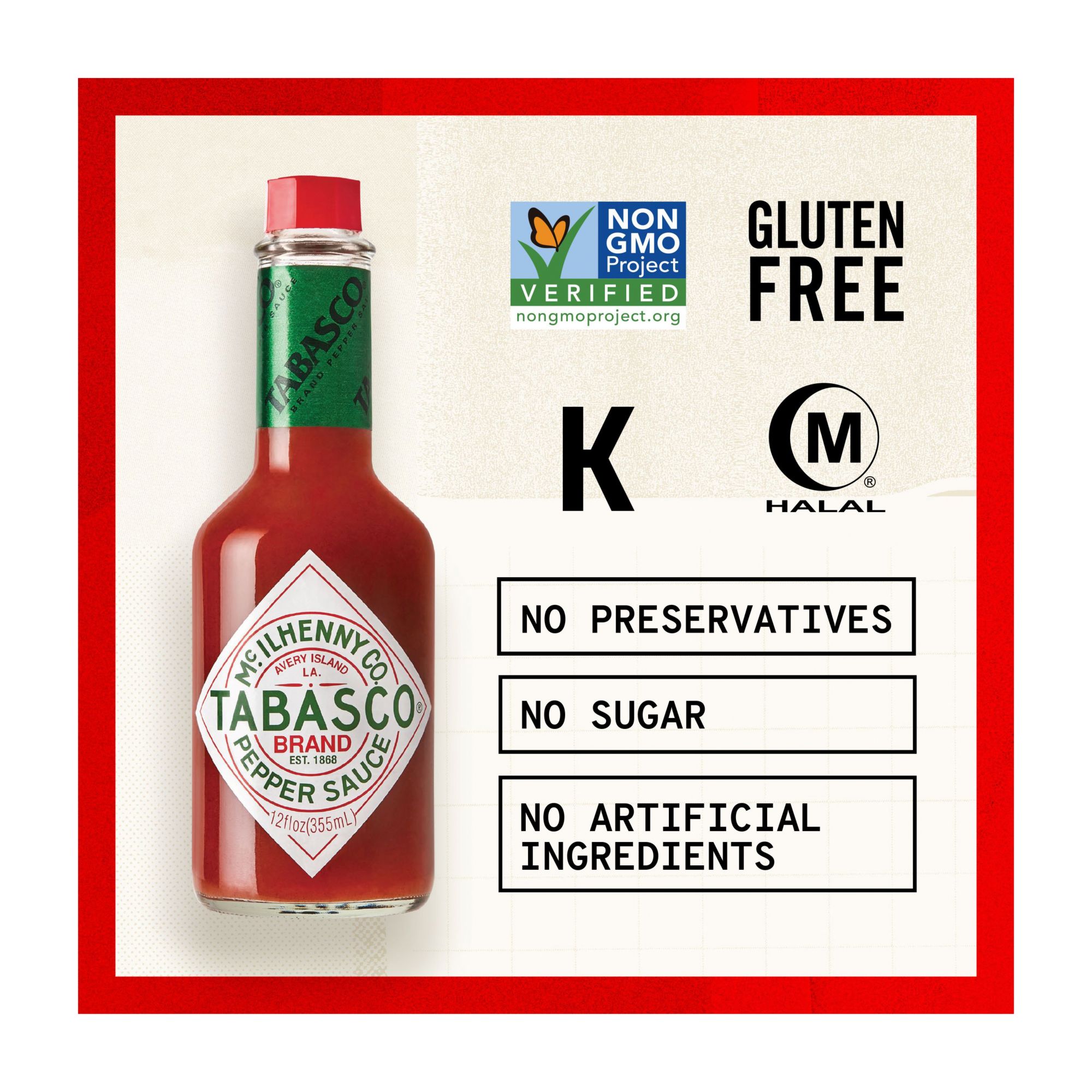 Make breakfast, lunch or dinner better with Tabasco Original Red Pepper Sauce. It's a legendary pepper sauce with a signature kick - a 2500-5000 Scoville rating to be exact - and livens up dishes like pizza, eggs, burgers, tacos and more. Plus, it's made from three simple ingredients: aged red pepper mash, distilled vinegar and salt. It's non-GMO Project Verified, gluten free, Kosher, Halal, and is aged in oak barrels for up to three years on Avery Island, Louisiana before bottling in premium glass packaging. A household and restaurant staple around the world, Tabasco Sauce is sold in more than 195 countries and comes from 156 years of pepper expertise. So, light up your next recipe with a sauce that brings flavor and heat.