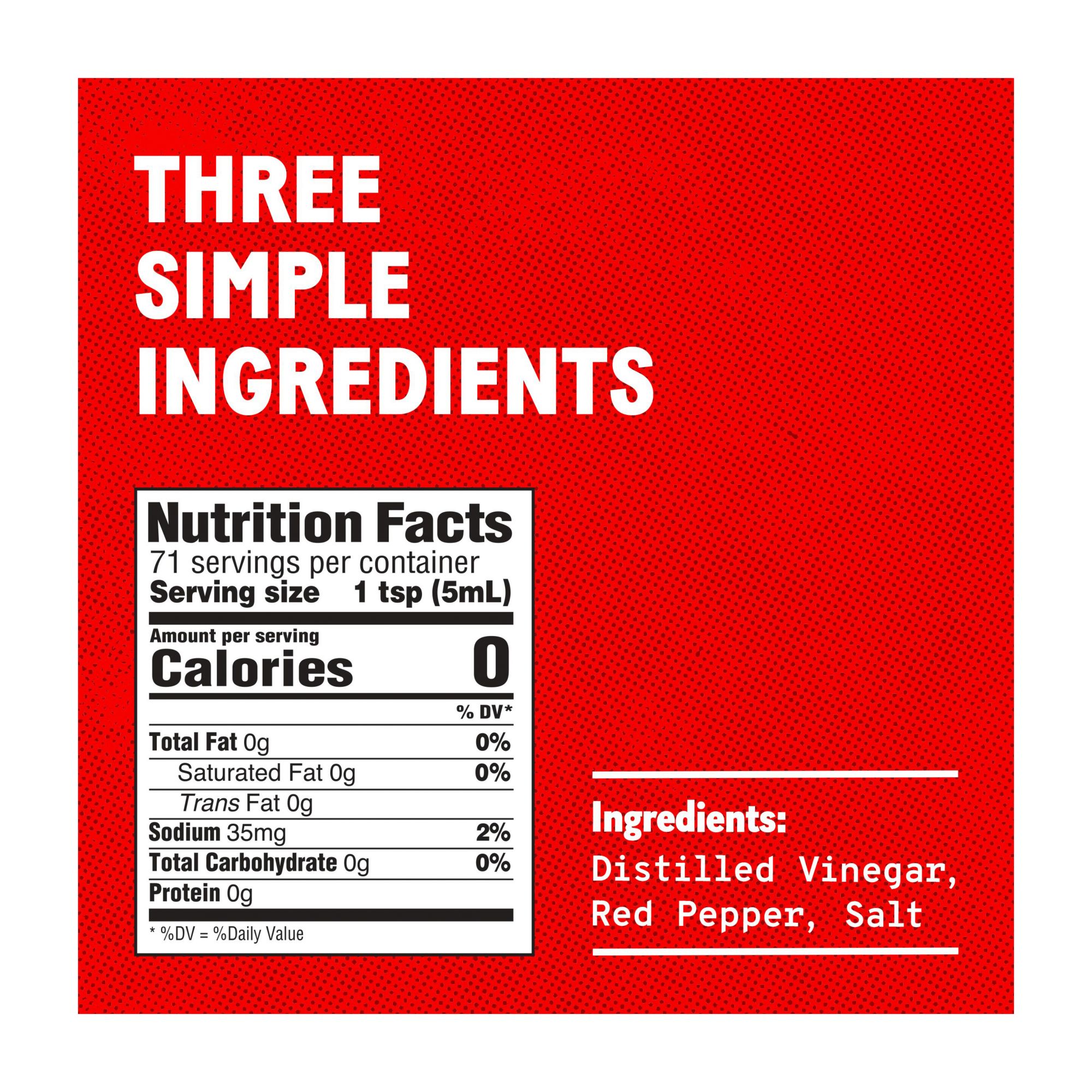 Made with three simple ingredients: red pepper, distilled vinegar, and salt