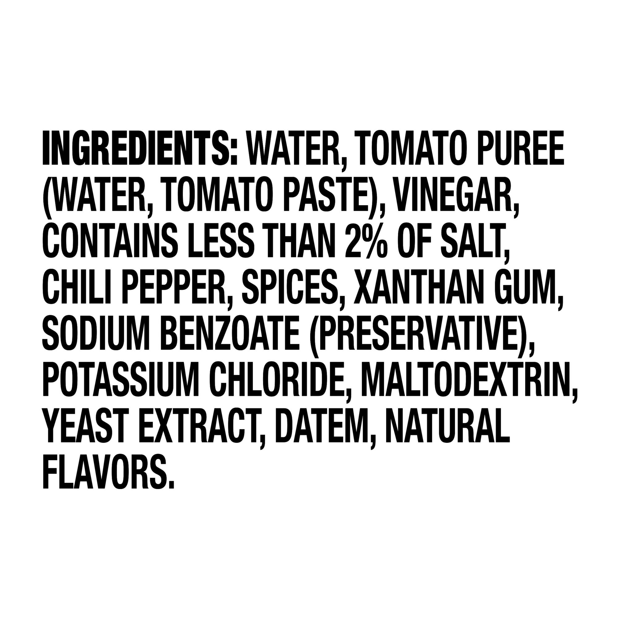 Ingredients: Water, Tomato Puree (Water, Tomato Paste), Vinegar, Contains Less Than 2% Of Salt, Chili Pepper, Spices, Xanthan Gum, Sodium Benzoate (Preservative), Potassium Chloride, Maltodextrin, Yeast Extract, Datem, Natural Flavors.