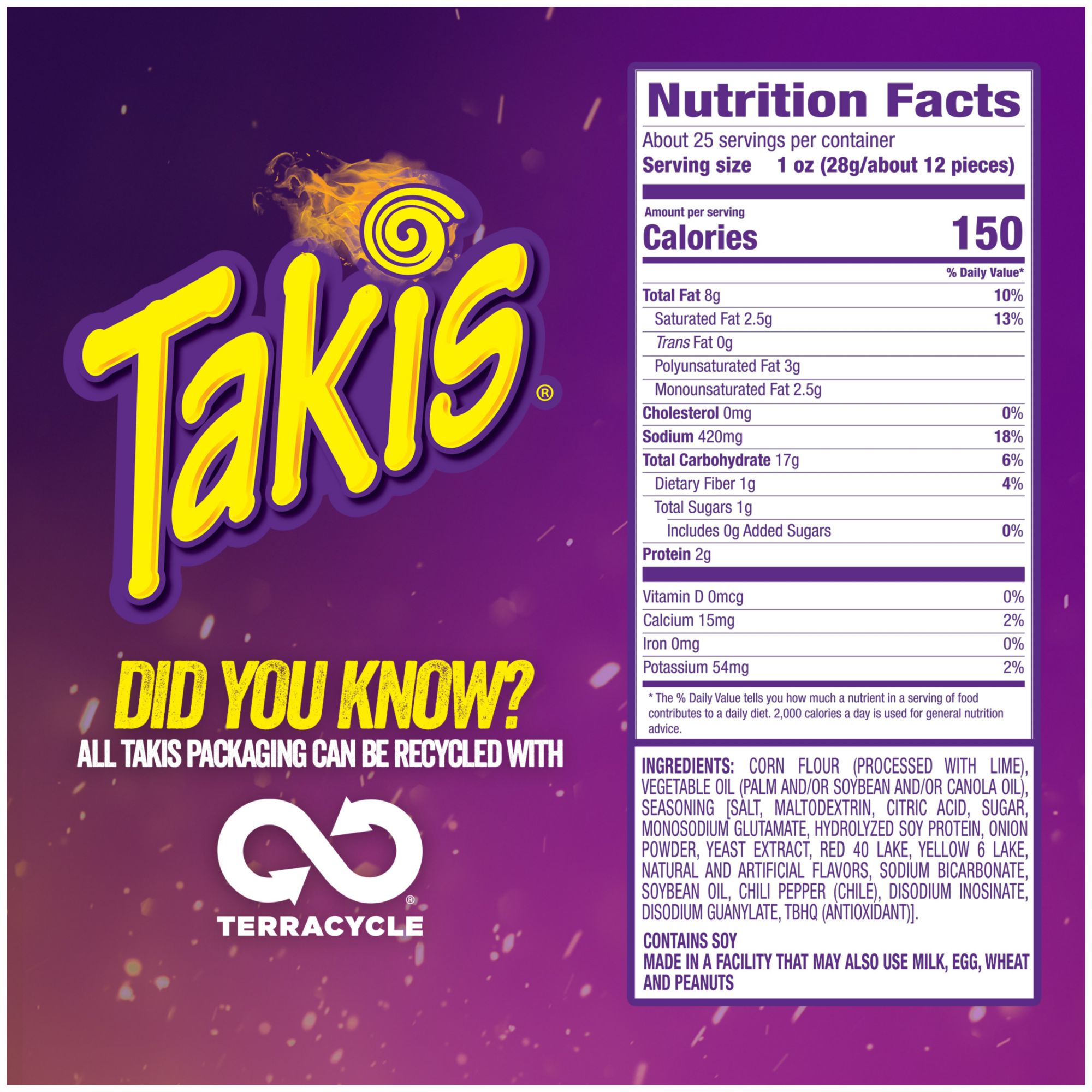 Ingredients: Corn Flour (Processed With Lime), Vegetable Oil (Palm And/or Soybean And/or Canola Oil), Seasoning [Salt, Maltodextrin, Citric Acid, Sugar, Monosodium Glutamate, Hydrolyzed Soy Protein, Onion Powder, Yeast Extract, Red 40 Lake, Yellow 6 Lake, Natural And Artificial Flavors, Sodium Bicarbonate, Soybean Oil, Chili Pepper (Chile), Disodium Inosinate, Disodium Guanylate, TBHQ (Antioxidant)].