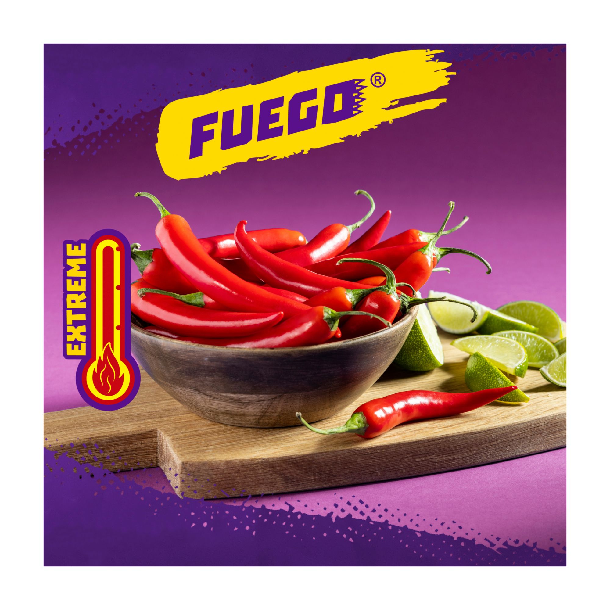 Fuego: Zesty and intensely hot chili pepper and lime flavored chips, for those who dare; Heat-O-Meter: Extreme