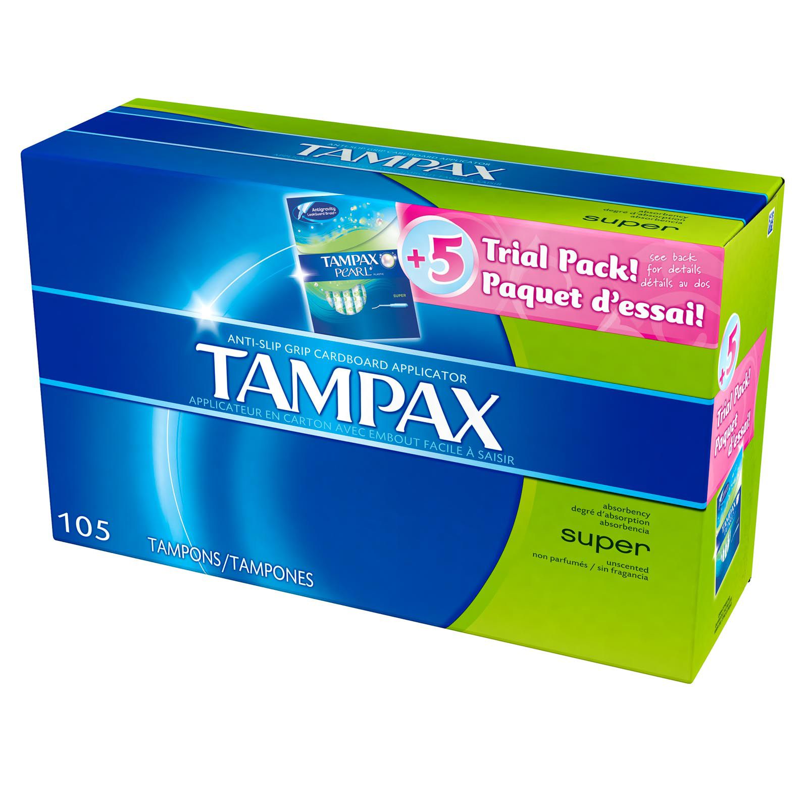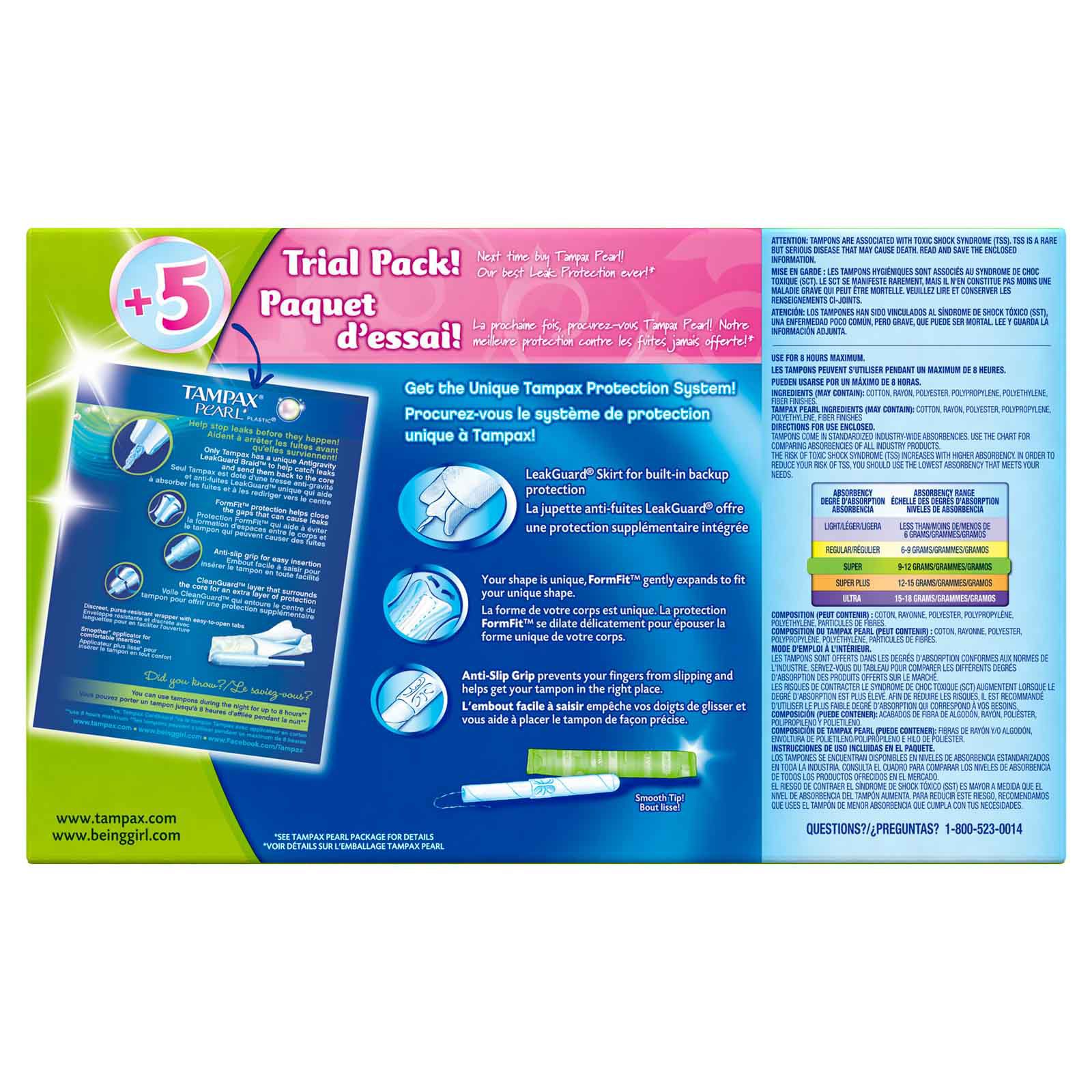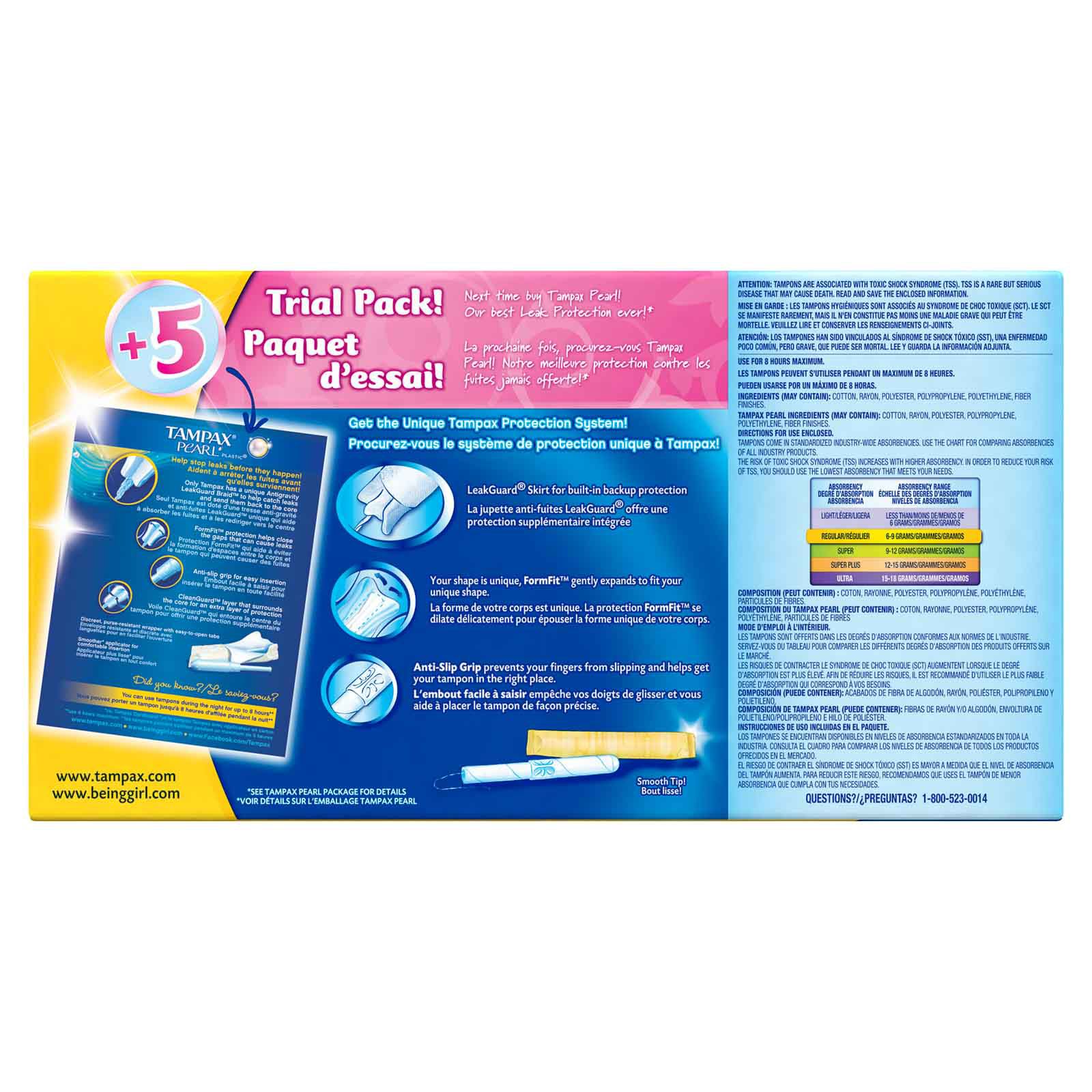 Unique Back-up Protection Your shape is unique, FormFit gently expands to fit your unique shape LeakGuard skirt helps stop leaks Strong, durable wrapper Get up to eight hours* of protection. *Use maximum of eight hours Anti-Slip Grip prevents your fingers from slipping and helps get your tampon in the right place Includes Either 100 count of Tampax Cardboard Applicator Super Absorbency Tampons Plus 5 Count Pearl Super Tampons or Either 100 Count of Tampax Cardboard Applicator Regular Absorbency Tampons Plus 5 Count Pearl Regular Tampons