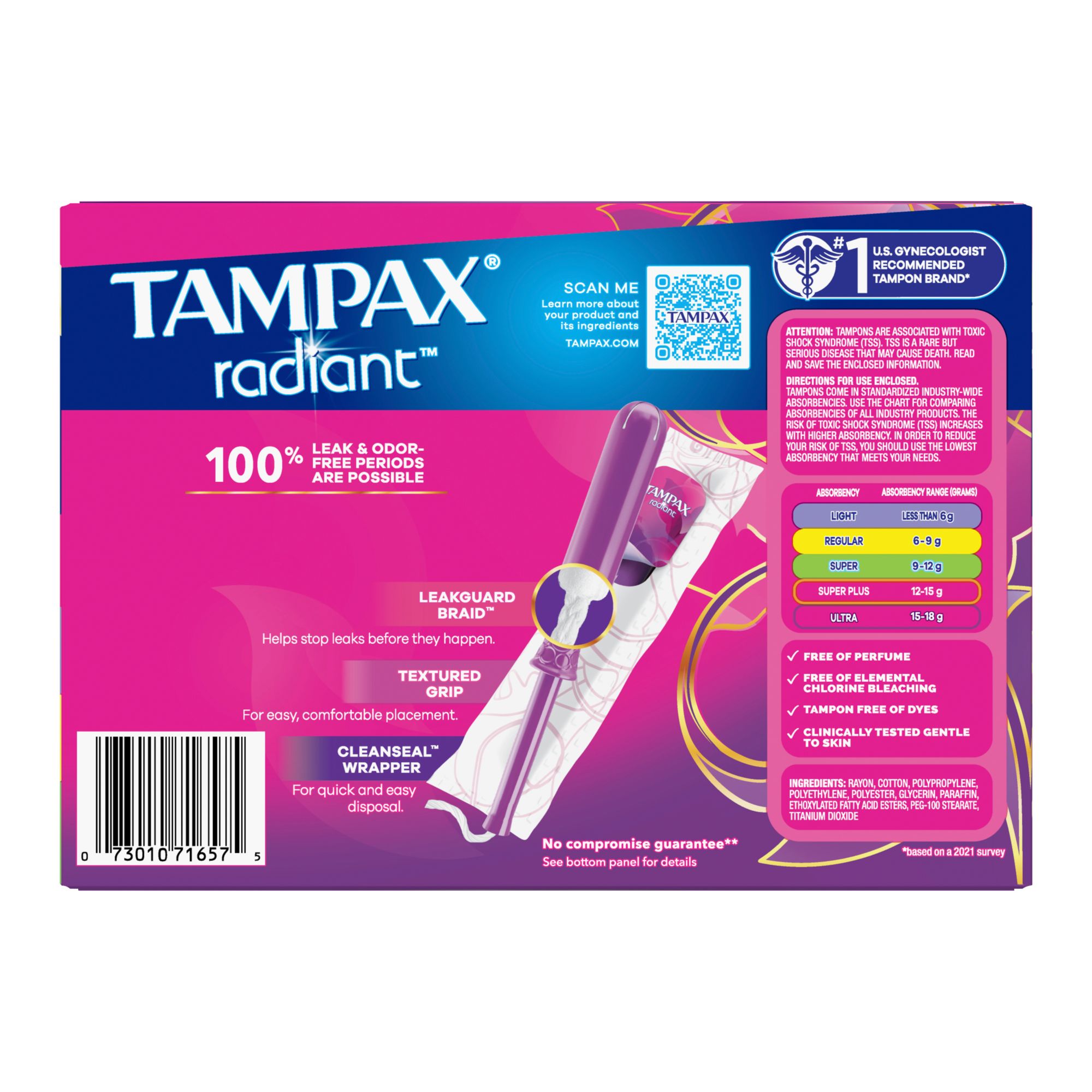 Tampax Radiant tampons provide up to 100% leak and odor-free protection