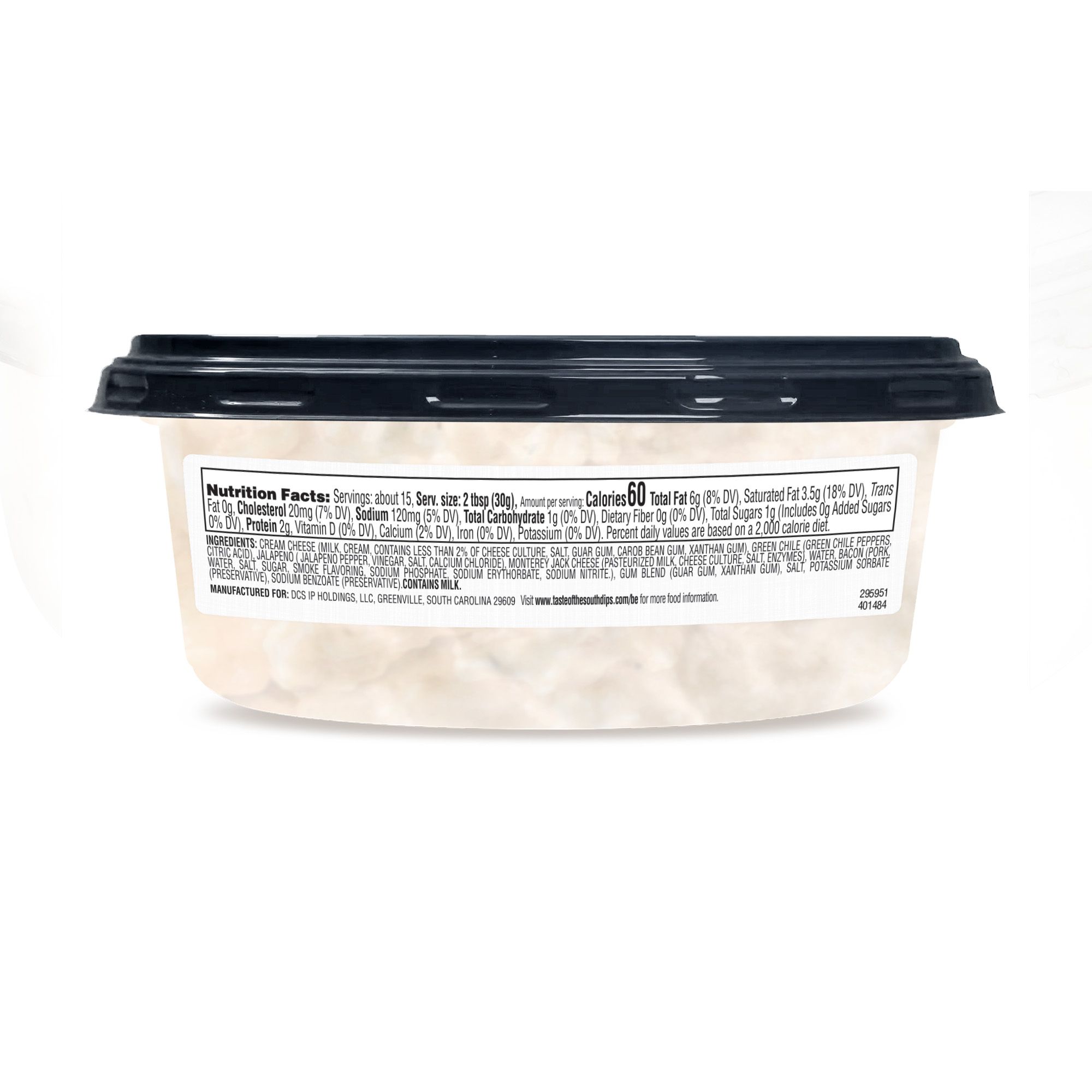 Ingredients: Cream Cheese (Pasteurized Milk & Cream, Cheese Culture, Salt, Guar Gum, Carob Bean Gum, Xanthan Gum), Chile Peppers (Green Chiles, Water, Salt, Citric Acid), Monterey Jack Cheese (Pasturized Milk, Cheese Cultures, Salt, Enzymes, Corn Starch), Jalapeno Peppers, Fully Cooked Bacon Pieces (Bacon, Water, Salt, Sugar, Smoke Flavoring, Sodium Phosphate, Sodium Erythorbate, Sodium Nitrite), Water, Salt, Sodium Benzoate (Preservative), Potassium Sorbate (Preservative), Xanthan Gum, Guar Gum, Gum Acacia. Contains Milk.