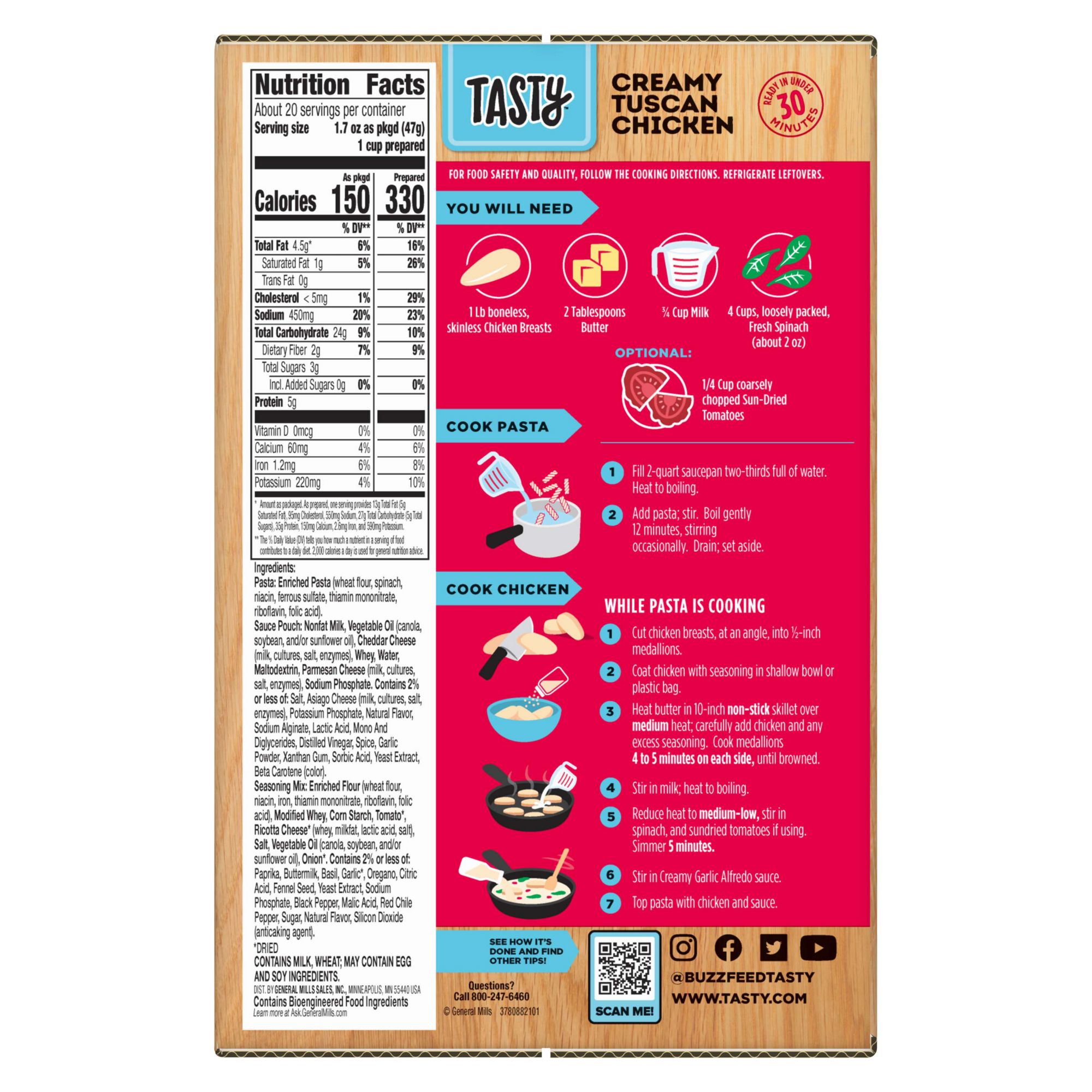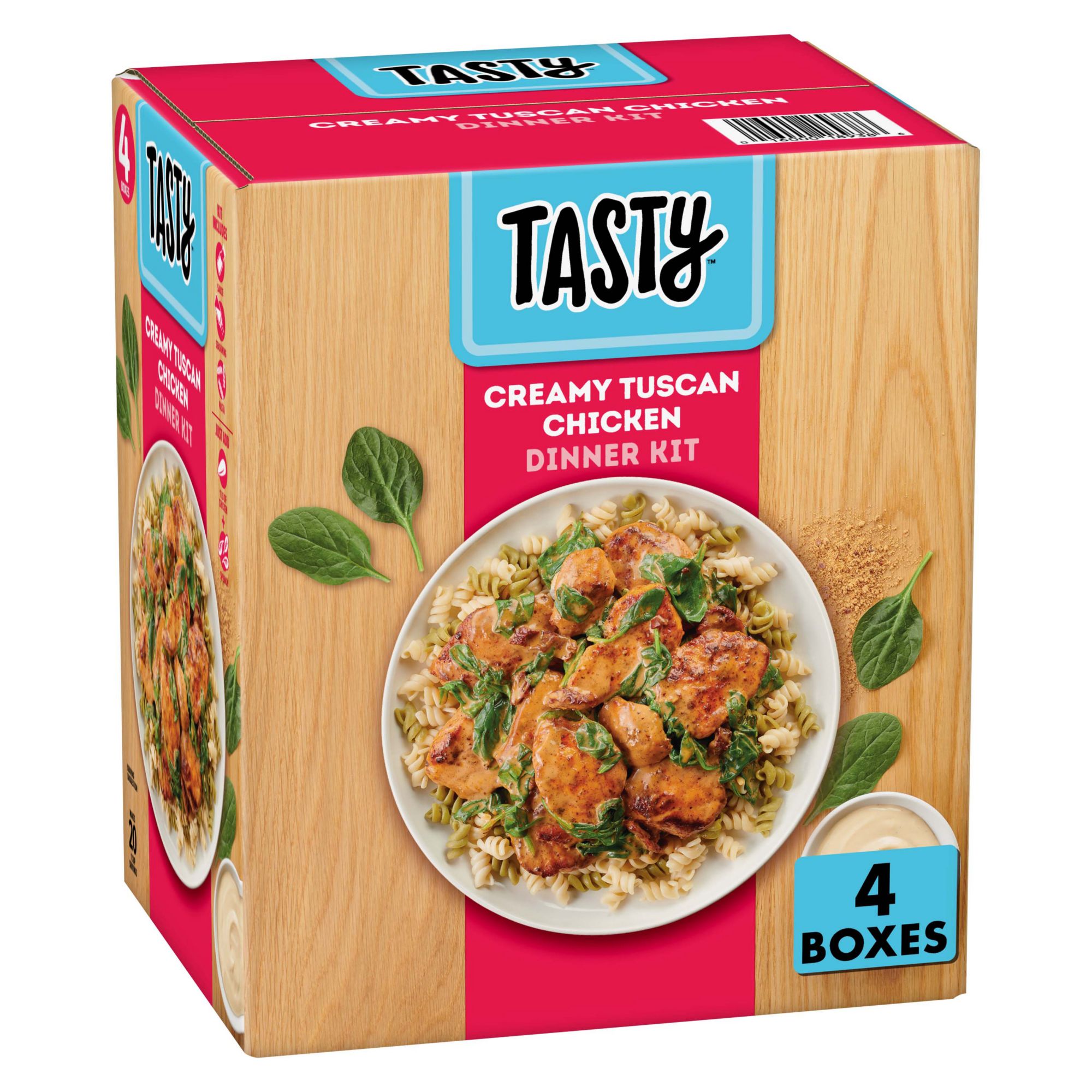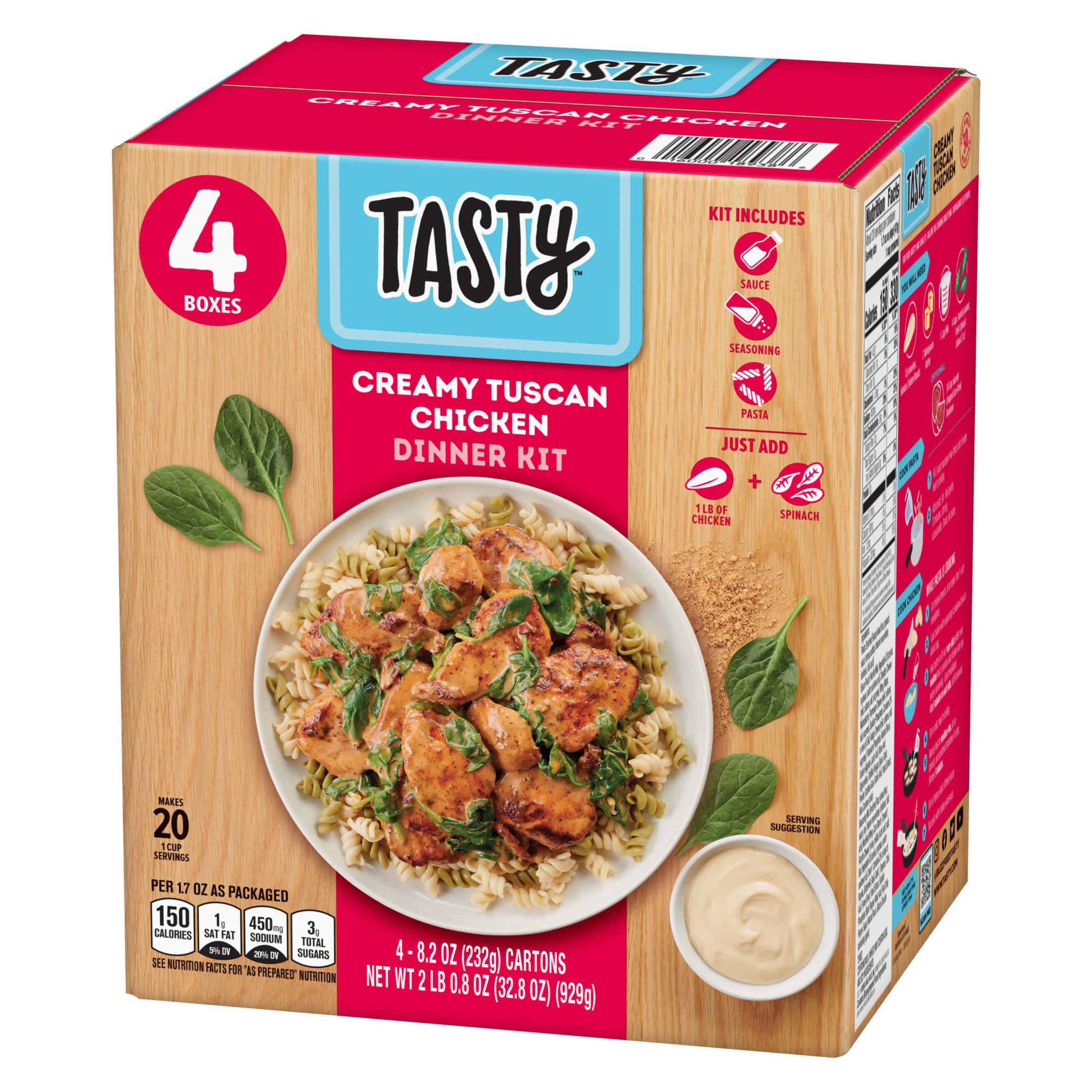 Tasty is the #1 food social media brand that is bringing globally inspired flavors to your home with simple dinner kits This simple kit come with uncooked pasta, a special delightful sauce, and a perfect blend of seasoning, so all you need to do is add your chicken, spinach, milk and butter Prepare this classic dish in under 30 minutes Customize it with your veggies or toppings like sun-dried tomatoes or parsley Includes four individual boxes inside one carton. Each box contains dry pasta, sauce, and spices