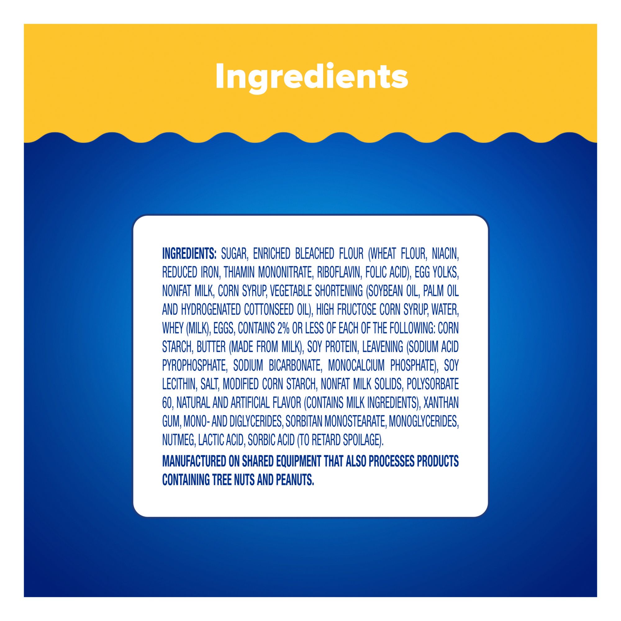 Ingredients: Sugar, Enriched Bleached Flour (Wheat Flour, Niacin, Reduced Iron, Thiamin Mononitrate, Riboflavin, Folic Acid), Egg Yolks, Nonfat Milk, Corn Syrup, Vegetable Shortening (Soybean Oil, Palm Oil And Hydrogenated Cottonseed Oil), High Fructose Corn Syrup, Water, Whey (Milk), Eggs, Contains 2% Or Less Of Each Of The Following: Corn Starch, Butter (Made From Milk), Soy Protein, Leavening (Sodium Acid Pyrophosphate, Sodium Bicarbonate, Monocalcium Phosphate), Soy Lecithin, Salt, Modified Corn Starch, Nonfat Milk Solids, Polysorbate 60, Natural And Artifiial Flavor (Contains Milk Ingredients) Xanthan Gum, Mono And Diglycerides, Sorbitan Monostearate, Monoglycerides, Nutmeg, Lactic Acid, Sorbic Acid (To Retard Spoilage).