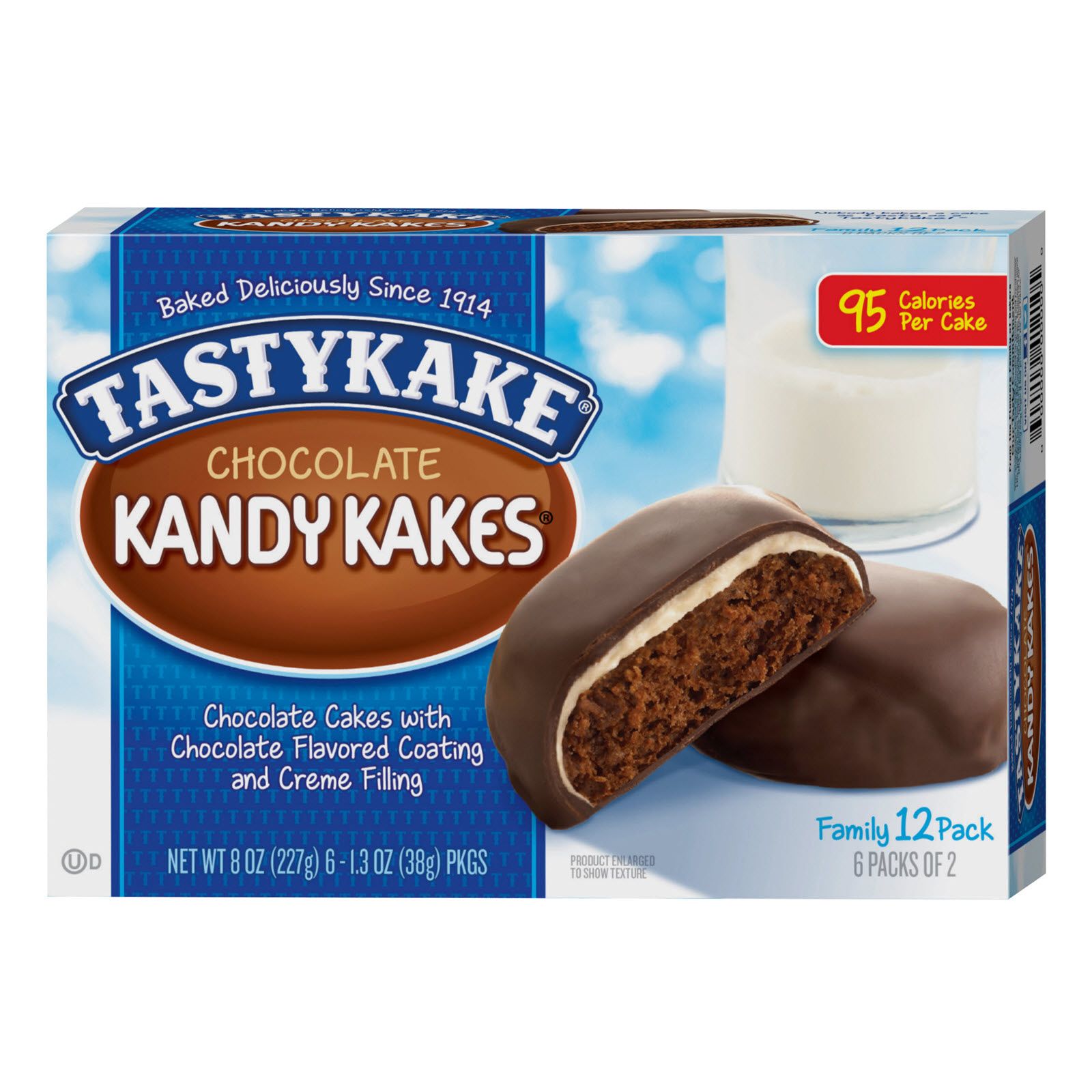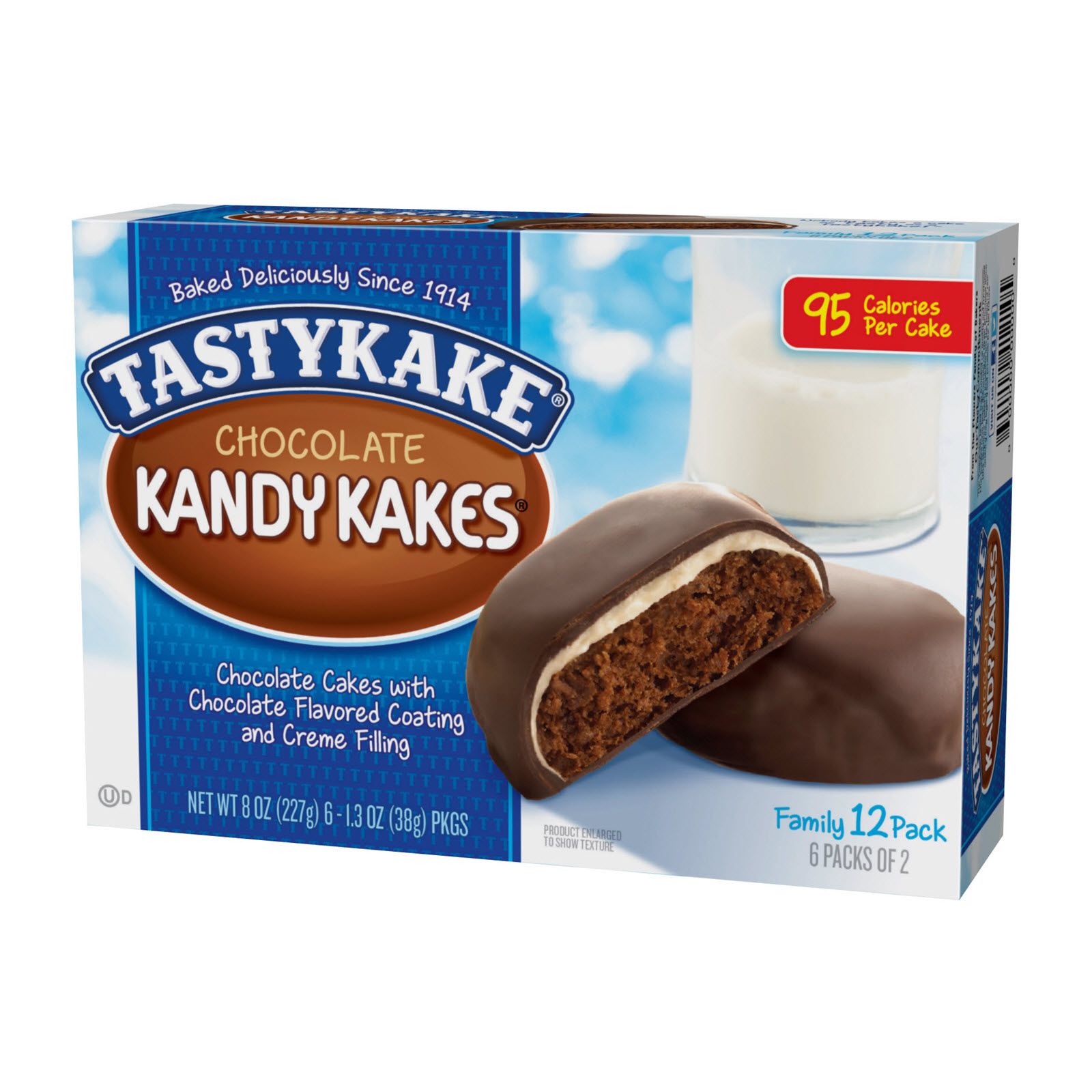 Tastykake Chocolate Kandy Kakes feature chocolate cakes with chocolate flavored coating and crème filling. Each family pack box includes six packages of two Kandy Kakes.