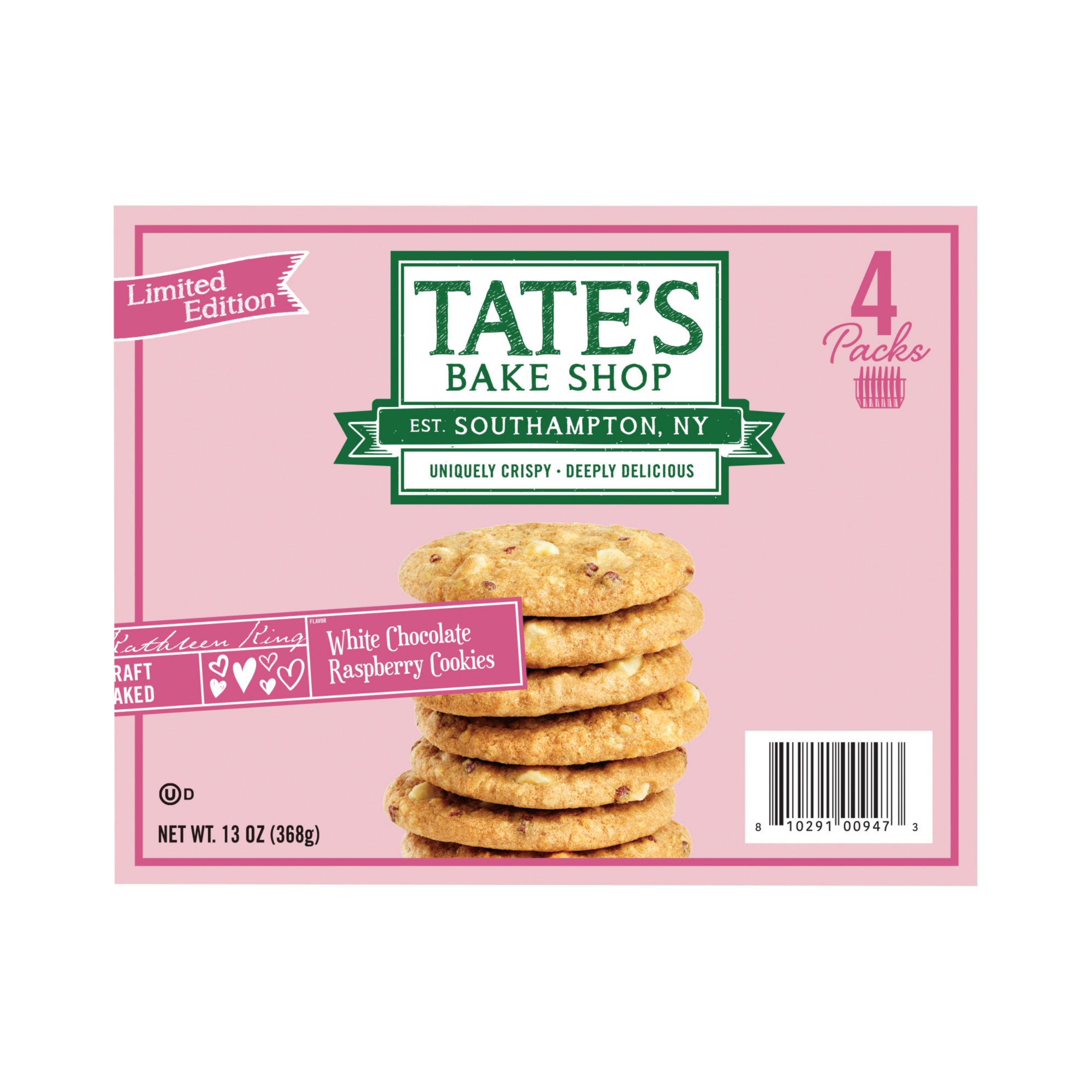 Includes 13 ounces of Tate's Bake Shop White Chocolate Raspberry Cookies