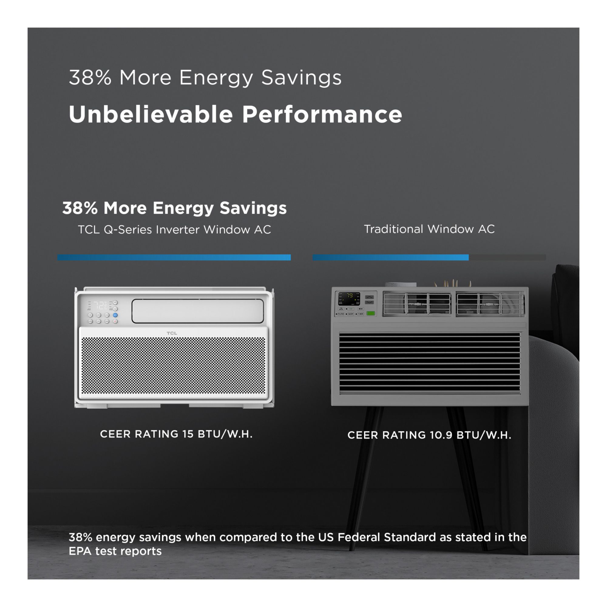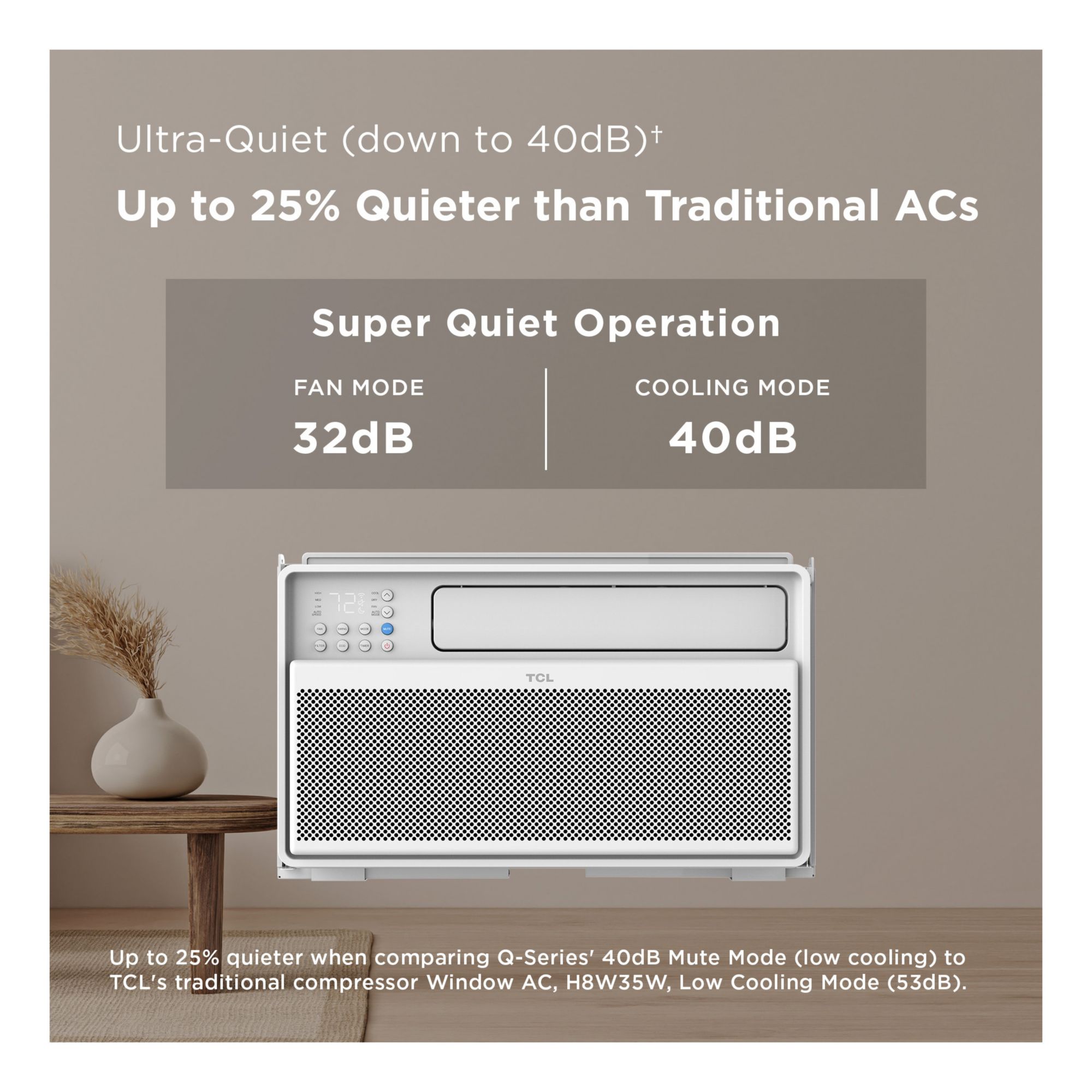 Experience refreshing, whisper-quiet cooling with the TCL Q-Series Smart Inverter Window Air Conditioner (AC). Boasting an 8,000 BTU capacity for rooms up to 350 sq. ft. This AC offers a serene environment with noise levels as low as 40dB on Quiet Cooling mode. The innovative Smart AI Inverter technology ensures faster, consistent cooling with up to 38% energy savings. Enjoy hassle-free setup with the pre-assembled design, providing stability and convenience in as little as 3 steps. Control your comfort effortlessly using the TCL Home App, Alexa, Google Assistant, Siri or the included remote. Elevate your home environment with the Q-Series — cool, quiet, and connected