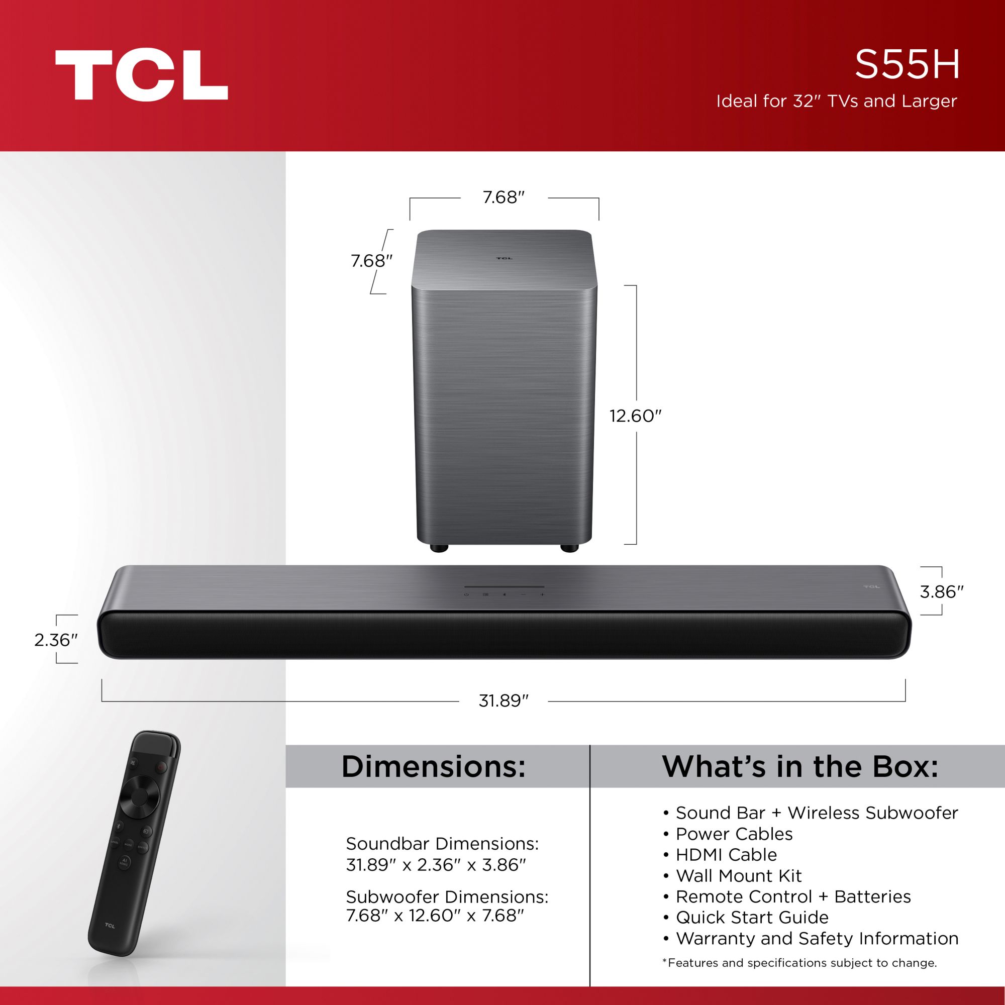 TCL S55H 2.1 Channel S-Class Soundbar with Wireless Subwoofer, Dolby Atmos