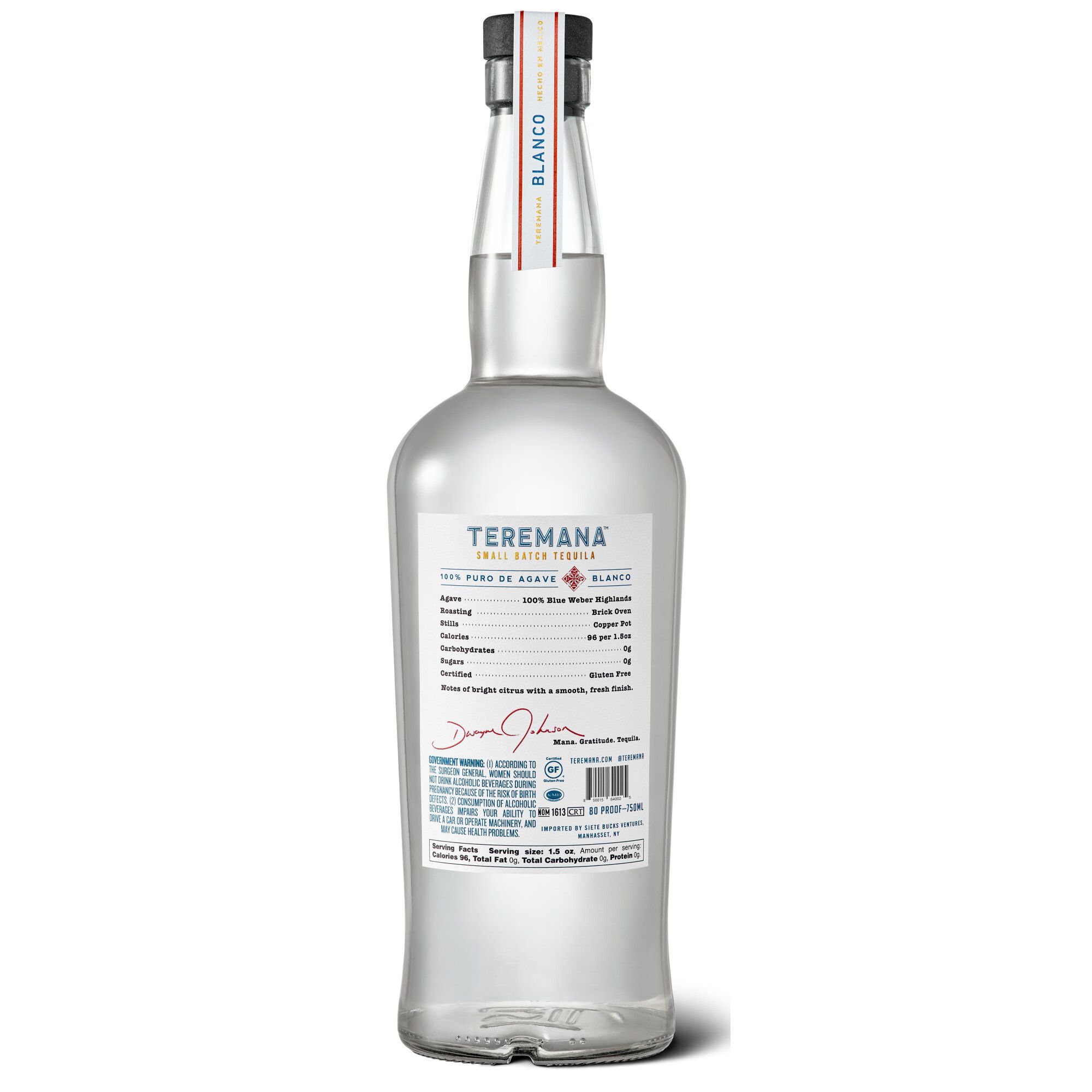 Experience the quality and dedication that goes into each bottle of Teremana Tequila Blanco. Teremana Tequila is a small batch, ultra-premium tequila crafted in the highest peaks of Jalisco, Mexico. Teremana is founded by Dwayne Johnson whose goal was to create a high-quality, responsibly sourced tequila at a price point that was accessible to all. Teremana, meaning spirit of the earth, is a tequila by the people for the people. Teremana is crafted using 100% blue weber agave which is harvested by hand. Once harvested, the Teremana pinas - or hearts of the agave - are slow roasted in small, 24-ton traditional brick ovens for approximately three days at a lower temperature than most. Then Teremana is distilled in copper pot stills which are handmade at the distillery which creates a smooth and balanced tequila. Tequila Blanco is unaged for a bright, clean taste. This silver tequila features notes of bright citrus with a fresh finish. The first tequila to print nutrition information on the bottle, Teremana Tequila Blanco is gluten free, contains 0g of carbs, 0g of sugar, no additives and is 96 calories per 1.5 fl oz. This tequila liquor is perfect for sipping neat, on the rocks, or enjoying mixed into a classic tequila cocktail like a Margarita or Paloma. In 2022, Teremana Tequila Blanco was awarded a Gold Medal in the San Francisco World Spirits Competition and Master in the Spirits Business Awards. This 750 ml tequila bottle has a 40% alcohol by volume and should be enjoyed responsibly. Teremana is the tequila of the People. Bring the Mana.