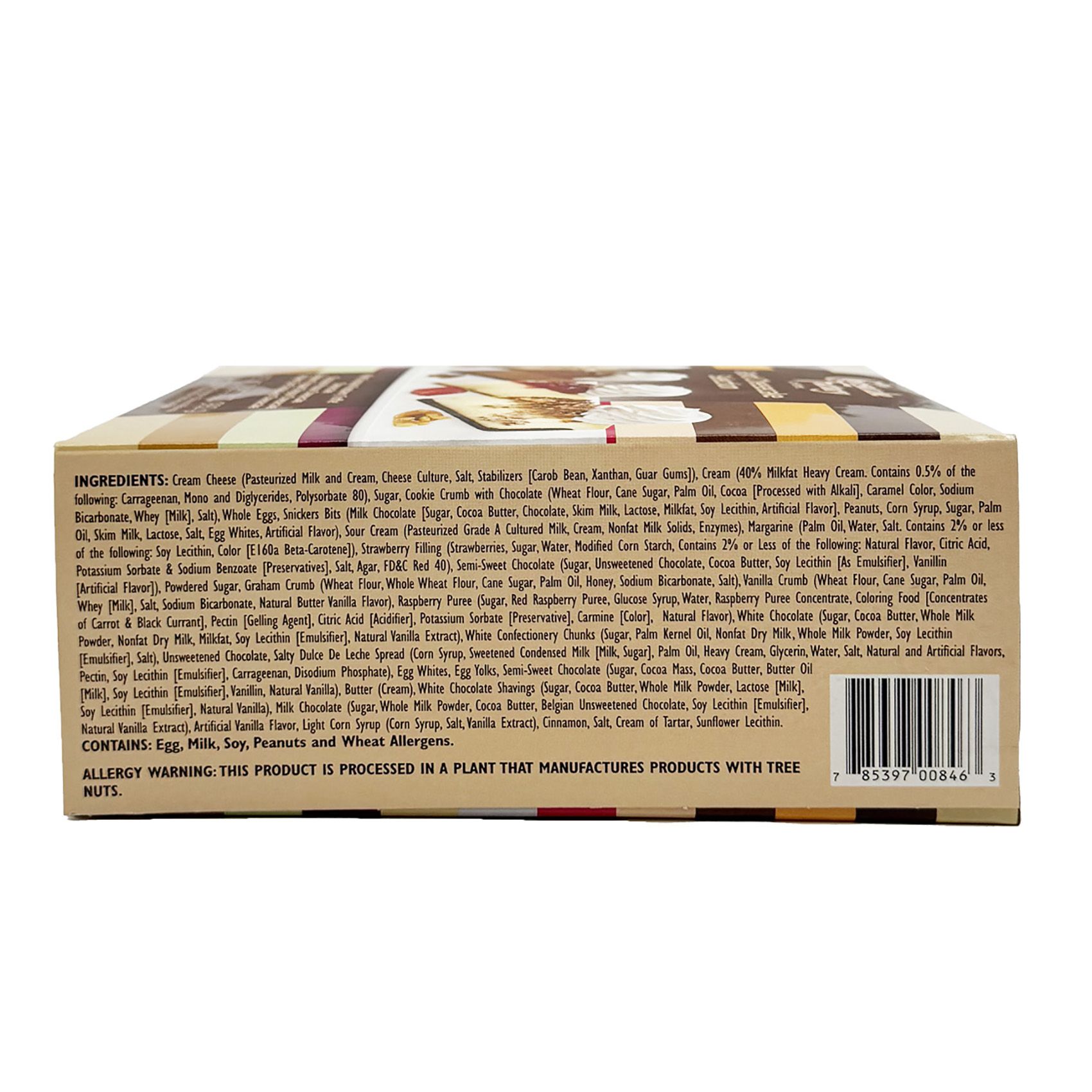 Ingredients: Cream Cheese (Pasteurized Milk and Cream, Cheese Culture, Salt, Stabilizers [Carob Bean, Xanthan, Guar Gums]), Cream (40% Milkfat Heavy Cream. Contains 0.5% of the following: Carrageenan, Mono and Diglycerides, Polysorbate 80), Sugar, Cookie Crumb with Chocolate (Wheat Flour, Cane Sugar, Palm Oil, Cocoa [Processed with Alkali], Caramel Color, Sodium Bicarbonate, Whey [Milk], Salt), Whole Eggs, Snickers Bits (Milk Chocolate [Sugar, Cocoa Butter, Chocolate, Skim Milk, Lactose, Milkfat, Soy Lecithin, Artificial Flavor], Peanuts, Corn Syrup, Sugar, Palm Oil, Skim Milk, Lactose, Salt, Egg Whites, Artificial Flavor), Sour Cream (Pasteurized Grade A Cultured Milk, Cream, Nonfat Milk Solids, Enzymes), Margarine (Palm Oil, Water, Salt. Contains 2% or less of the following: Soy Lecithin, Color [E160a Beta-Carotene]), Strawberry Filling (Strawberries, Sugar, Water, Modified Corn Starch, Contains 2% or Less of the Following: Natural Flavor, Citric Acid, Potassium Sorbate & Sodium Benzoate [Preservatives], Salt, Agar, FD&C Red 40), Semi-Sweet Chocolate (Sugar, Unsweetened Chocolate, Cocoa Butter, Soy Lecithin [As Emulsifier], Vanillin [Artificial Flavor]), Powdered Sugar, Graham Crumb (Wheat Flour, Whole Wheat Flour, Cane Sugar, Palm Oil, Honey, Sodium Bicarbonate, Salt), Vanilla Crumb (Wheat Flour, Cane Sugar, Palm Oil, Whey [Milk], Salt, Sodium Bicarbonate, Natural Butter Vanilla Flavor), Raspberry Puree (Sugar, Red Raspberry Puree, Glucose Syrup, Water, Raspberry Puree Concentrate, Coloring Food [Concentrates of Carrot & Black Currant], Pectin [Gelling Agent], Citric Acid [Acidifier], Potassium Sorbate [Preservative], Carmine [Color], Natural Flavor), White Chocolate (Sugar, Cocoa Butter, Whole Milk Powder, Nonfat Dry Milk, Milkfat, Soy Lecithin [Emulsifier], Natural Vanilla Extract), White Confectionery Chunks (Sugar, Palm Kernel Oil, Nonfat Dry Milk, Whole Milk Powder, Soy Lecithin [Emulsifier], Salt), Unsweetened Chocolate, Salty Dulce De Leche Spread (Corn Syrup, Sweetened Condensed Milk [Milk, Sugar], Palm Oil, Heavy Cream, Glycerin, Water, Salt, Natural and Artificial Flavors, Pectin, Soy Lecithin [Emulsifier], Carrageenan, Disodium Phosphate), Egg Whites, Egg Yolks, Semi Sweet Chocolate (Sugar, Cocoa Mass, Cocoa Butter, Butter Oil [Milk], Soy Lecithin [Emulsifier], Vanillin, Natural Vanilla), Butter (Cream), White Chocolate Shavings (Sugar, Cocoa Butter, Whole Milk Powder, Lactose [Milk], Soy Lecithin [Emulsifier], Natural Vanilla), Milk Chocolate (Sugar, Whole Milk Powder, Cocoa Butter, Belgian Unsweetened Chocolate, Soy Lecithin [Emulsifier], Natural Vanilla Extract), Artificial Vanilla Flavor, Light Corn Syrup (Corn Syrup, Salt, Vanilla Extract), Cinnamon, Salt, Cream of Tartar, Sunflower Lecithin. Contains: Egg, Milk, Soy, Peanuts and Wheat Allergens.