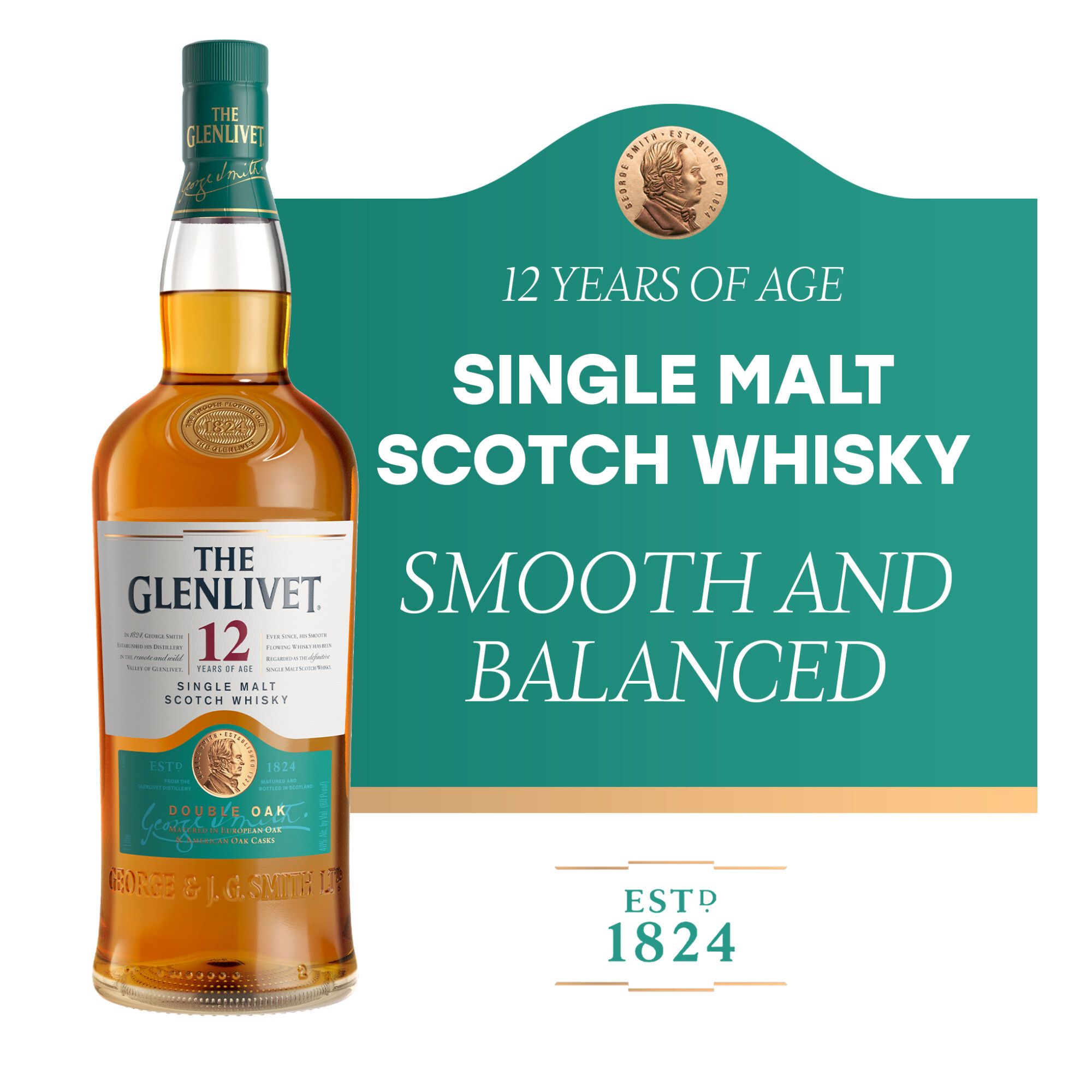 The Glenlivet 12 Year Old is a Single Malt Scotch Whisky with a classic, yet sophisticated flavor and vibrant gold color. Representing The Glenlivet's signature style, this balanced Single Malt Scotch Whisky starts maturing in traditional European oak before completing the process in American oak casks where it picks up notes of vanilla and its distinctive smoothness. The Glenlivet takes water from Josie's Well, a natural spring supplied with water from River Livet, which is nicknamed "the smooth flowing one", and which helps form the flavors during mashing and fermentation. Copper stills add a delicate yet complex character. Delivering floral notes and smooth fruit, this premium scotch whisky finishes with the creamy taste of marzipan and hazelnut. Enjoy this liquor neat, on the rocks, or in a classic cocktail like a French 75, Old Fashioned or New York Sour. Pair The Glenlivet 12 Year Old with seafood dishes like seared scallops or smoked meats. Enjoy Responsibly.