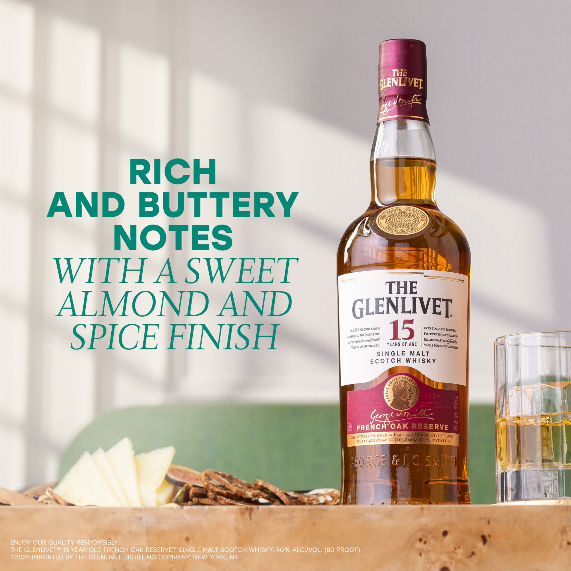 The Glenlivet 15 Year Old is a Single Malt Scotch Whisky with a sweet, incredibly smooth flavor and intense gold color. This distinctively rich Single Malt Scotch Whisky is selectively matured in French Limousin oak casks. The cask's wood is cut from France's Dordogne region, which is known for making and maturing Cognac. Its low density allows the whisky to sink deep into the wood and draw out rich, spice flavors. On the nose, enjoy creamy and rich notes of toasted almond. Delivering round, sweet and incredibly smooth fruity and nutty flavors, this premium scotch whisky ends in a lingering, sweet almond and spicy finish. Enjoy this liquor neat or on the rocks. Pair The Glenlivet 15 Year Old with full-flavored venison dishes. Join us in continuing the vision of our founder, George Smith, as we break traditions, set new standards, and move things forward; opening up the world of single malt to all through exceptional casks, finishes, and unique serves. Enjoy Responsibly.
