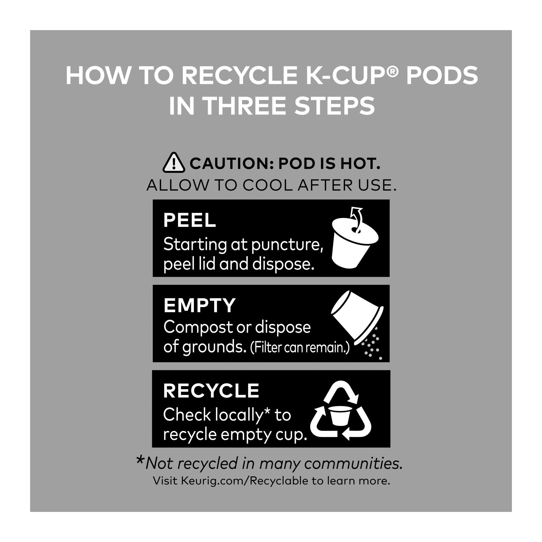 Recyclable* K-Cup pods: Simple. Delicious. And Recyclable. Enjoy the same great-tasting coffee you know and love, and when you’re done just peel, empty and recycle. *Check locally, not recycled in all communities. Packaging may vary.
