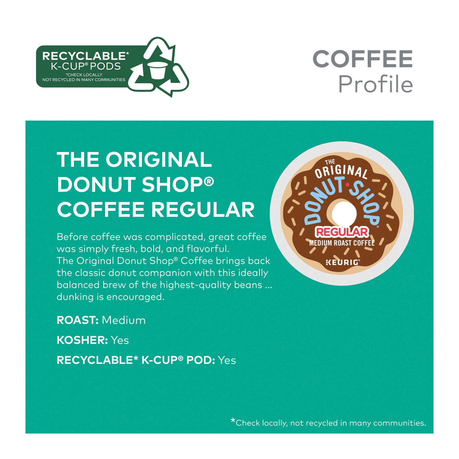 Before coffee was complicated, great coffee was simply fresh, bold, and flavorful. The Original Donut Shop Regular single serve K-Cup pods bring back the classic donut companion, with this ideally balanced brew of the highest quality beans...dunking is encouraged. Full-flavored and easy going, this medium roast blend embodies one of the best things in life - simply great coffee. These single-serve K-Cup pods are compatible with all Keurig K-Cup Pod Single-Serve Coffee Makers and brew up to 12 oz. of The Original Donut Shop Regular coffee each. Each K-Cup pod is filled with the freshest ground coffee and brews a perfect, great tasting cup of coffee, every time. Certified Orthodox Union Kosher and contains no artificial ingredients.