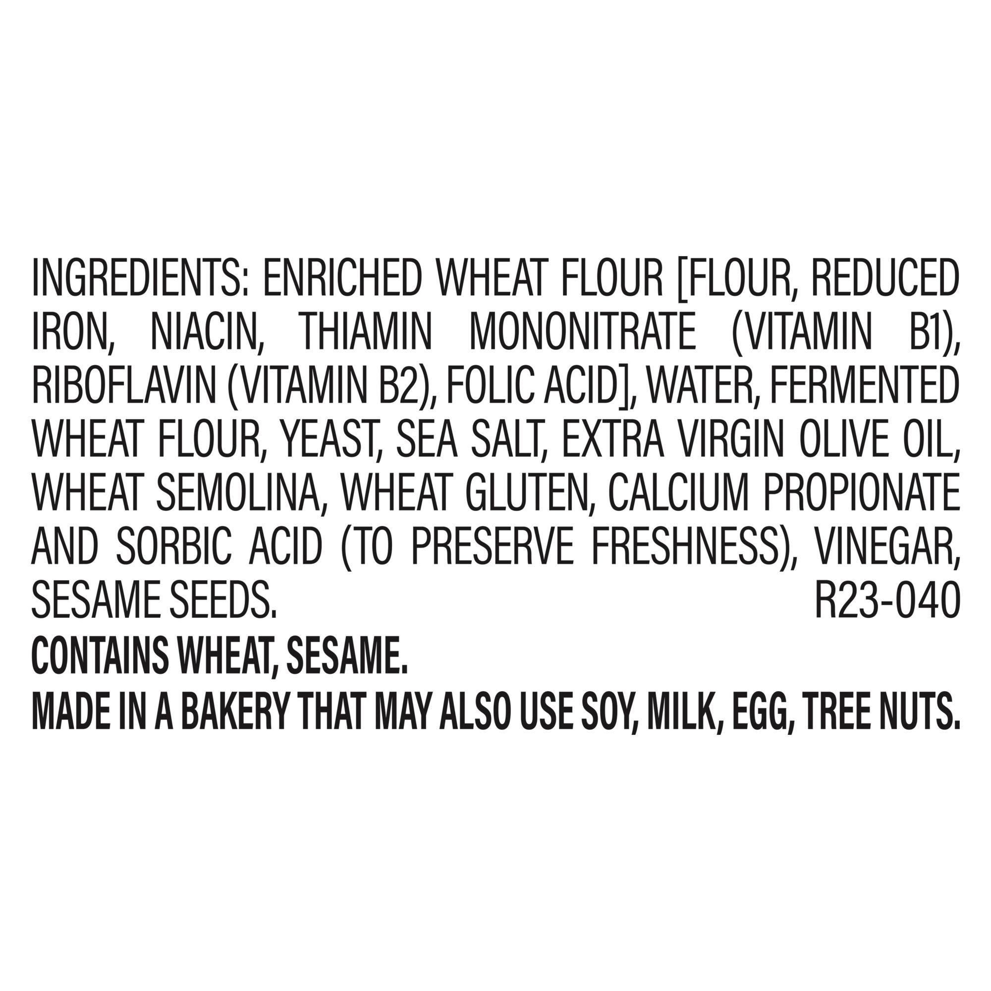 Ingredients: Enriched Wheat Flour [Flour, Malted Barley Flour, Reduced Iron, Niacin, Thiamin Mononitrate (Vitamin B1), Riboflavin (Vitamin B2), Folic Acid], Water, Wheat Sourdough [Fermented Wheat Flour], Wheat Gluten, Yeast, Extra Virgin Olive Oil, Sea Salt, Preservatives [Calcium Propionate, Sorbic Acid], Organic Grain Vinegar, Sesame Seeds.