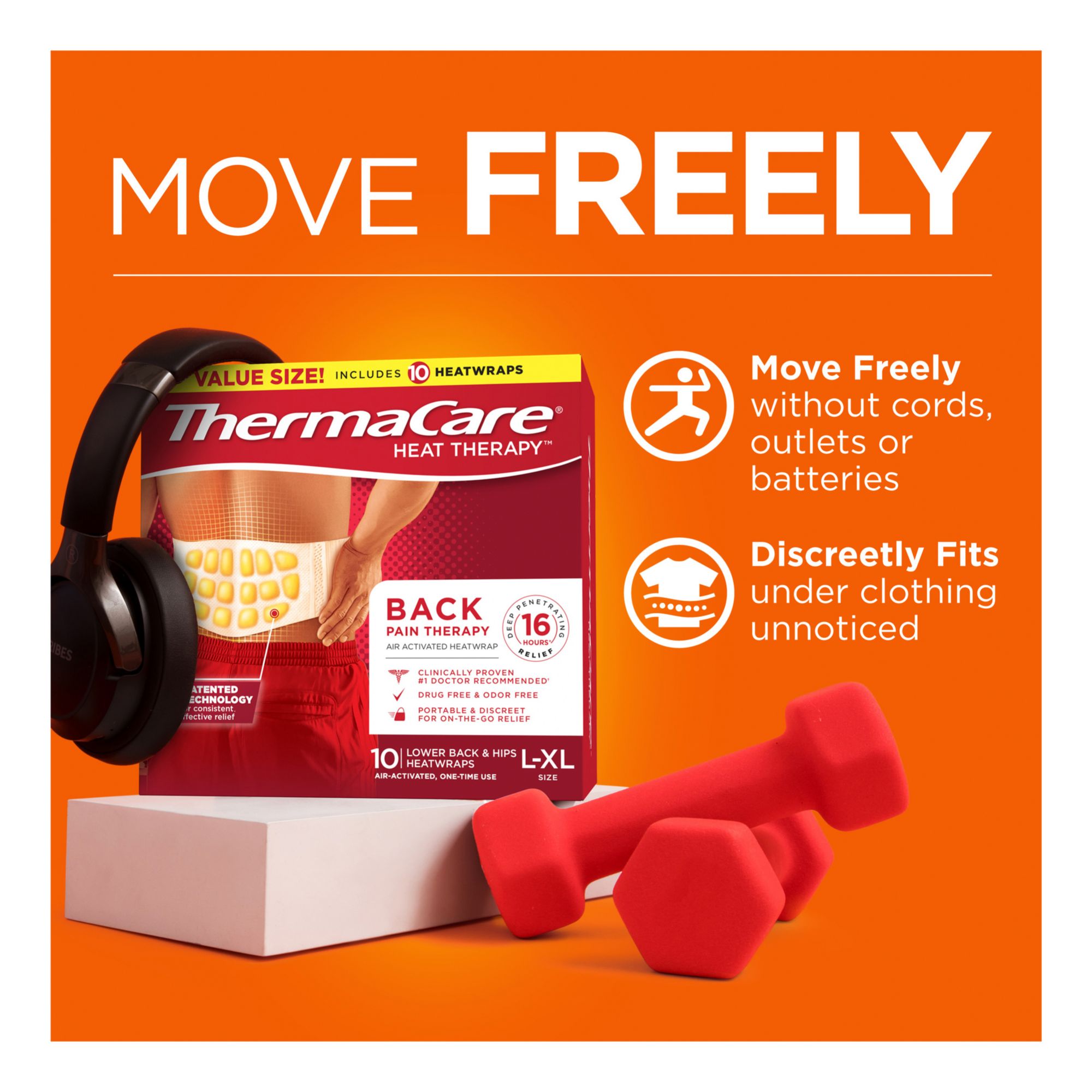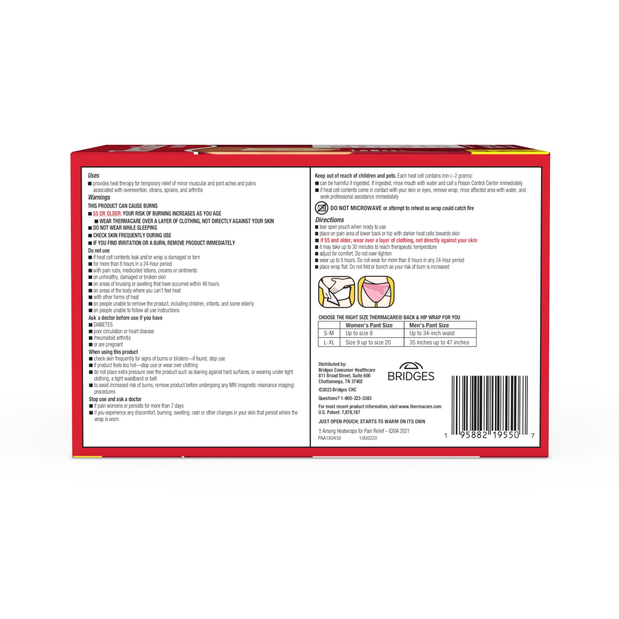 ThermaCare Lower Back & Hip HeatWraps are specially designed to fit your back and hip area so you can experience long-lasting heat relief throughout your day. Back pain is often caused by tight, injured or sore muscles. ThermaCare Lower Back & Hip HeatWraps deliver 8 hours of continuous, therapeutic heat and relieves pain for an additional 8 hours after you take it off. In fact, the American College of Physicians (ACP) recommends real heat as a first defense against acute lower back pain. These single-use wraps are designed to provide pain relief at home or on the go. ThermaCare has patented heat cells that penetrate deep to increase circulation to promote healing, while relieving pain for up to 16 hours. That’s eight hours of heat while you wear it, plus an additional eight hours of relief after you take if off. So you don't just feel better, you get better. ThermaCare HeatWraps deliver therapeutic healing exactly where you need it. Whether it's muscle or joint aches, strains, sprains or arthritis that's causing your pain, look to ThermaCare to find relief. Use as directed.