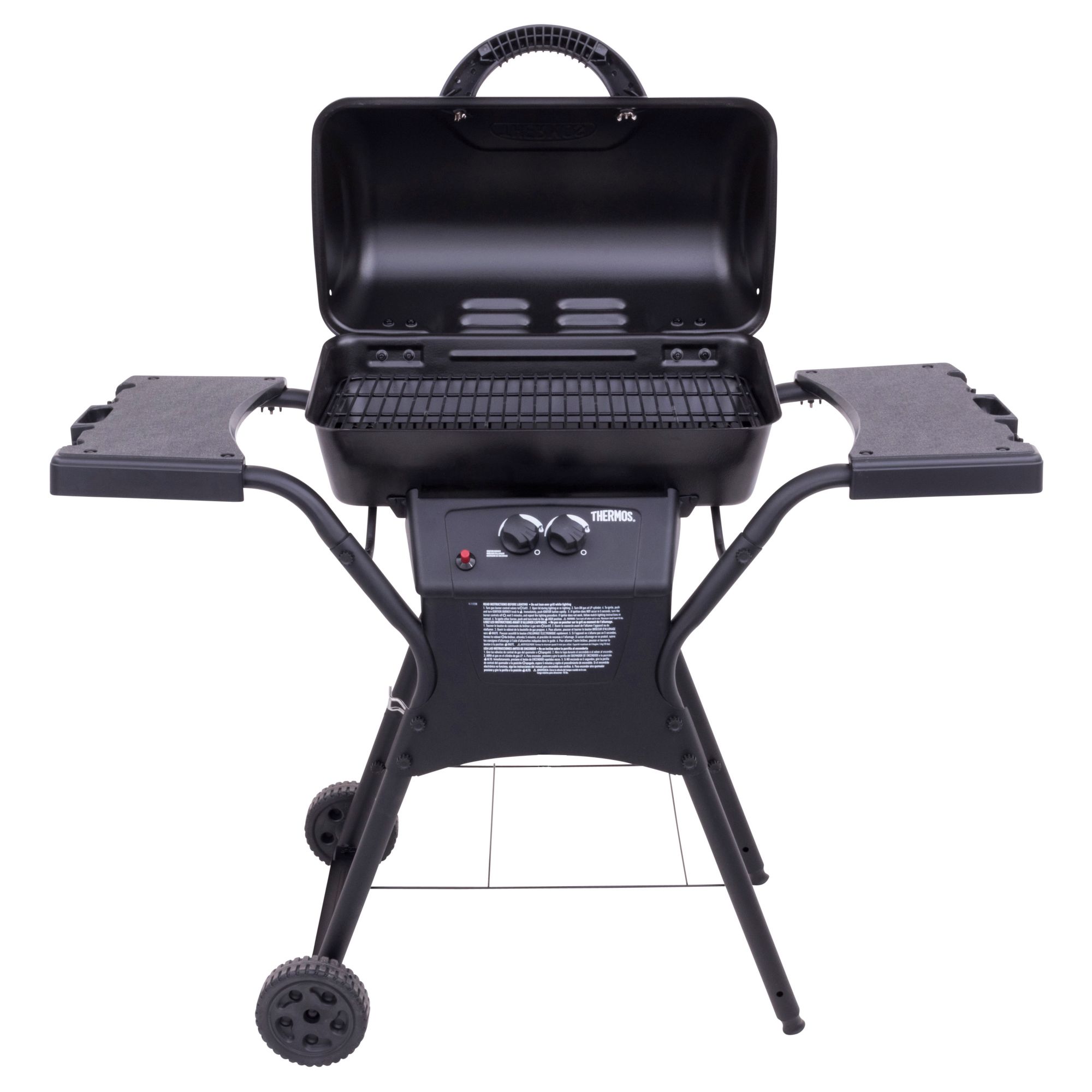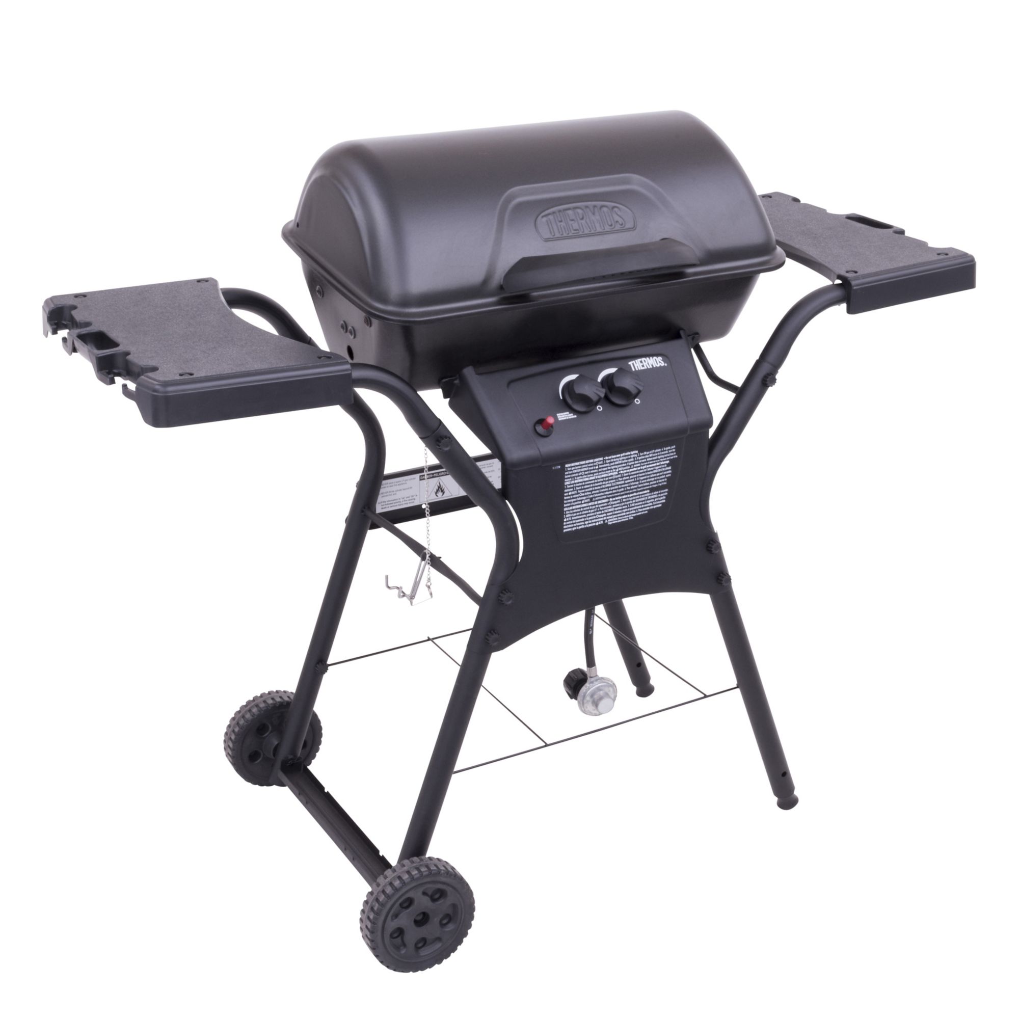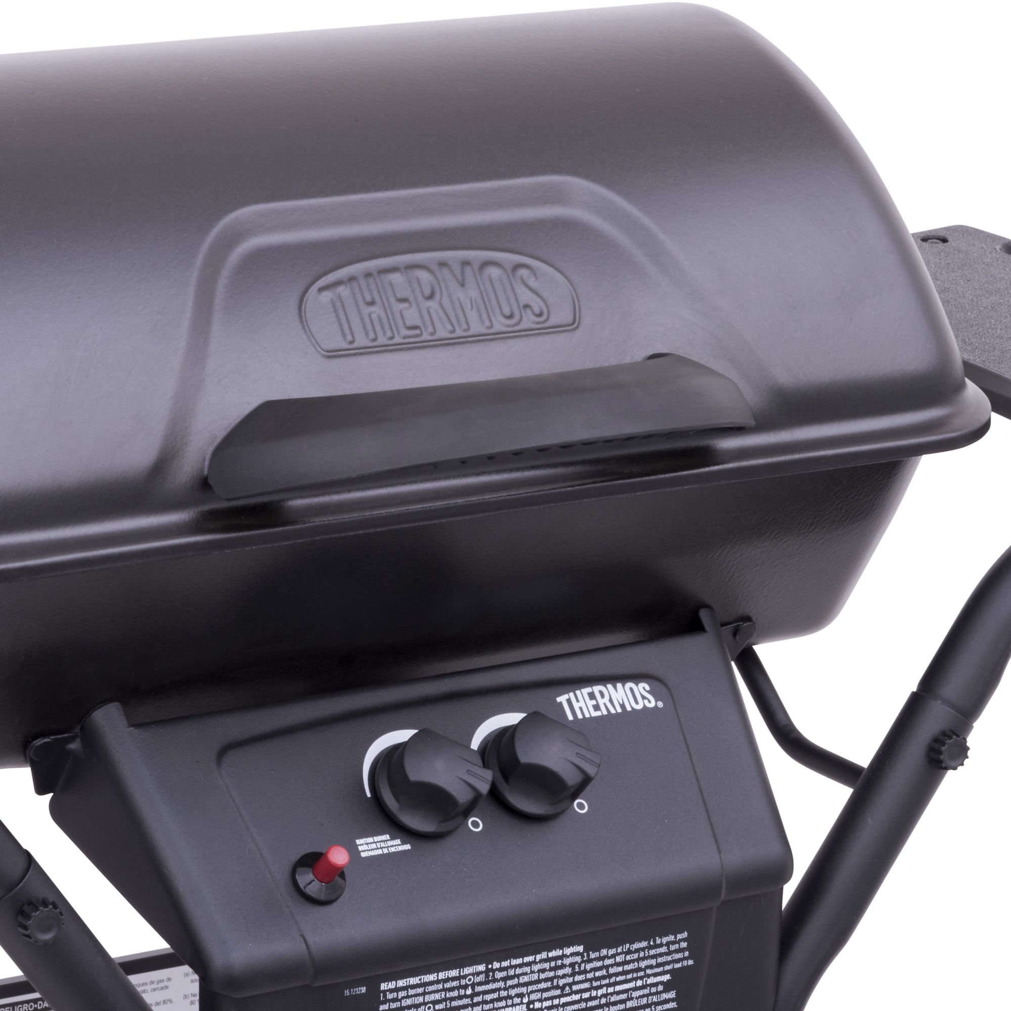 The Thermos 2-Burner Gas Grill features 26,500 BTU's of cooking power spread across 265-sq.-in. of cooking space. The stainless steel burners are rust-resistant and the porcelain-coated grates keep food from sticking and are easy to clean. Each grills is equipped with plastic side shelves, built-in tool hooks for storage, push button ignition, and porcelain-coated steel lid and firebox designed to withstand the elements.