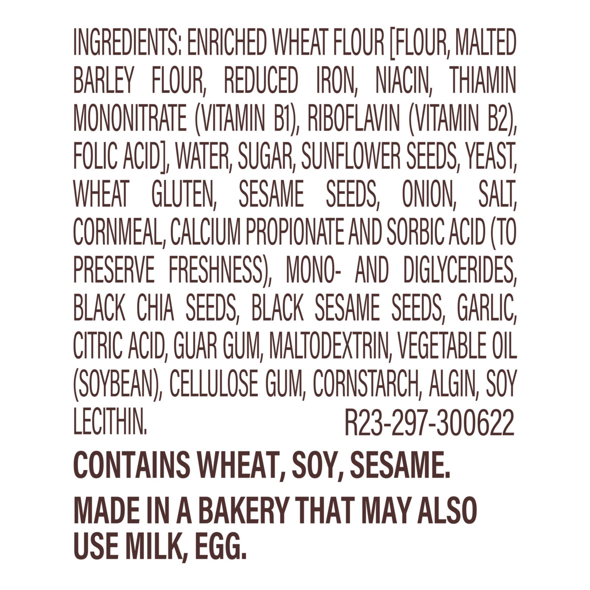 Ingredients: Enriched Wheat Flour [Flour, Malted Barley Flour, Reduced Iron, Niacin, Thiamin Mononitrate (Vitamin B1), Riboflavin (Vitamin B2), Folic Acid], Water, Sugar, Sunflower Seeds, Yeast, Wheat Gluten, Sesame Seeds, Onion, Salt, Cornmeal, Calcium Propionate and Sorbic Acid (To Preserve Freshness), Poppy Seeds, Mono-and Diglycerides, Garlic, Citric Acid, Guar Gum, Maltodextrin, Vegetable Oil (Soybean), Cellulose Gum, Cornstarch, Algin, Soy Lecithin.