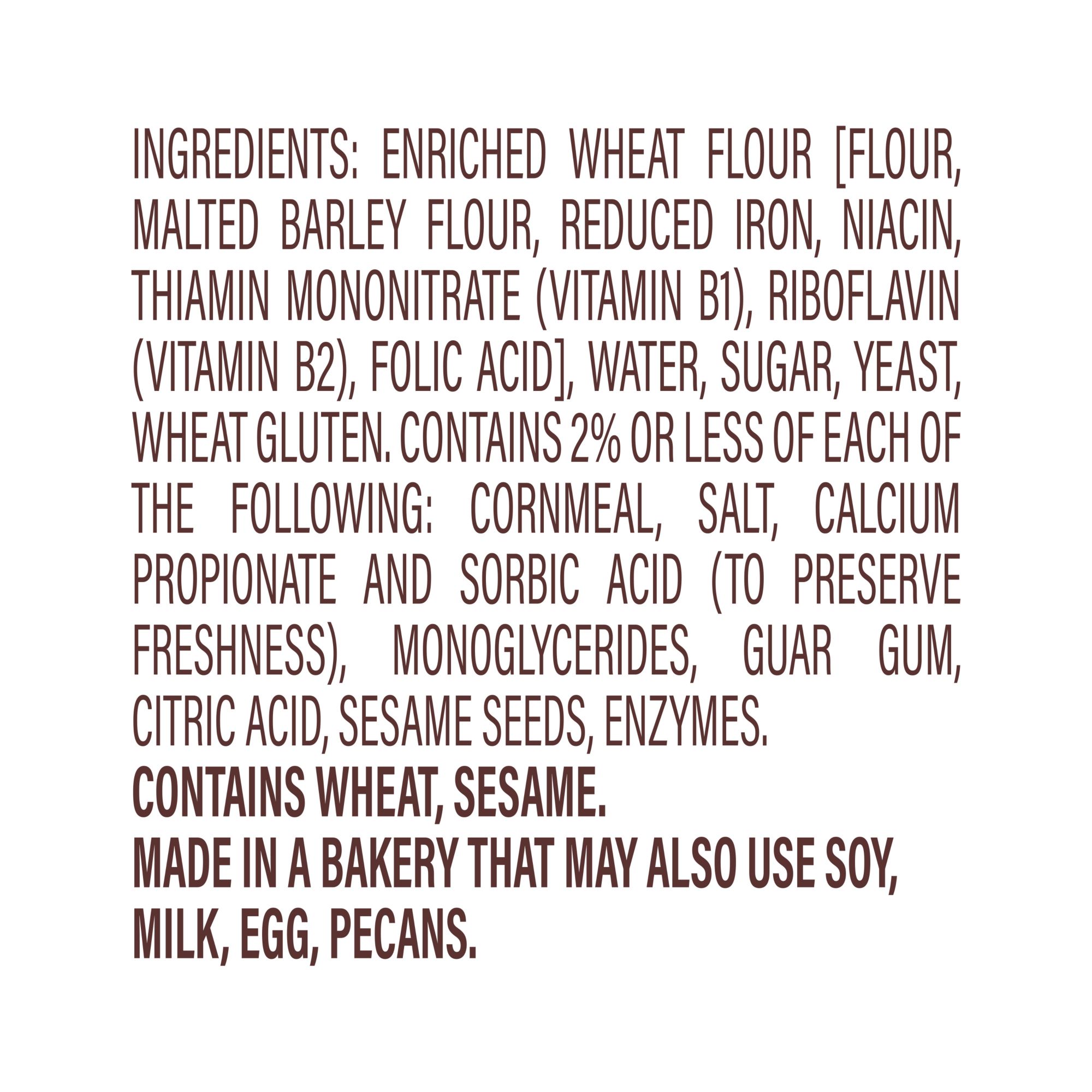 Ingredients: Enriched Wheat Flour [Flour, Reduced Iron, Niacin, Thiamin Mononitrate (Vitamin B1), Riboflavin (Vitamin B2), Folic Acid], Water, Sugar, Yeast, Wheat Gluten, Contains 2% Or Less Of Each Of The Following: [Salt, Calcium Propionate And Sorbic Acid (To Preserve Freshness), Monoglycerides, Cornmeal, Citric Acid, Guar Gum, Sesame Seeds, Enzymes].