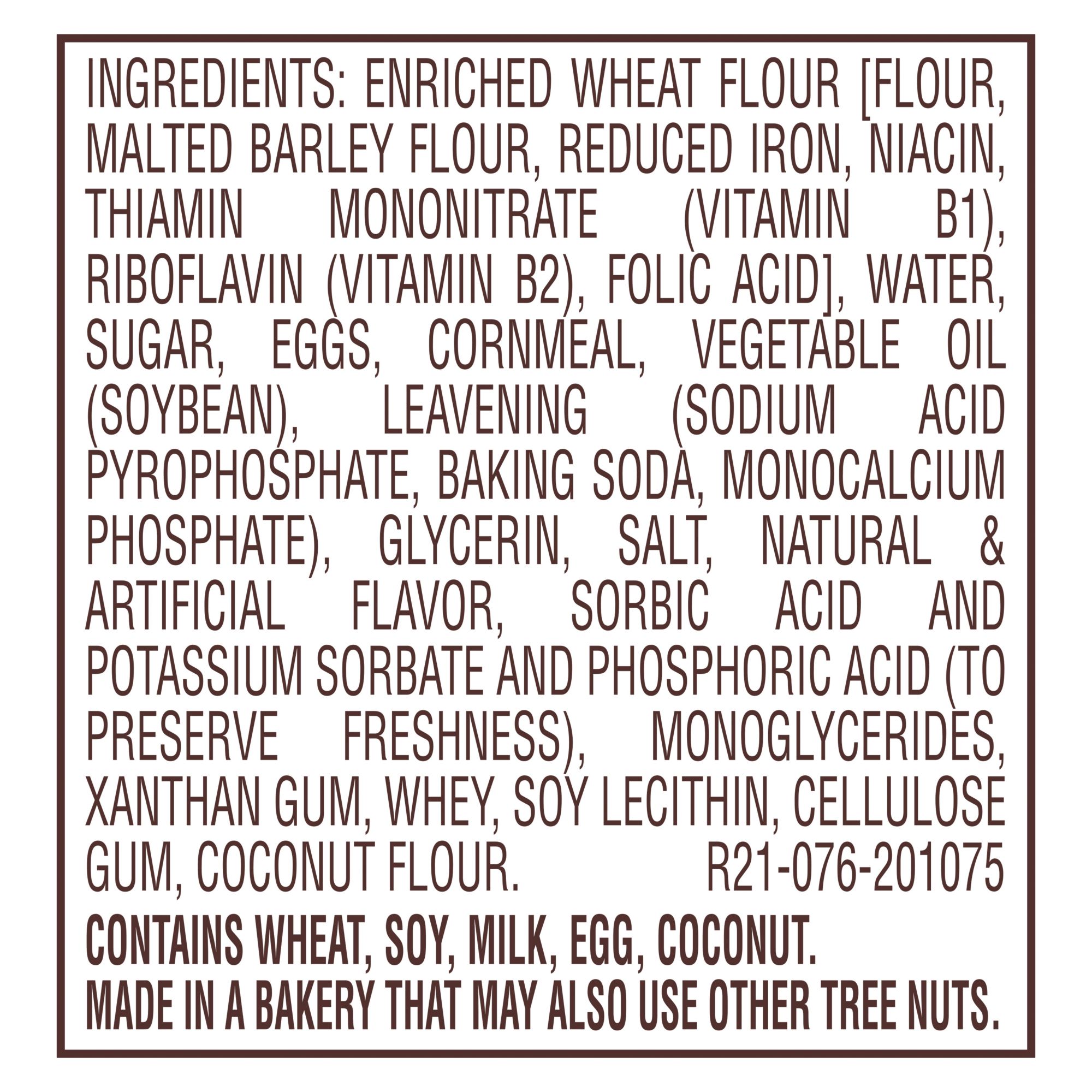 Ingredients: Enriched Wheat Flour [Flour, Malted Barley Flour, Reduced Iron, Niacin, Thiamin Mononitrate (Vitamin B1), Riboflavin (Vitamin B2), Folic Acid], Water, Sugar, Eggs, Cornmeal, Vegetable Oil (Soybean), Leavening [Sodium Acid Pyrophosphate, Baking Soda, Monocalcium Phosphate], Glycerin, Salt, Natural & Artificial Flavor, Sorbic Acid And [Potassium Sorbate And, Phosphoric Acid (To Preserve Freshness)], Monoglycerides, Xanthan Gum, Whey, Soy Lecithin, Cellulose Gum, Coconut Flour.